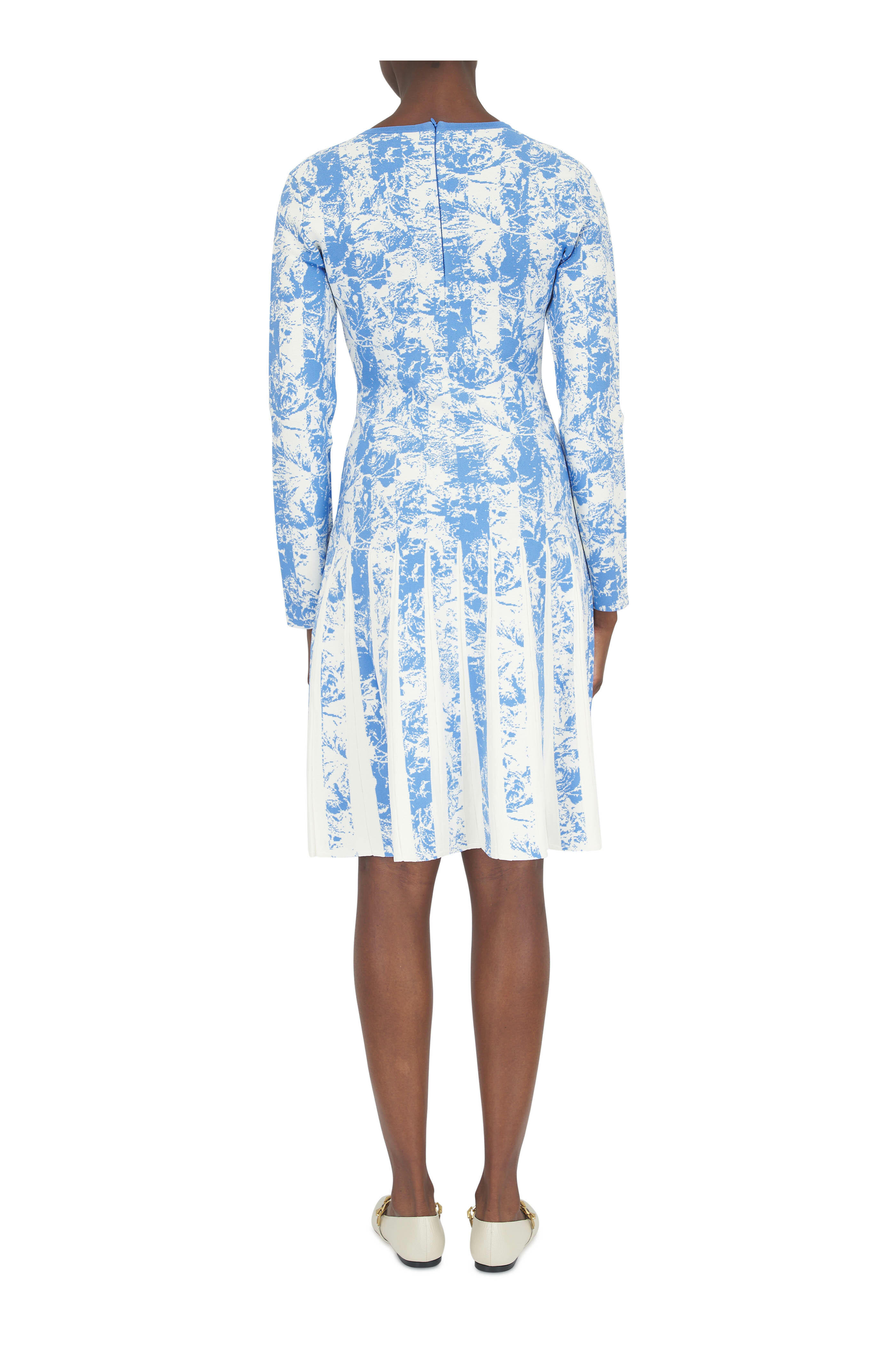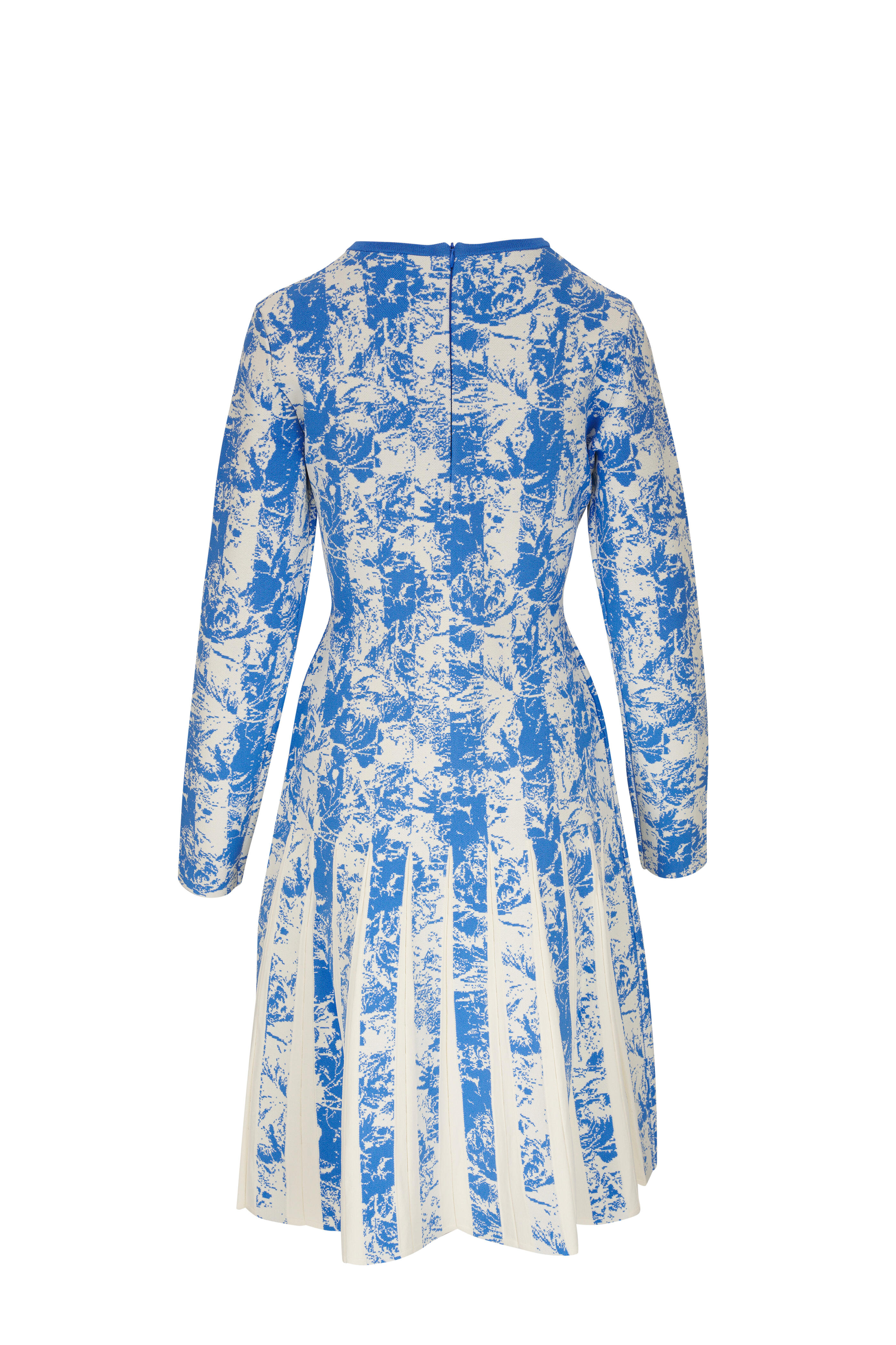 Crew neckline. Concealed back zip. Pleated skirt. Imported. 41" shoulder to hem. 83% viscose, 17% polyester. Dry clean.