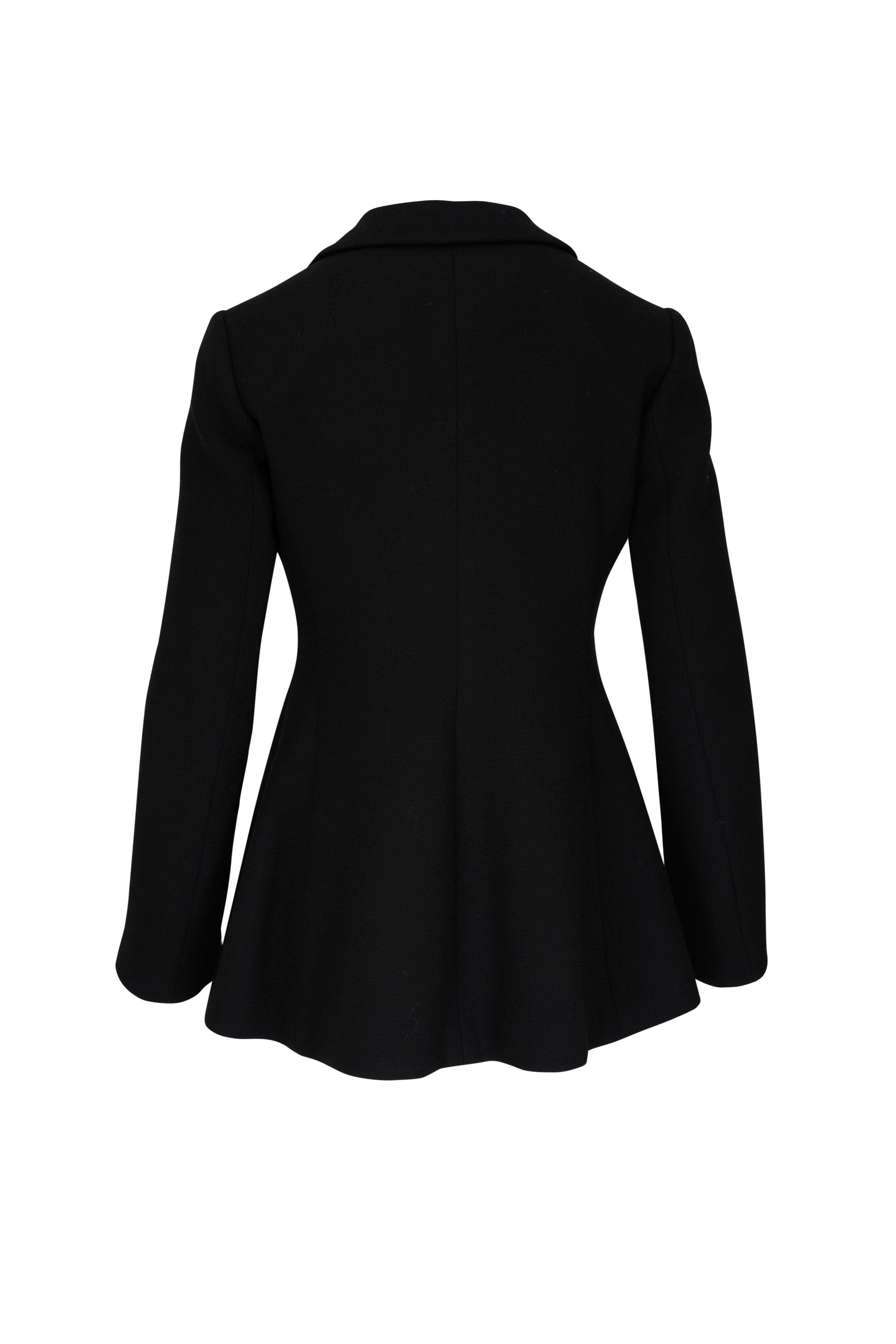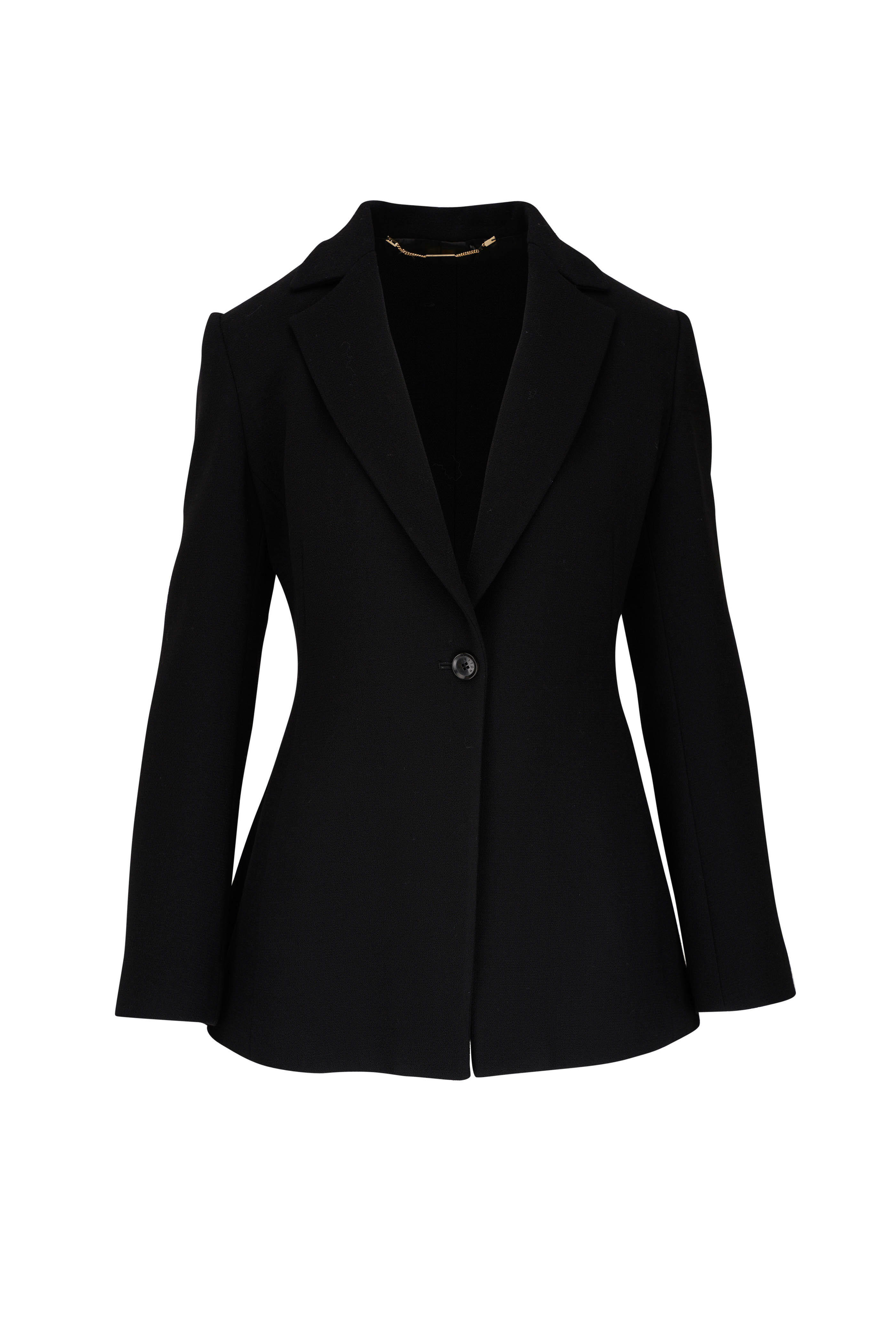 Notched lapels. Single button front closure. Side seam pockets. Made in Italy. 28" shoulder to hem. Tailored fit. 100% wool; fully lined. Dry clean.