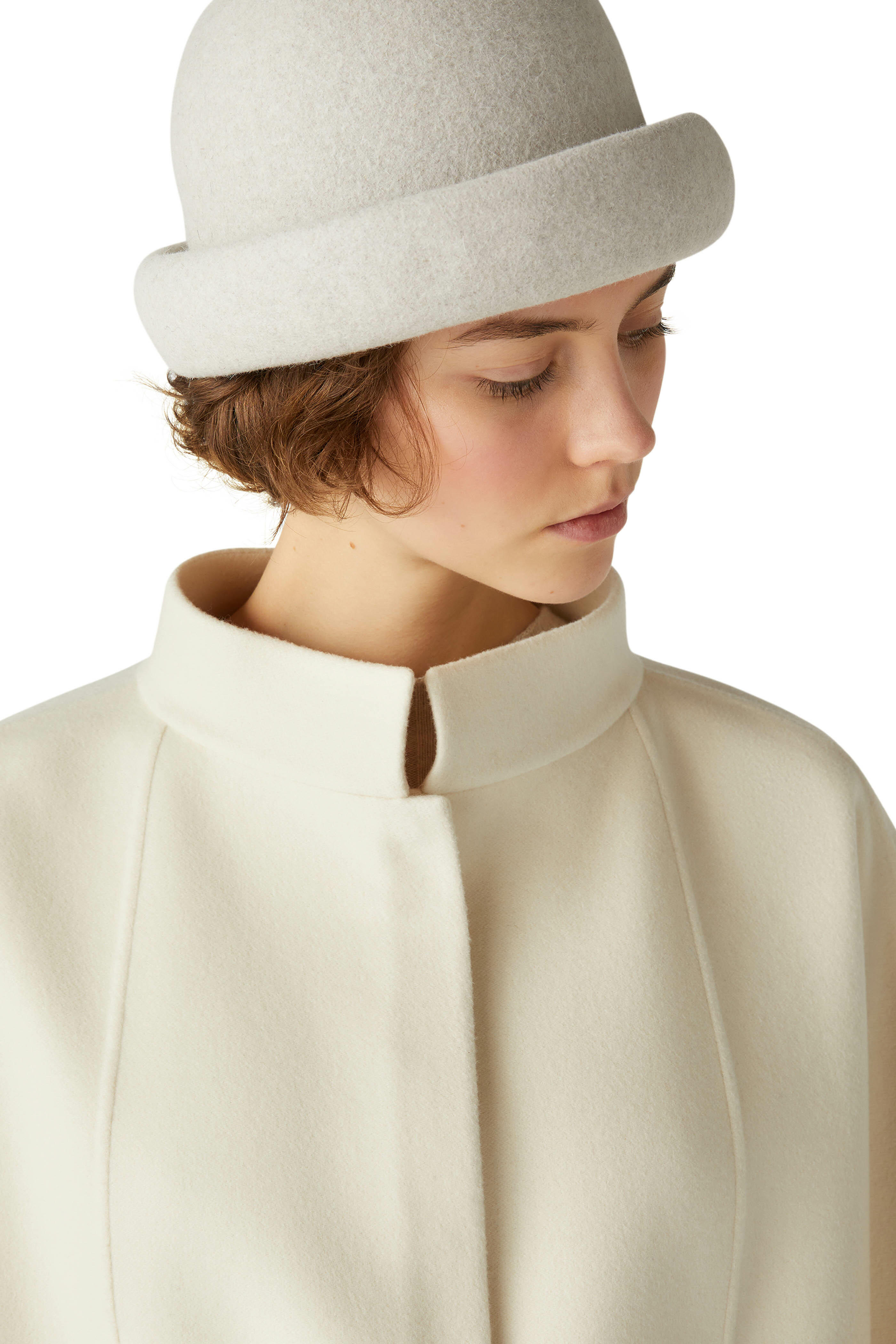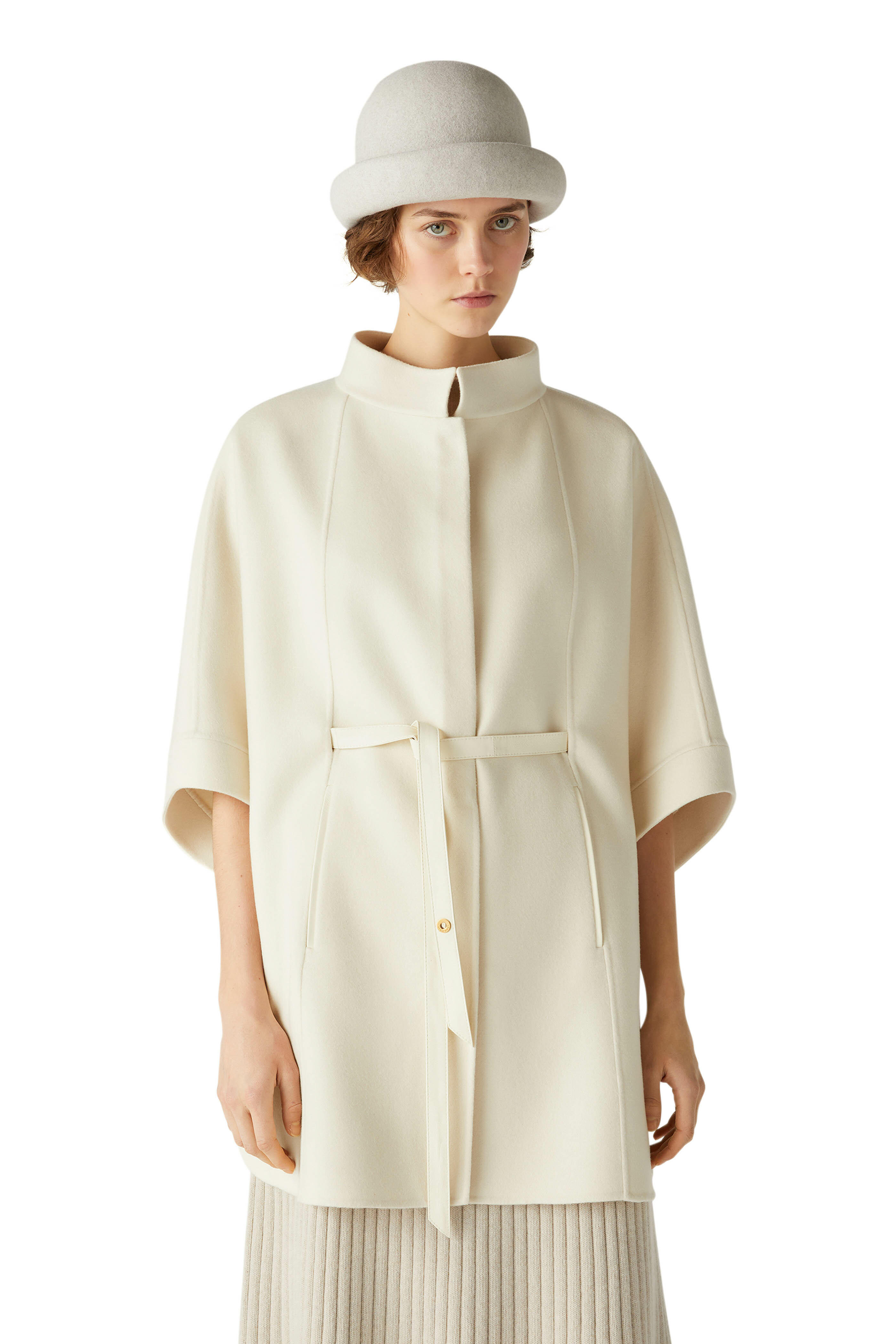 Stand collar. Front snap button p[lacket. Lower waist angled slit pockets. Side snap buttons. Mini on-seam slits for belt. Made in Italy. 100% cashmere; Belt: 100% leather. Dry clean.