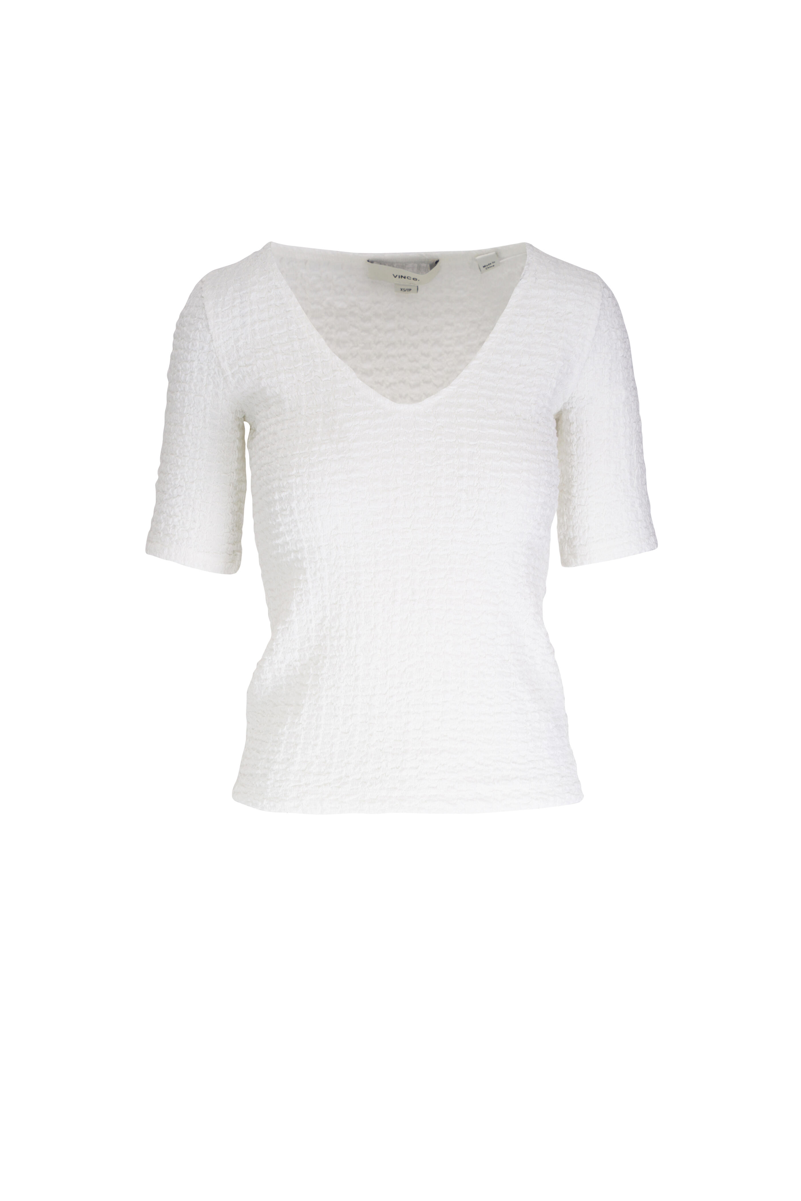 • Vince - Off White Smocked Elbow-Sleeve V-Neck Top