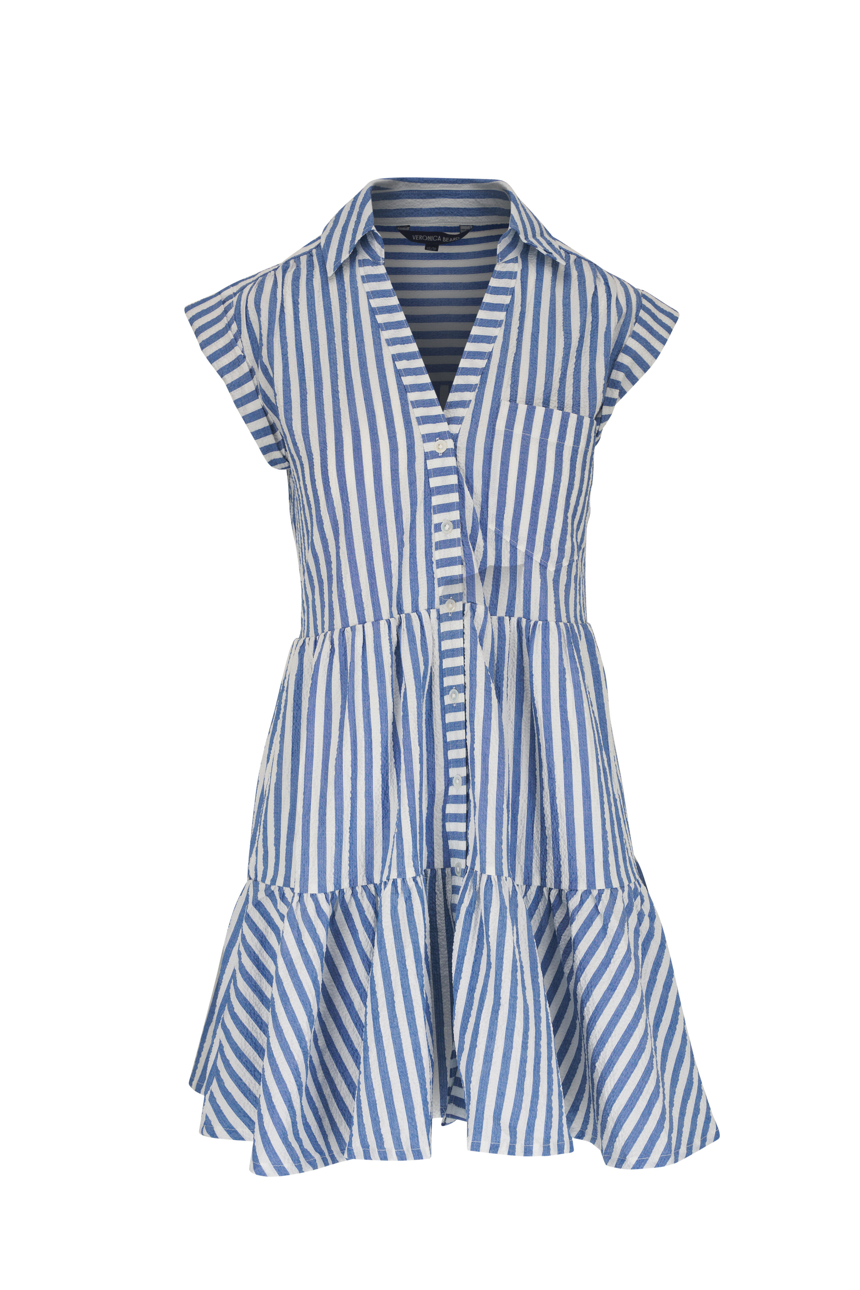 Spread collar. Front button placket. Cap sleeves. Chest patch pocket. Tiered skirt. Flounce hem. Imported. 34 ¾" shoulder to hem (size Small). 98% cotton 2% spandex. Dry clean.