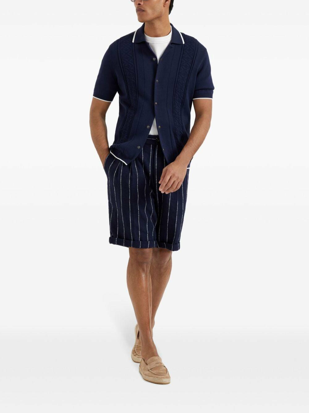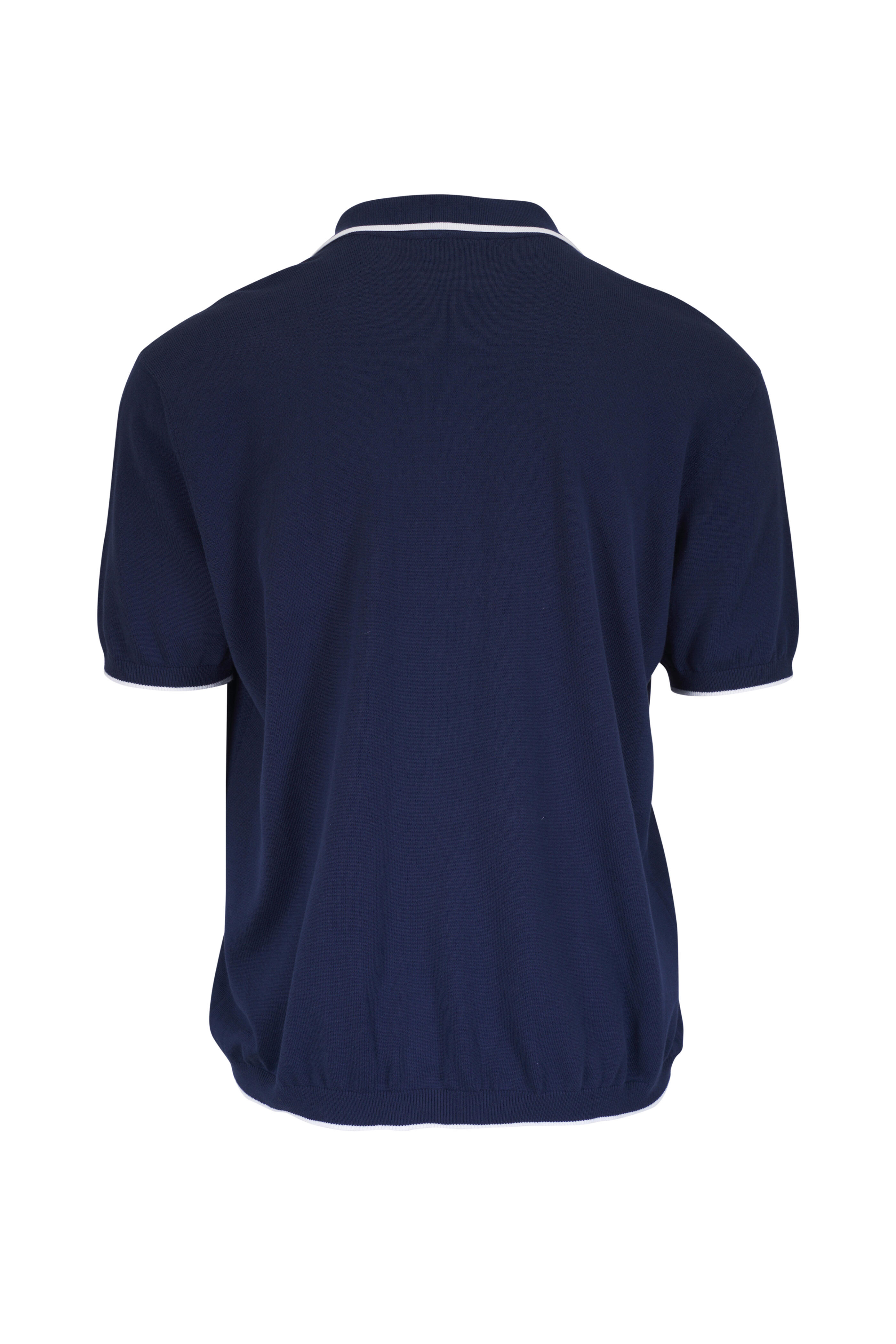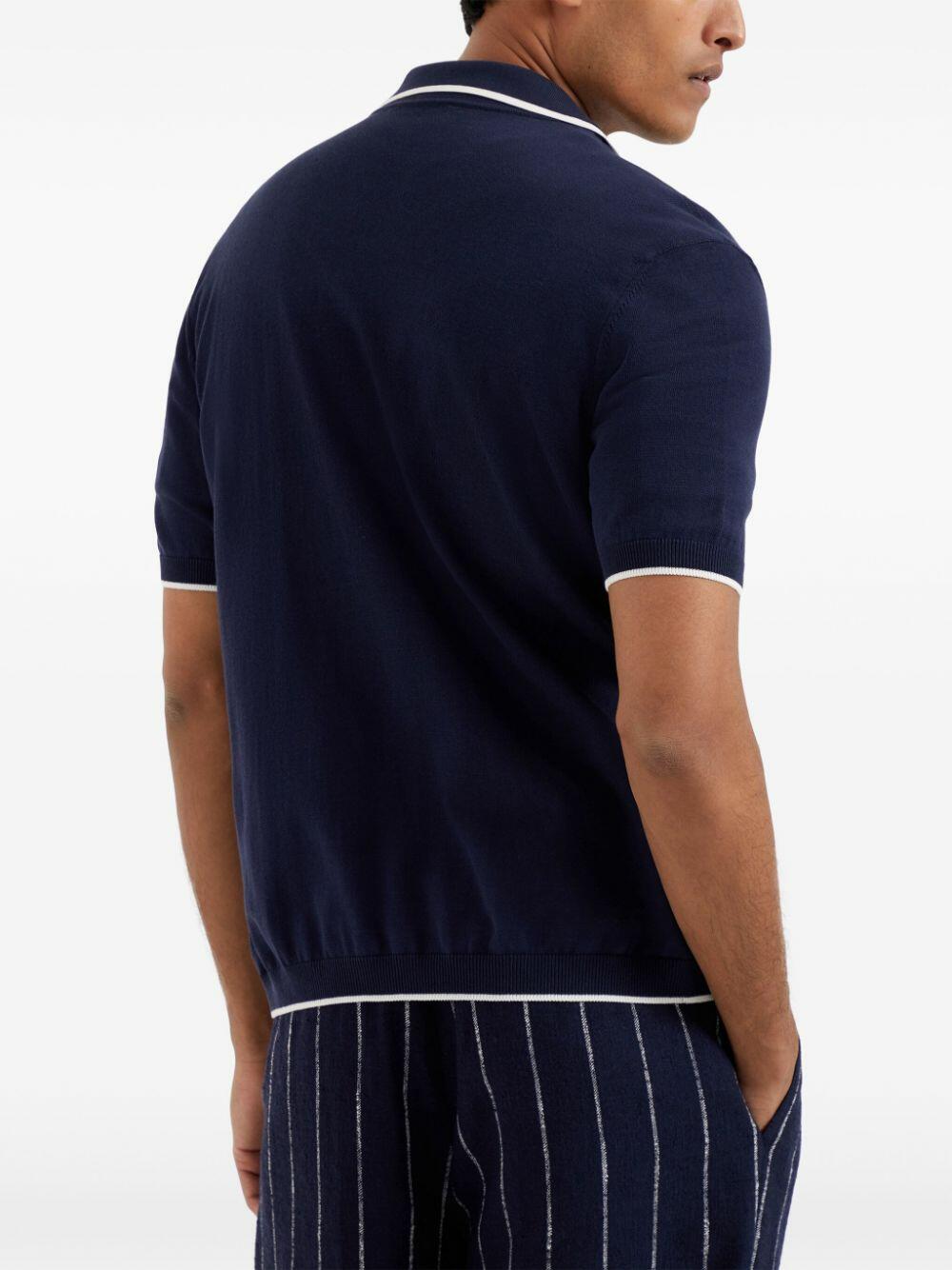 Camp collar; contrasting tipping. Front button placket. Ribbed cuffs. Made in Italy. 100% cotton. Hand wash.