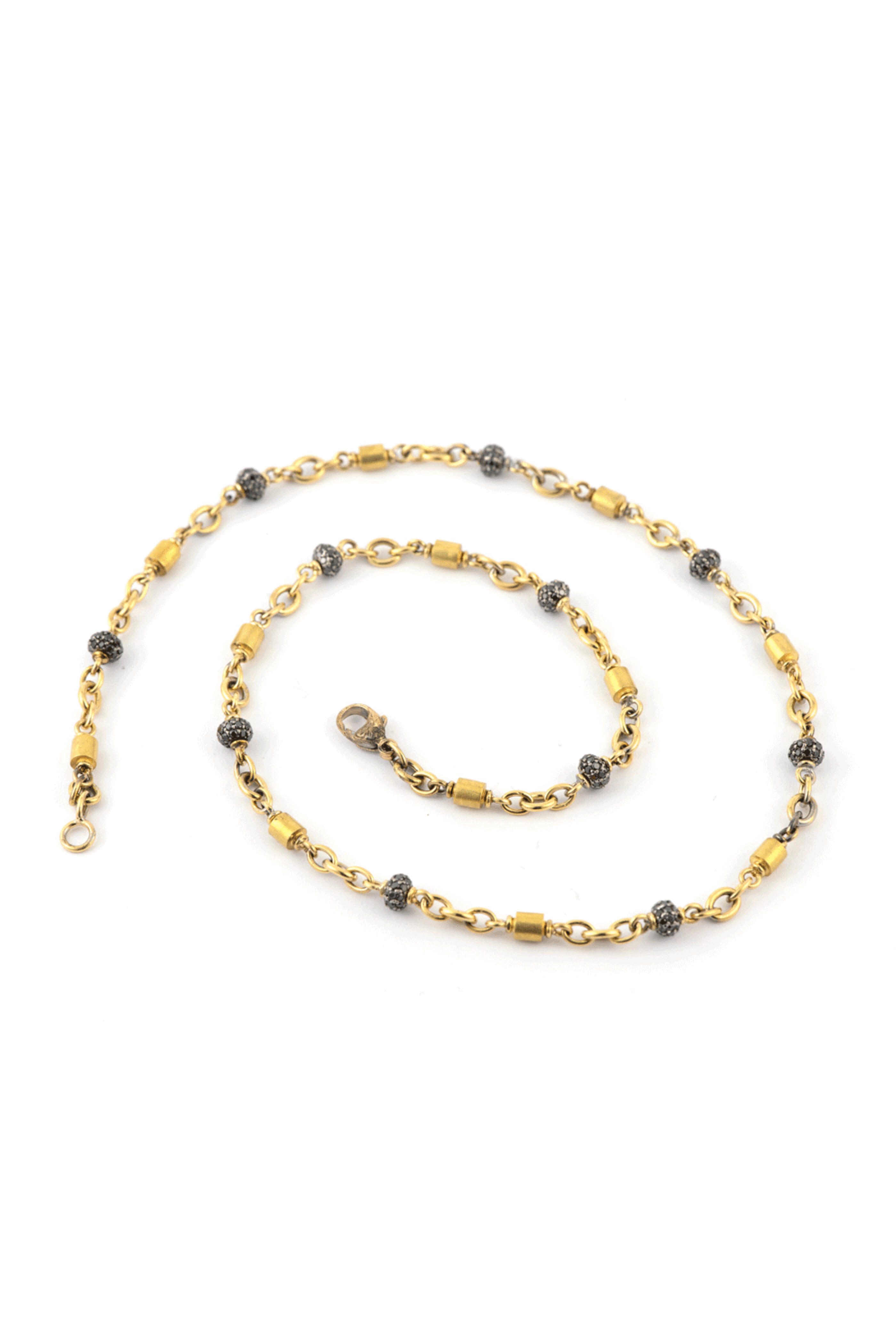 Sylva & Cie Black Diamond Bullet Necklace. 18k gold. Black diamond. Gold bullet beads. Beaded. Link chain. 18 L. Lobster claw clasps. Made in the USA.