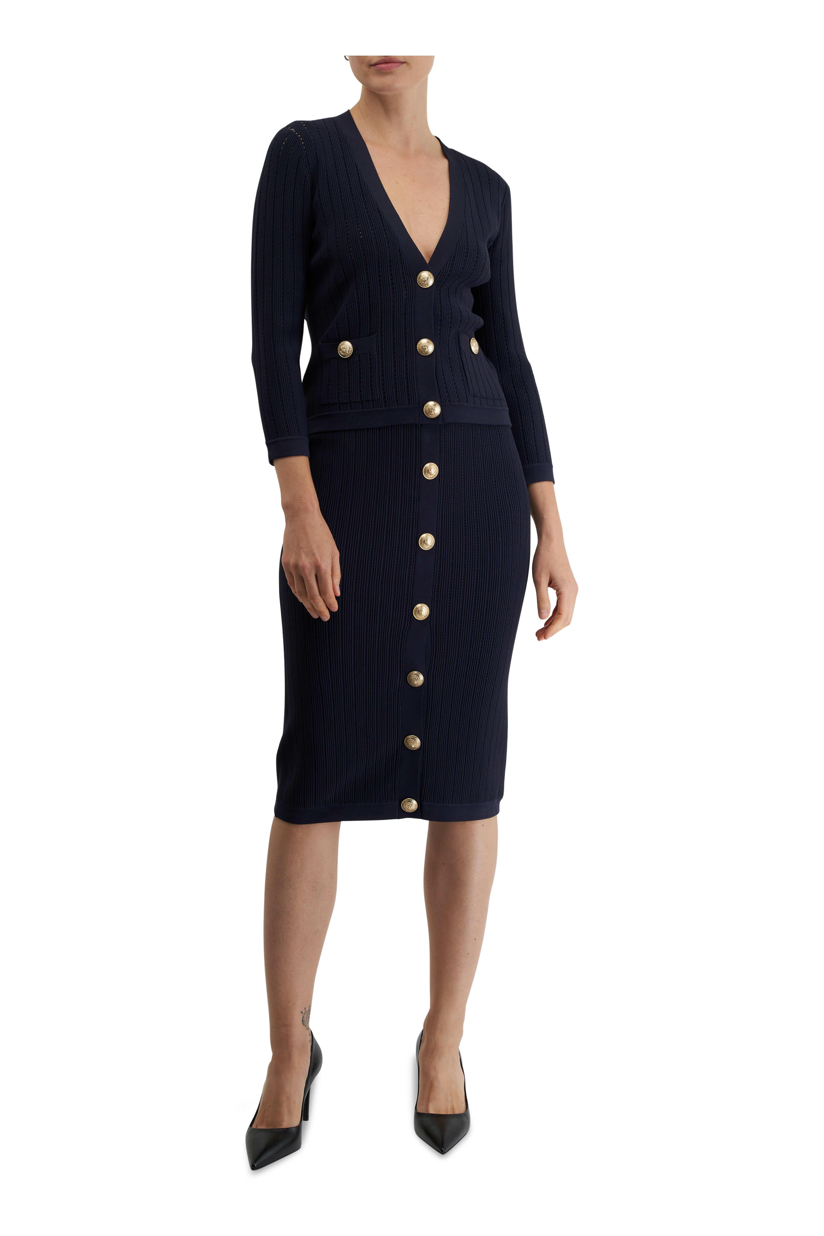 V-neckline. Front button placket. Lower waist patch pockets. Bracelet length sleeves. Imported. About 19.25" From Shoulder to Hem. Sleeve Length: 17.75". 60% rayon, 38% nylon, 2% spandex. Dry clean.
