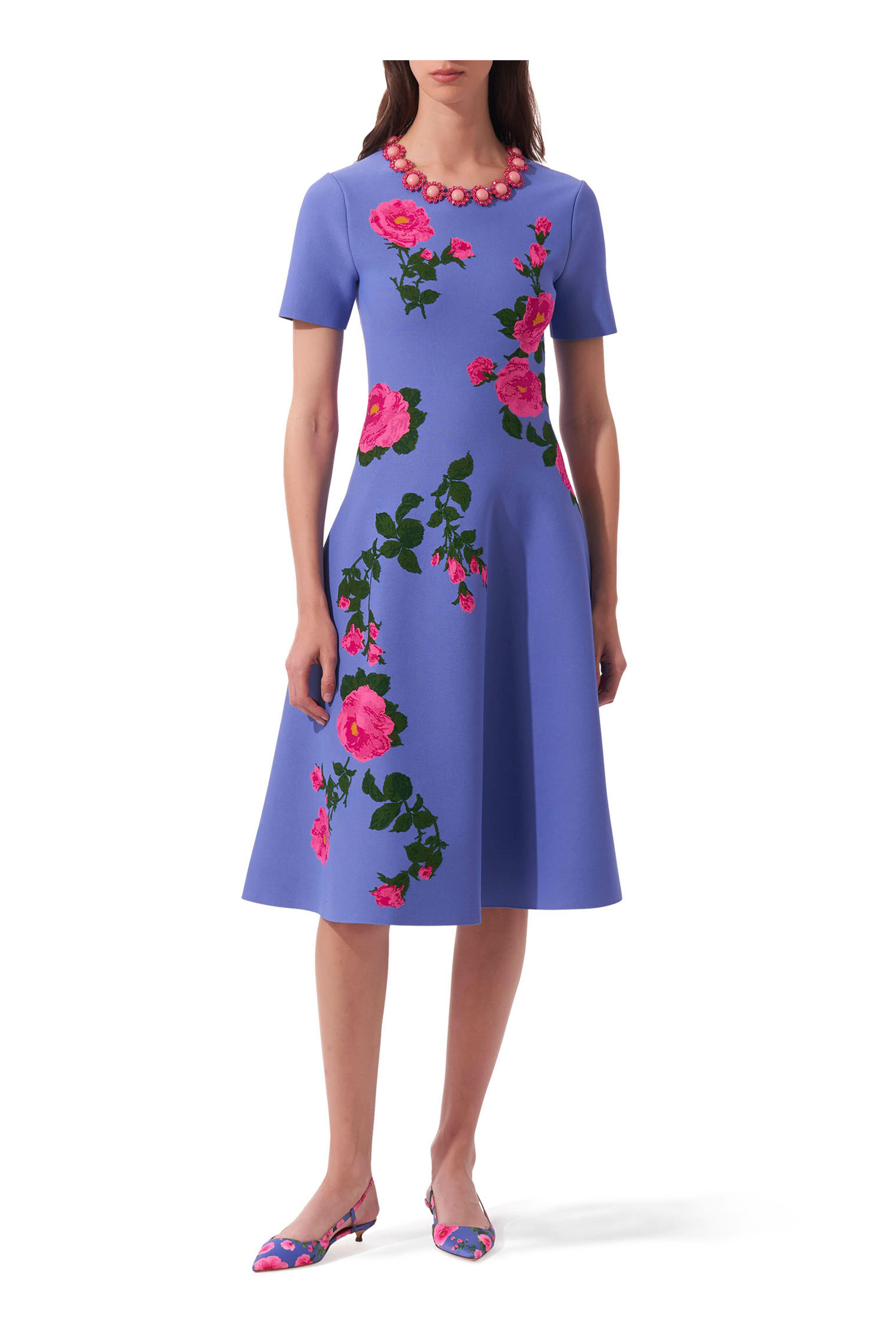 Round neckline. Concealed back zip. Flounce hem. Made in Italy. Shoulder to hem 42" (Measurement size S). 75% viscose, 15% polyester, 9% polyamide, 1% polyurethane. Dry clean.