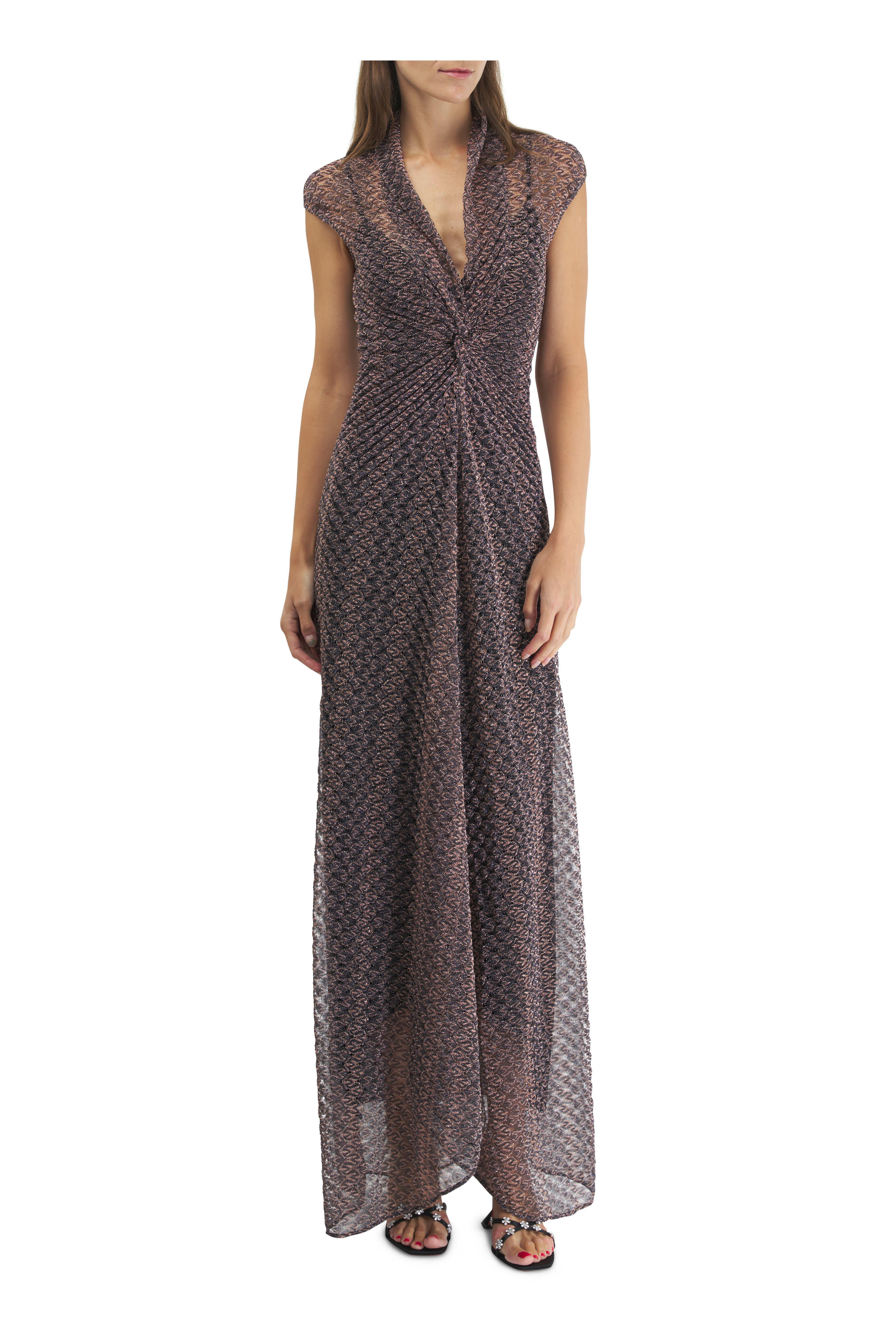 Deep v-neckline; knot detail. Slip over style. Removable slip. Semi sheer. Made in Italy. 52% metallized fiber, 48% nylon. Dry clean.