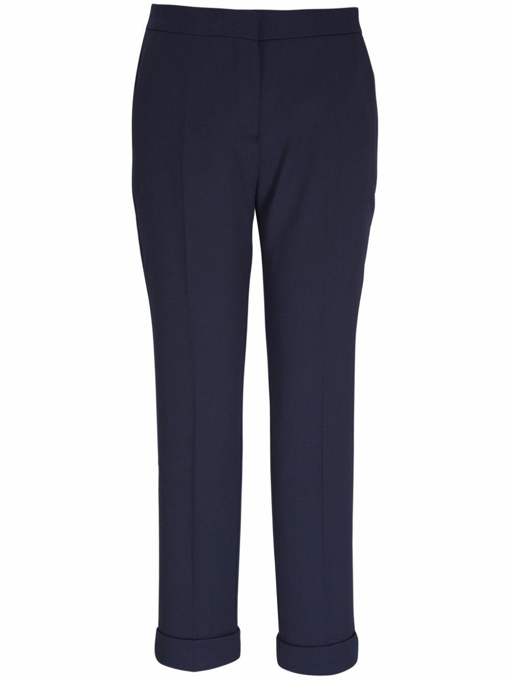 Zip fly with button tab. Front slash pockets; back besom pockets. Cuffed hem. Made in Italy. Inseam 27". 52% polyester, 44% lana wool, 4% elastane. Dry clean.