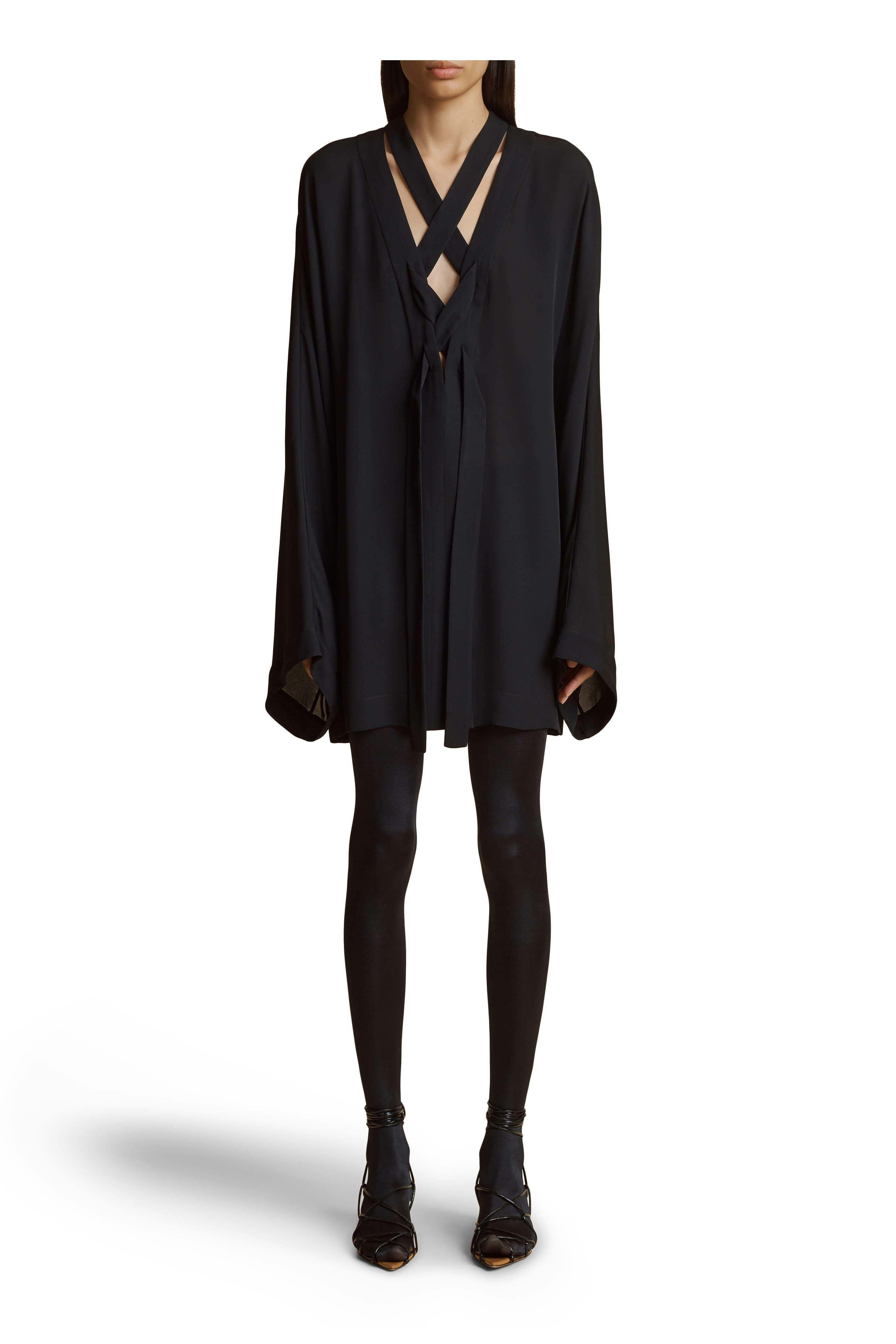 Unlined. V-neckline. Front lace up closure. Made in Italy. 33 ½" shoulder to hem. 78% cotton, 22% silk; Combo: 100% silk. Dry clean.