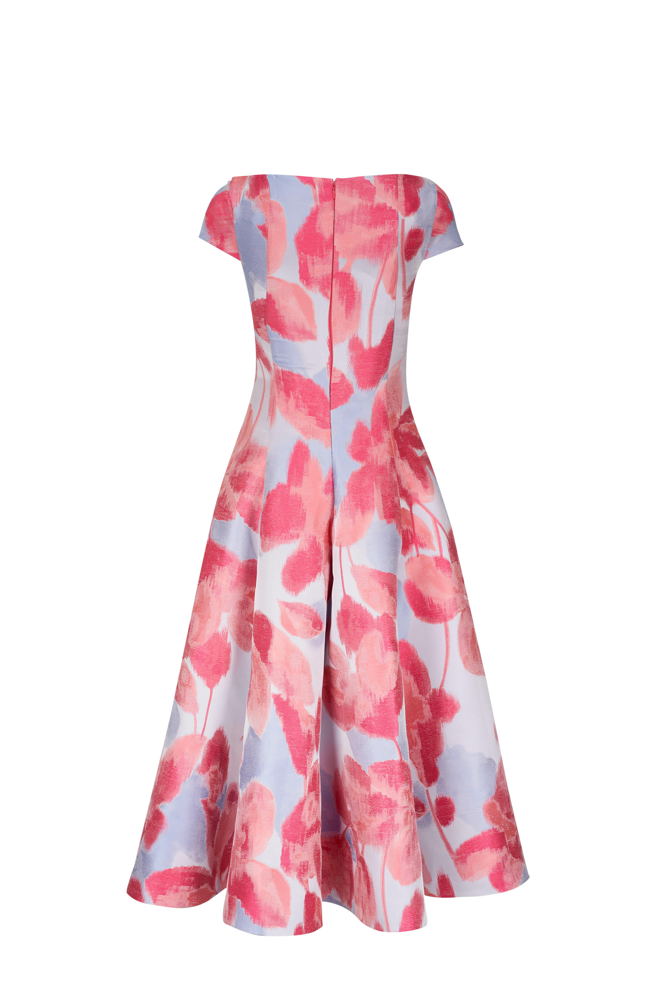 Crew neckline. Concealed back zip. Cap sleeves. Side seam pockets; velvet lined. Imported. About 50" shoulder to hem. Fit-&-flare silhouette. 100% polyester; fully lined. Dry clean.