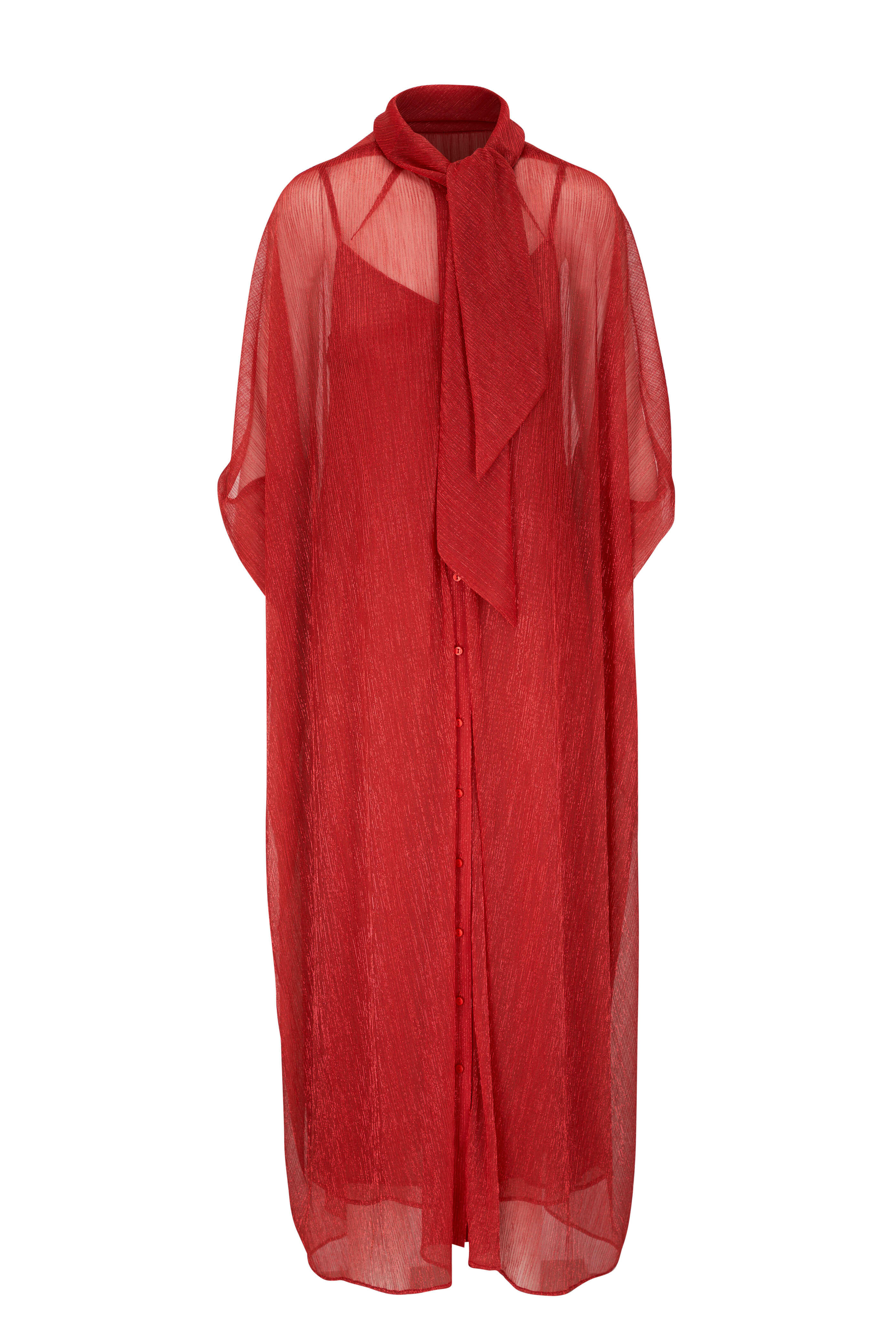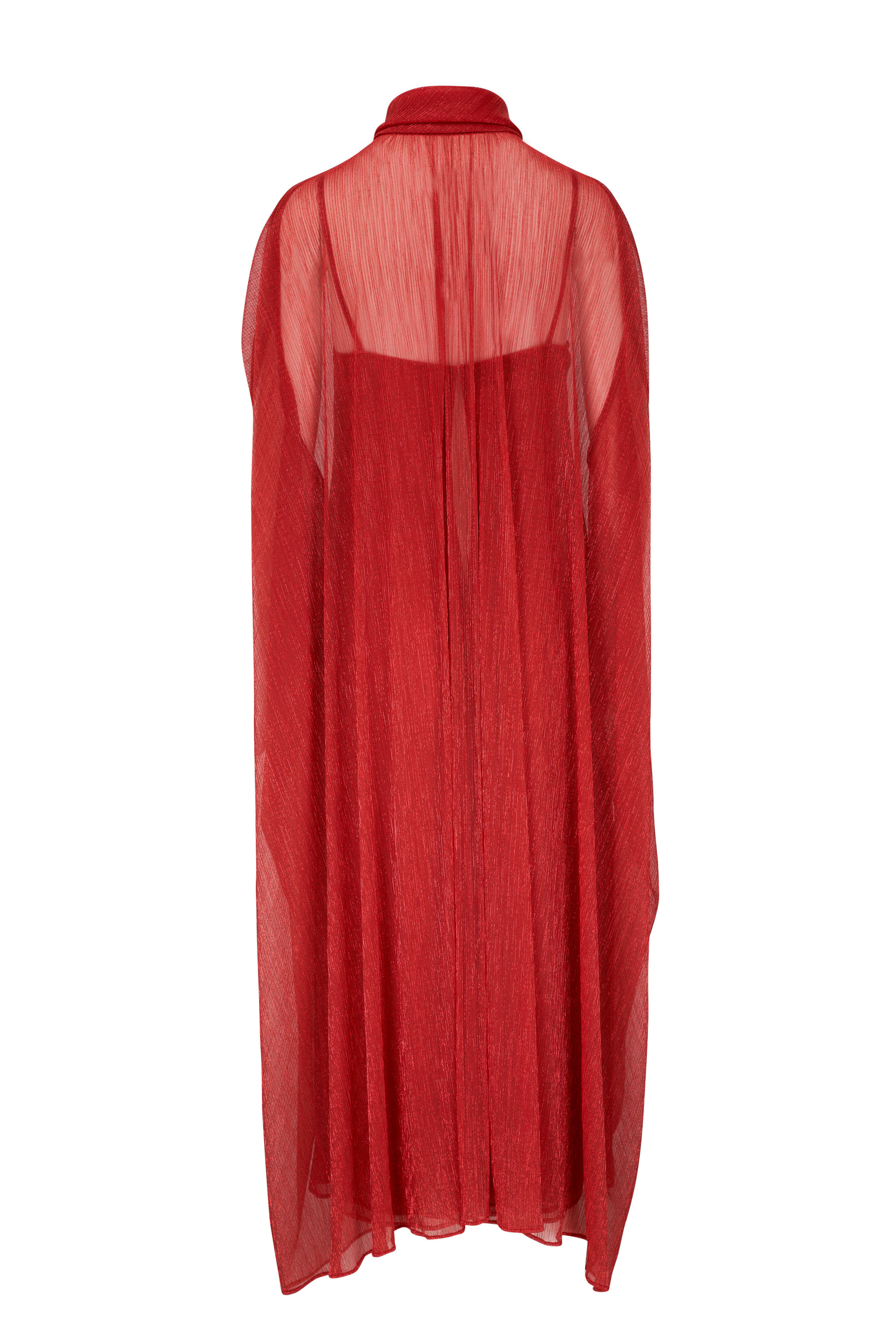 Mock neckline; self-tie neck. Back button placket. Cape-like sleeves. Slip dress included. Imported. Loose fit. 55" shoulder to hem. 55% polyester, 45% metallized fibers. Dry clean.