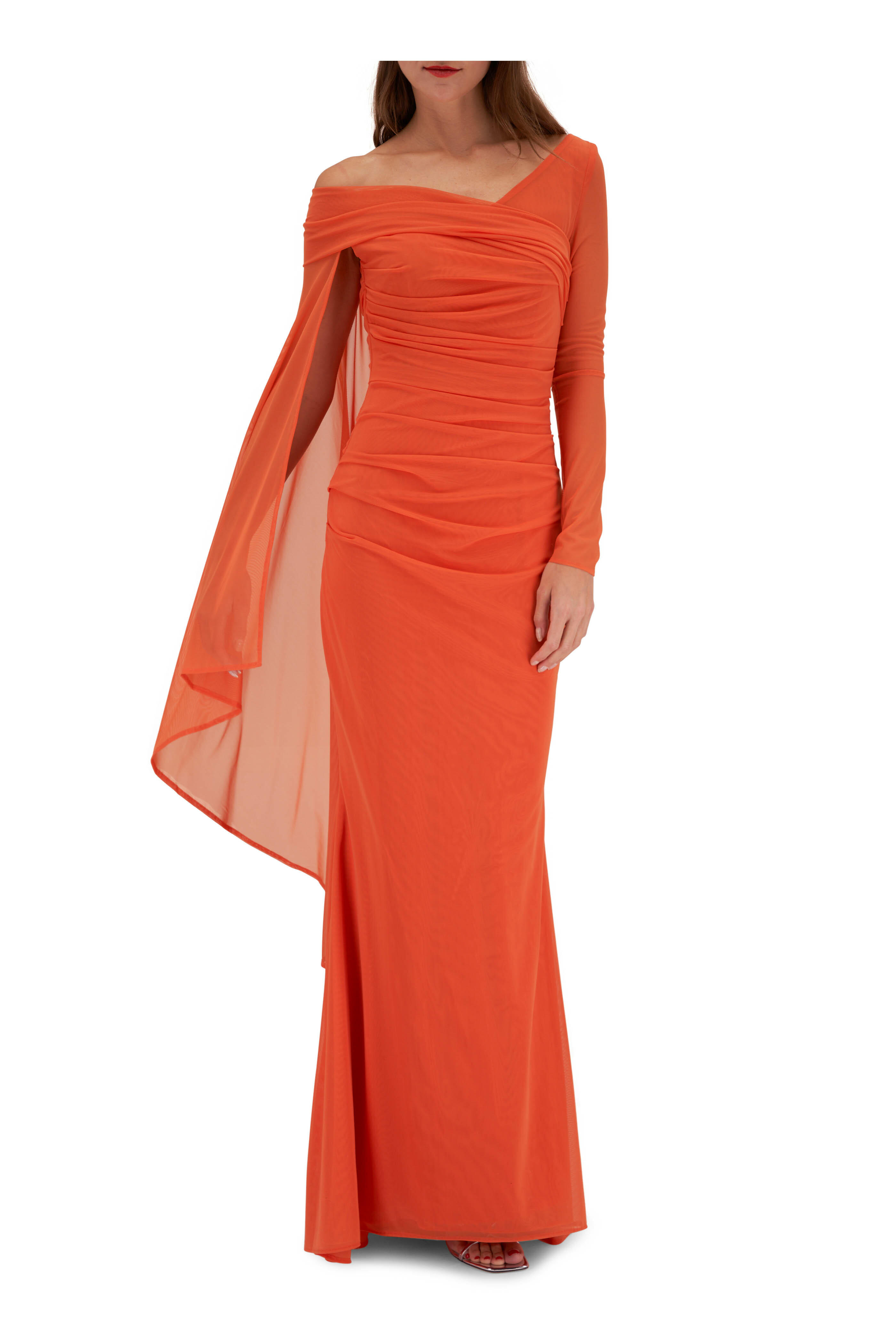 Fully lined. Off-the-shoulder neckline. Concealed back zip. One shoulder long sleeve. Back asymmetric cape. Side ruching details. Made in Germany. Approx. 58" shoulder to hem. 89% polyamide, 11% elastane. Dry clean.