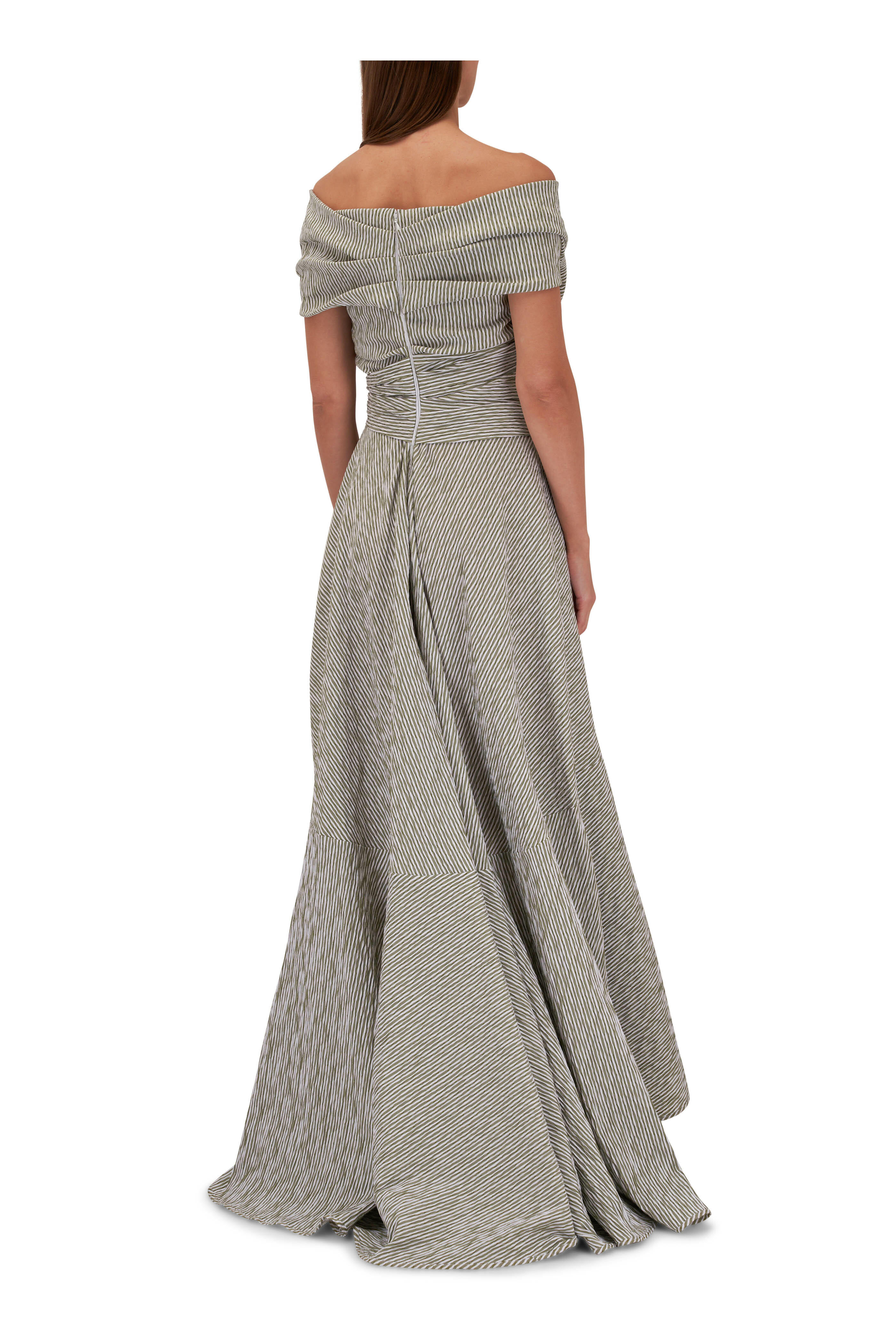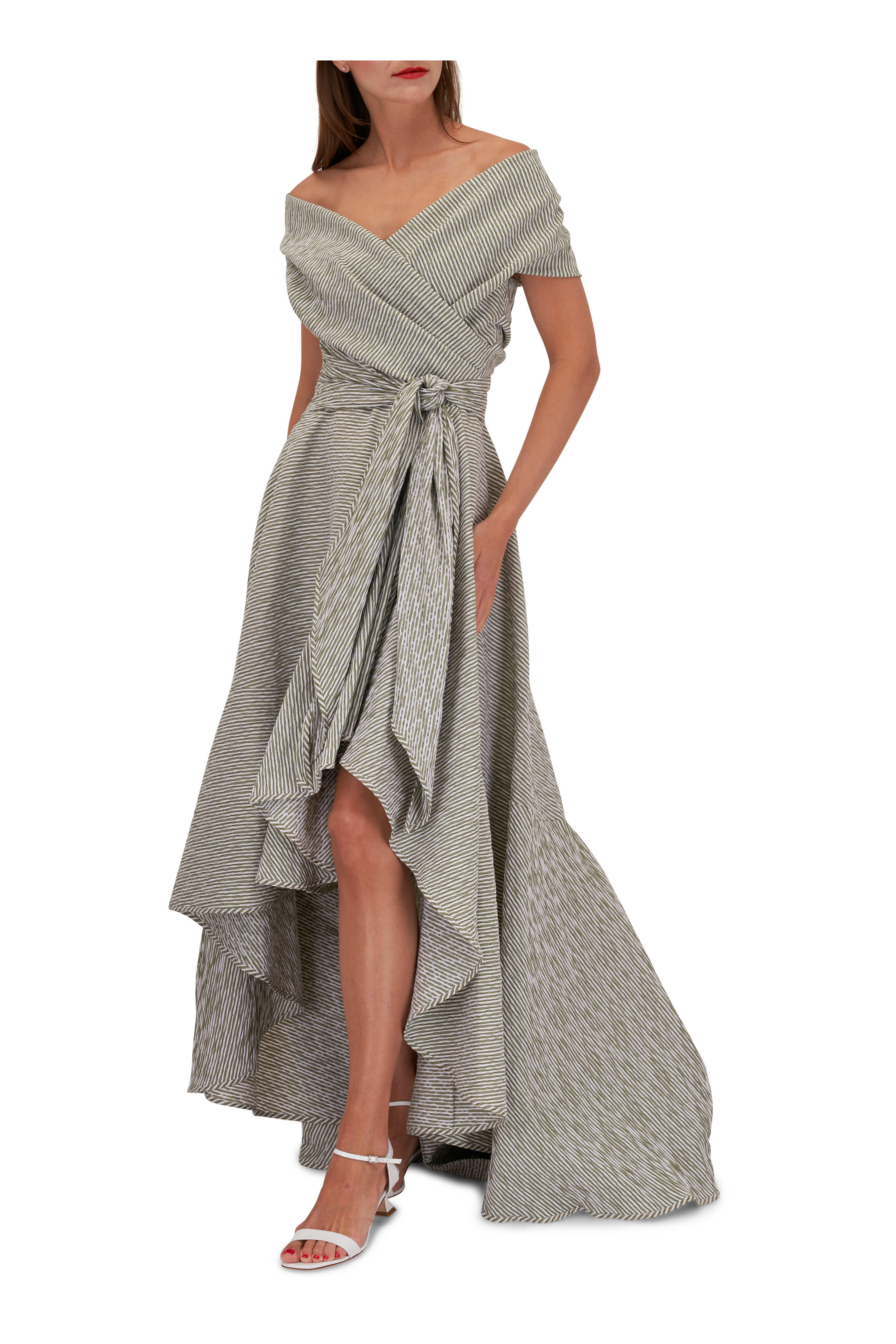 Surplice off-the-shoulder neckline. Concealed back zip. Self-tie waist. High-low hem. Made in Germany. 43" shortest, 58" longest shoulder to hem. 44% polyester, 28% cotton, 24% polyamide, 4% elastane. Dry clean.