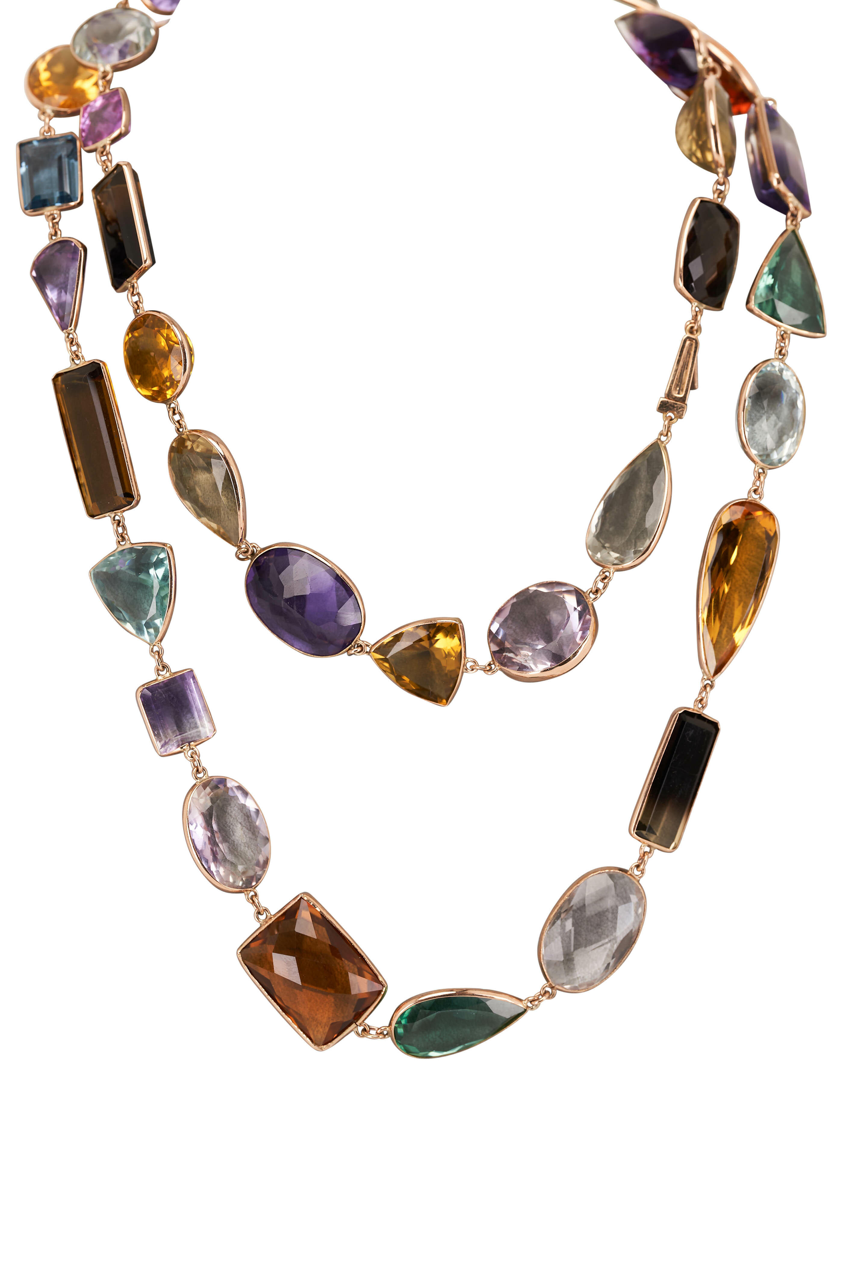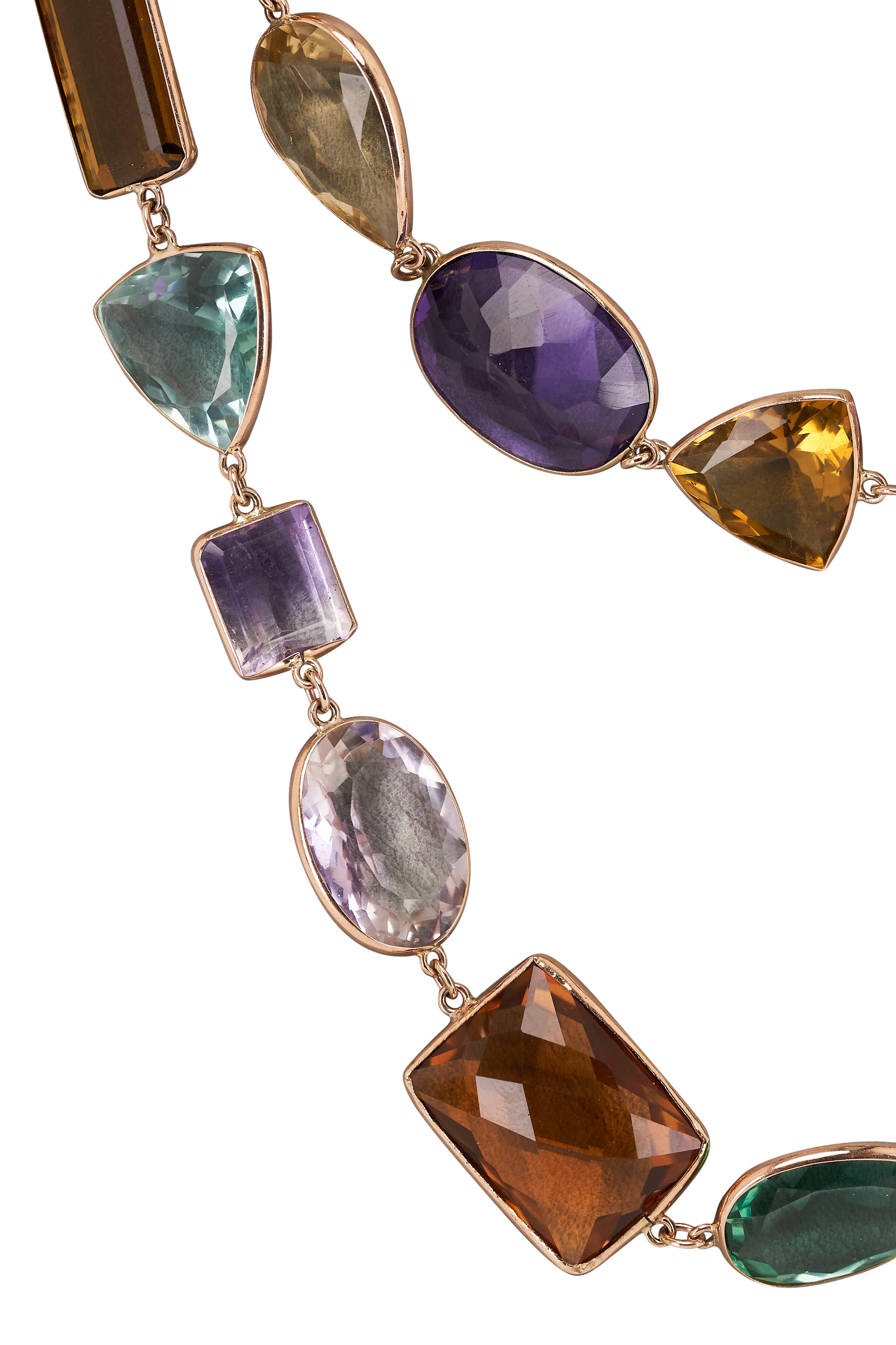 14K Yellow Gold. Amethyst, Topaz, Citrine, Tourmaline: 165.71 Total Carat Weight. Measures: 36" Long.