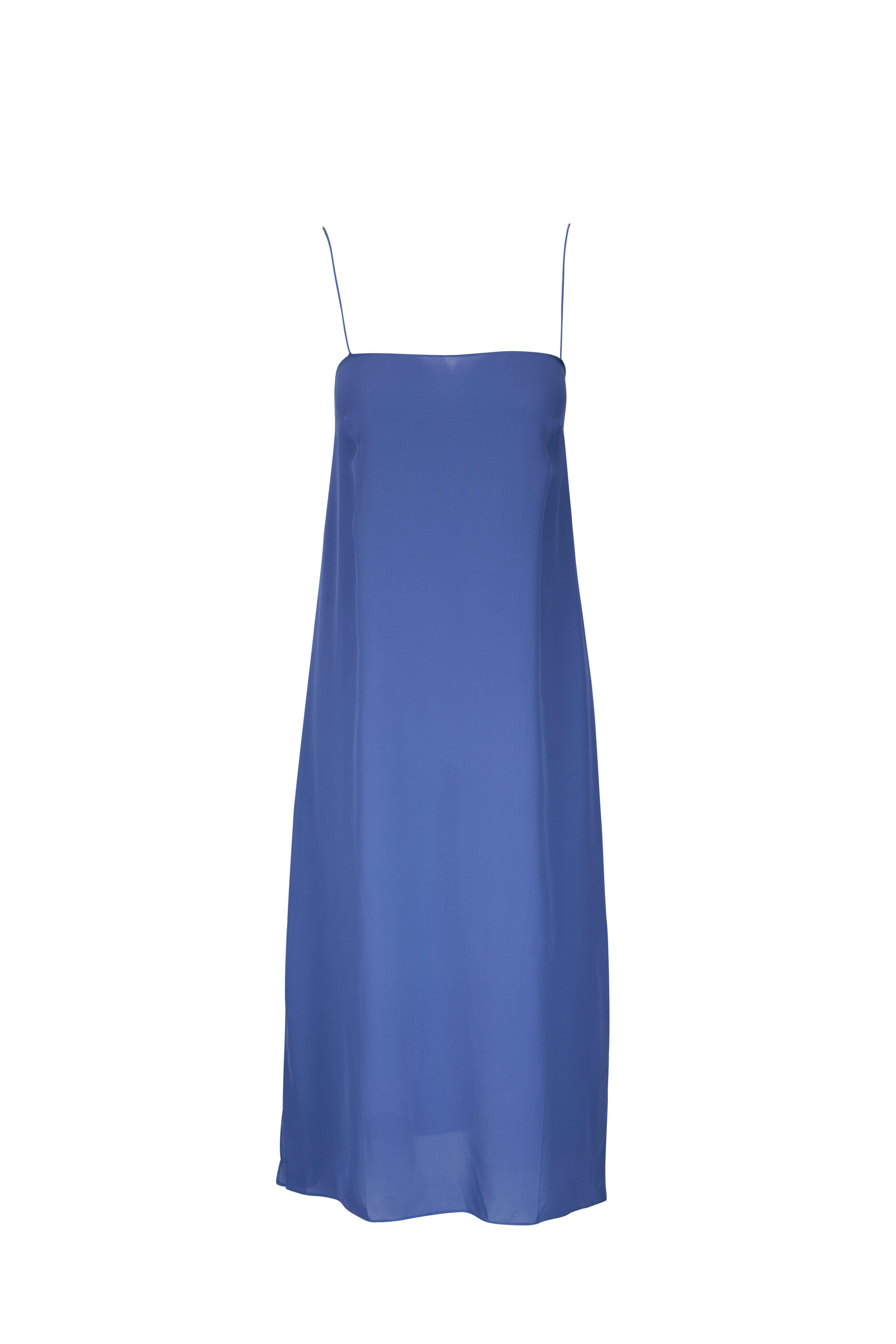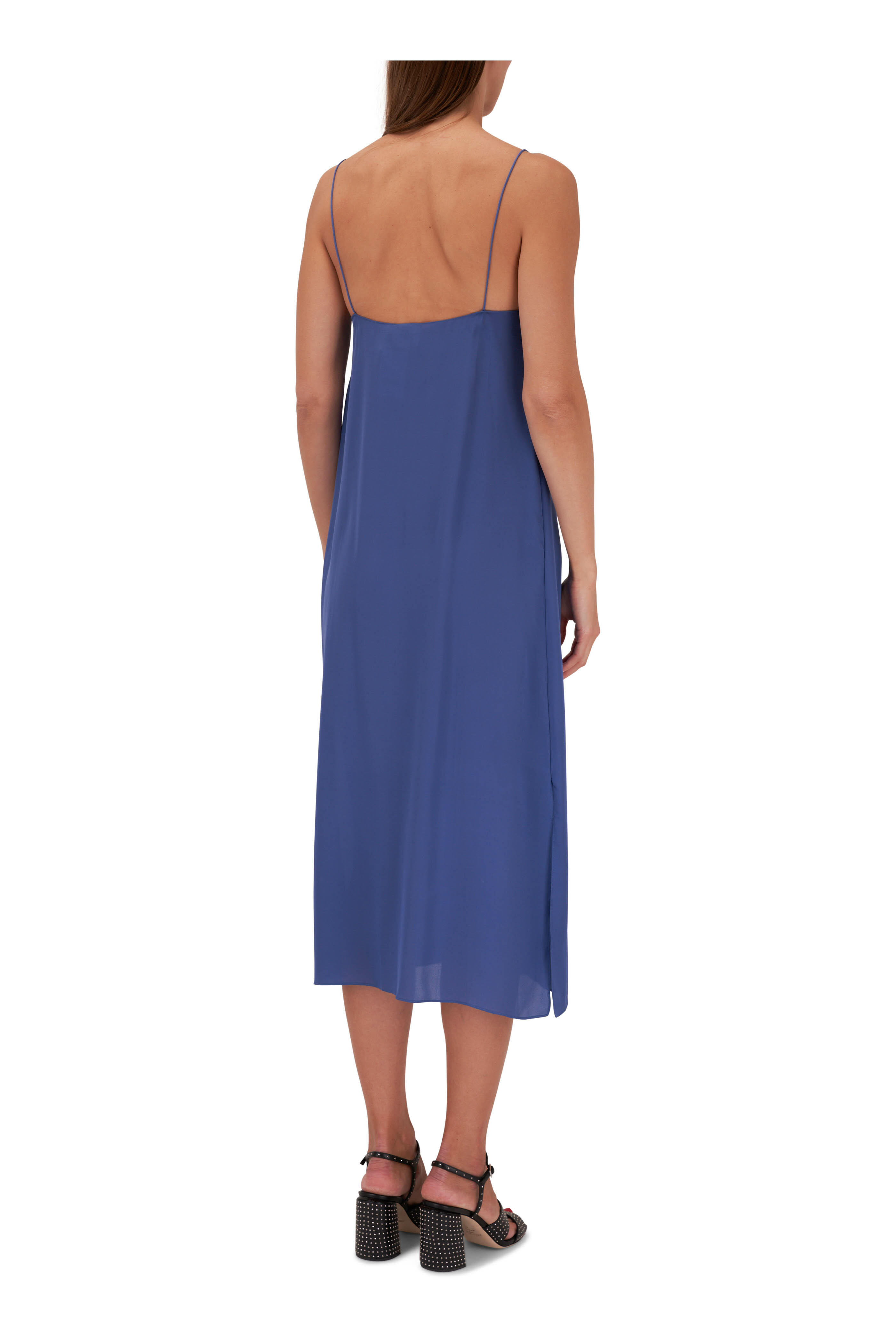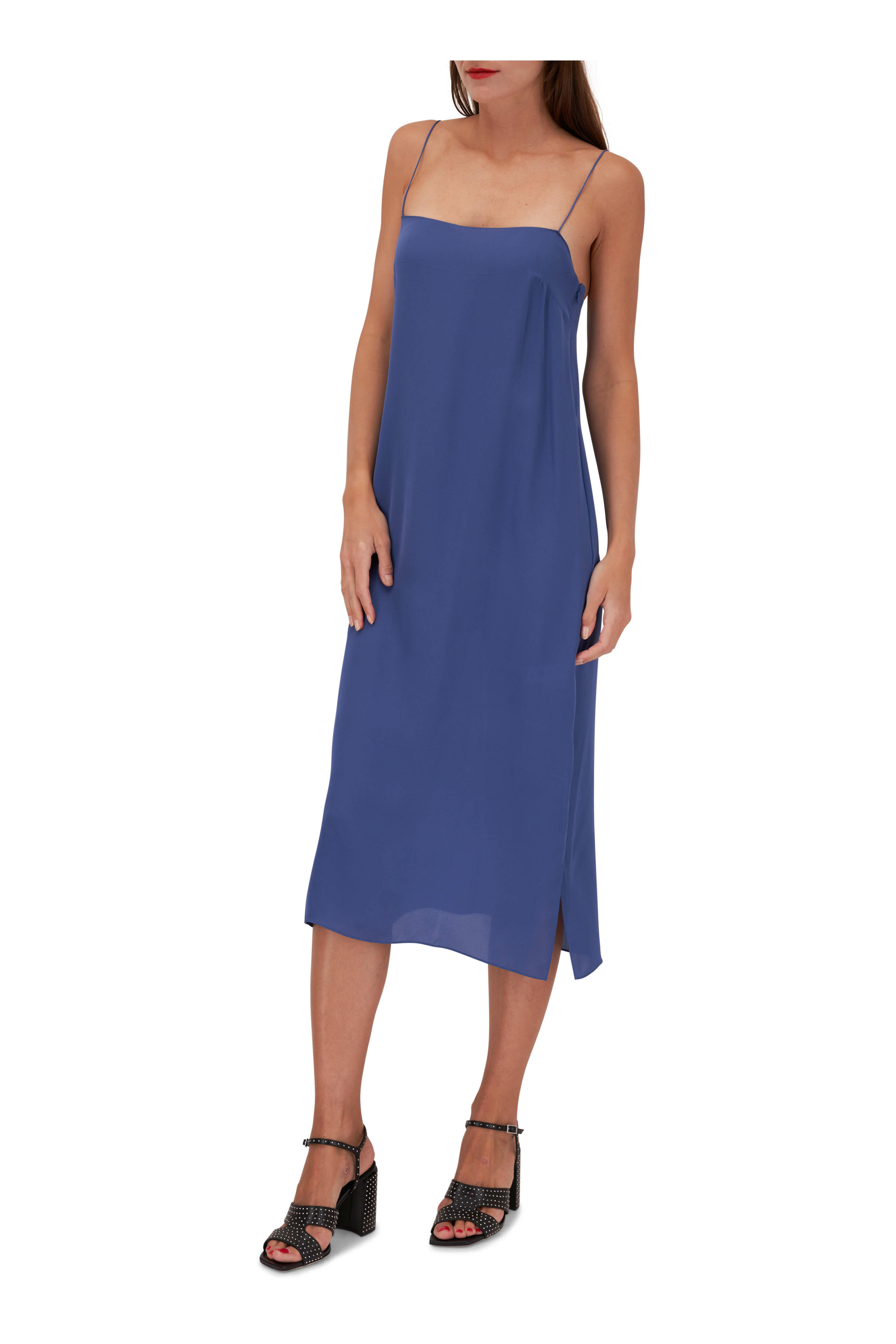 Squared neckline. Concealed side zip. Delicate lingerie straps. Side slit. Imported. True to size. Hits mid calf. 100% silk. Dry clean.