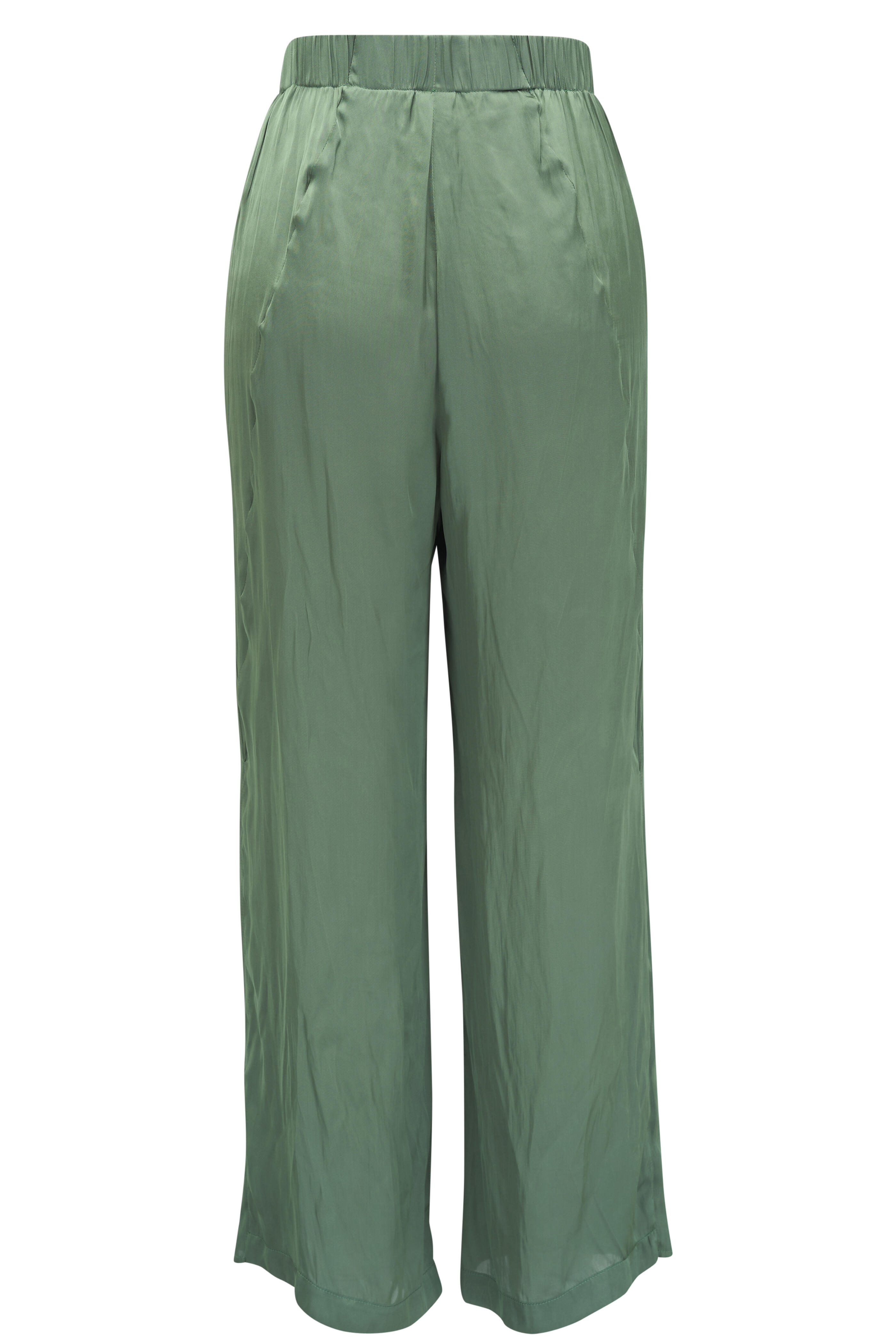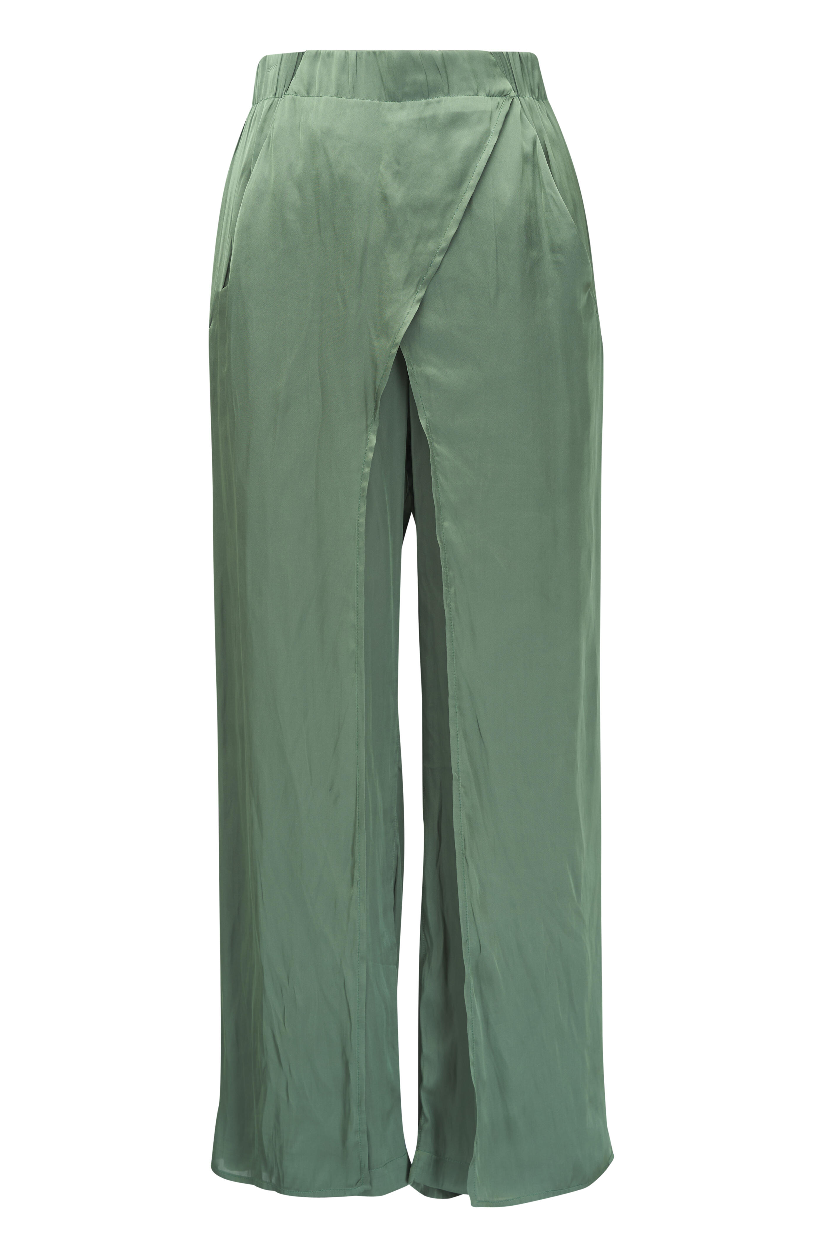 Slip-on style; elastic waist. Front slant pockets. Faux wrap overlay. Made in New York. 27" inseam (size 4). 56% recycled polyester, 44% polyester. Hand wash.