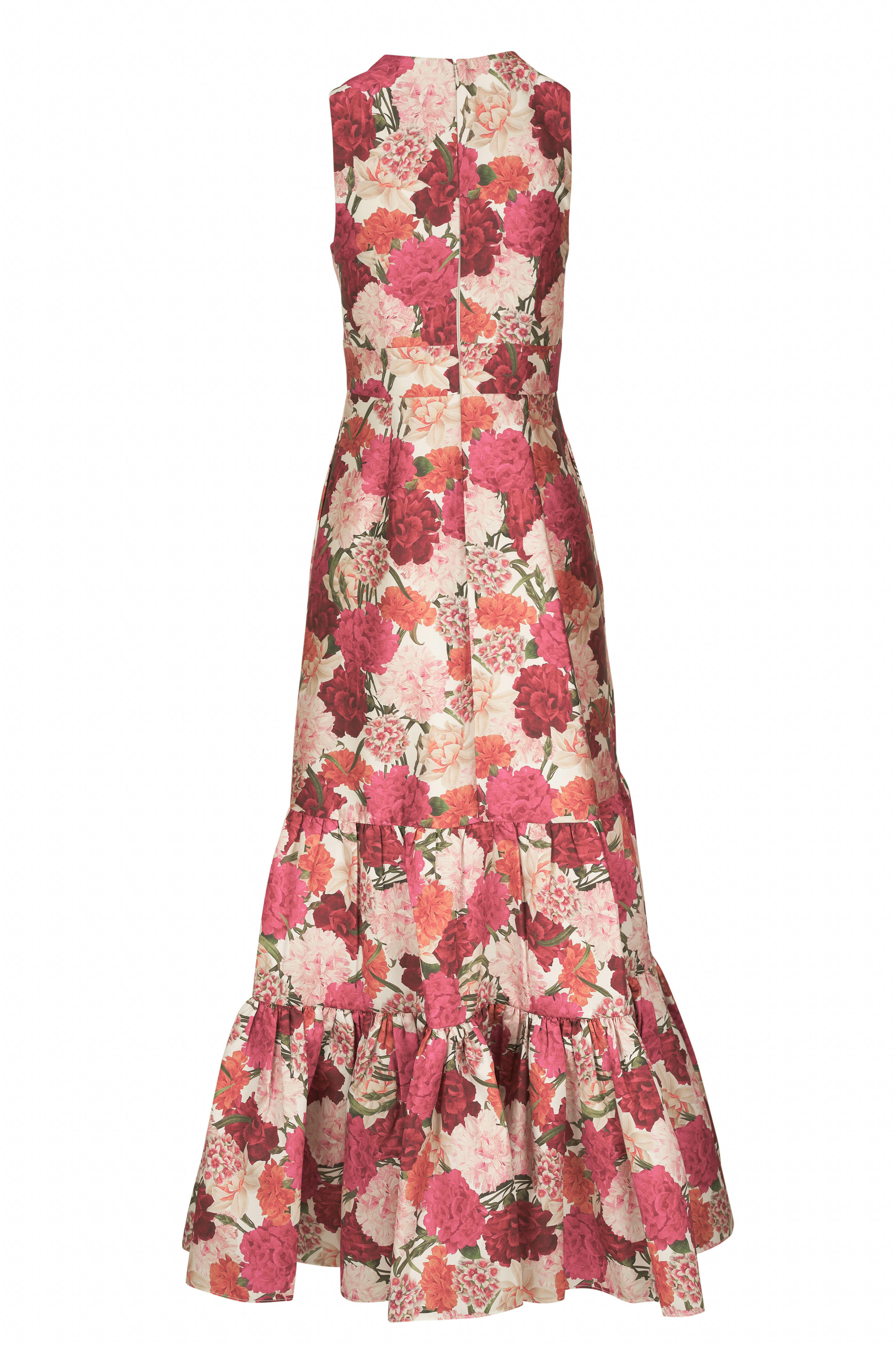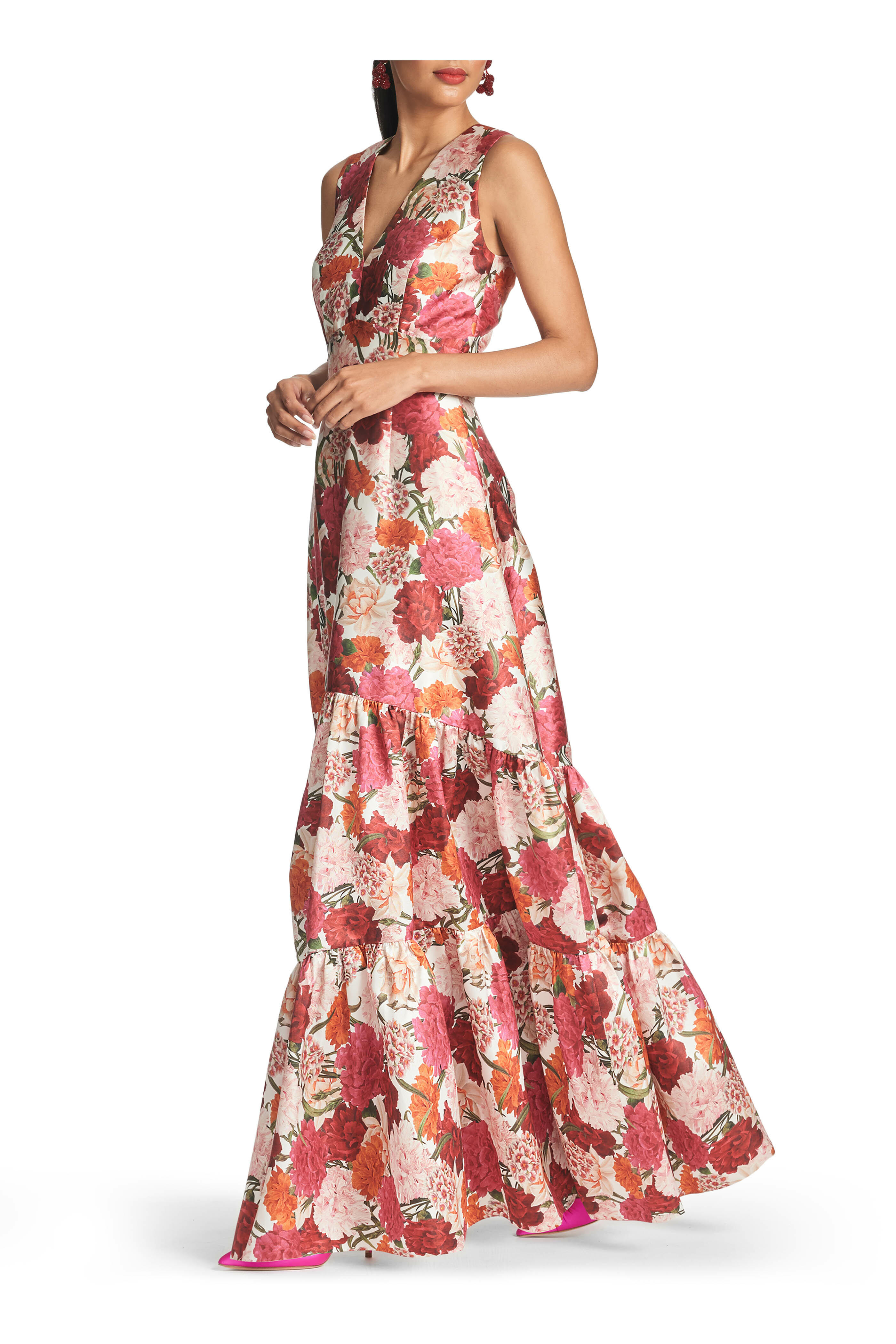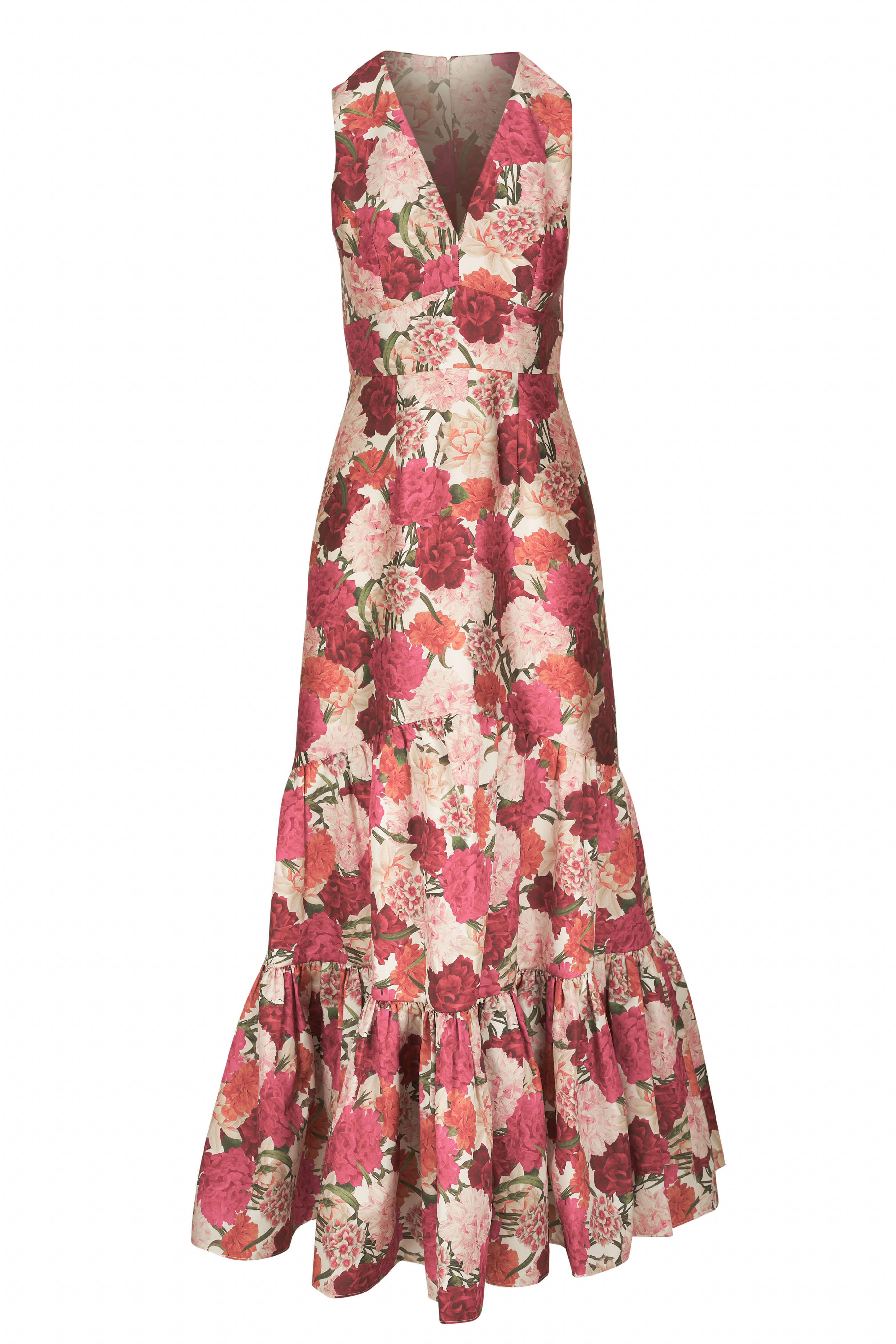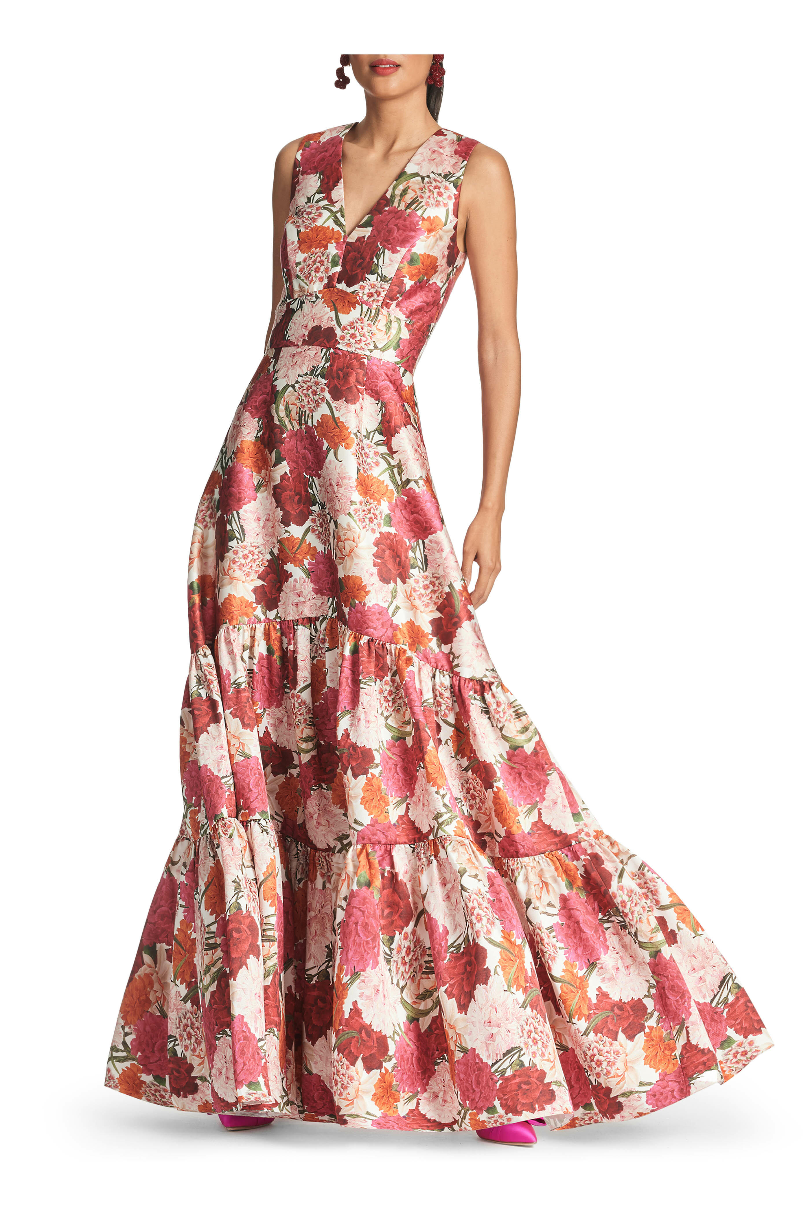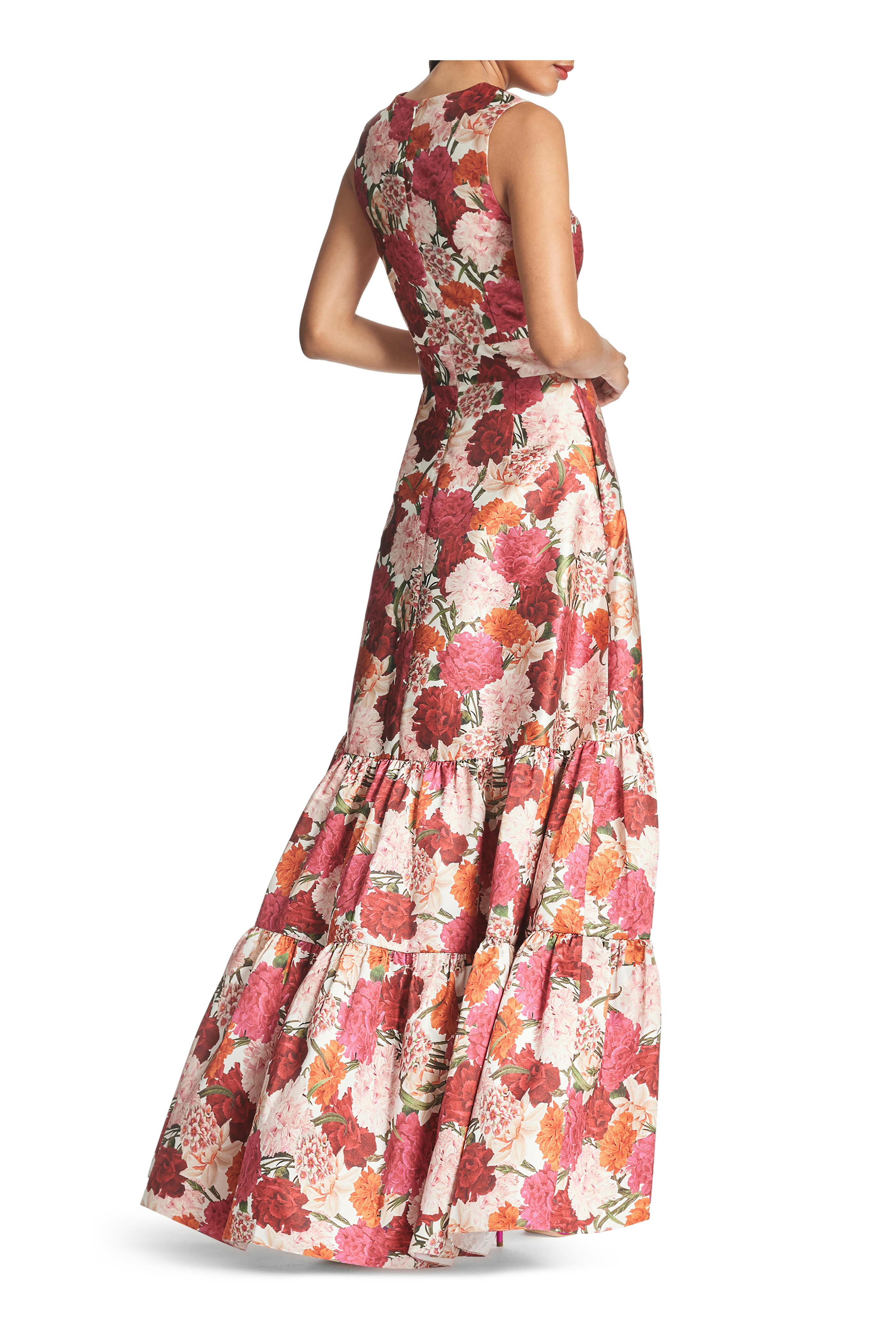 V-neckline. Concealed back zip. Concealed side seam pockets. Tiered skirt; flounce hem. Imported. Full-Length, 60" from shoulder to hem. 100% polyester; fully lined. Dry clean.