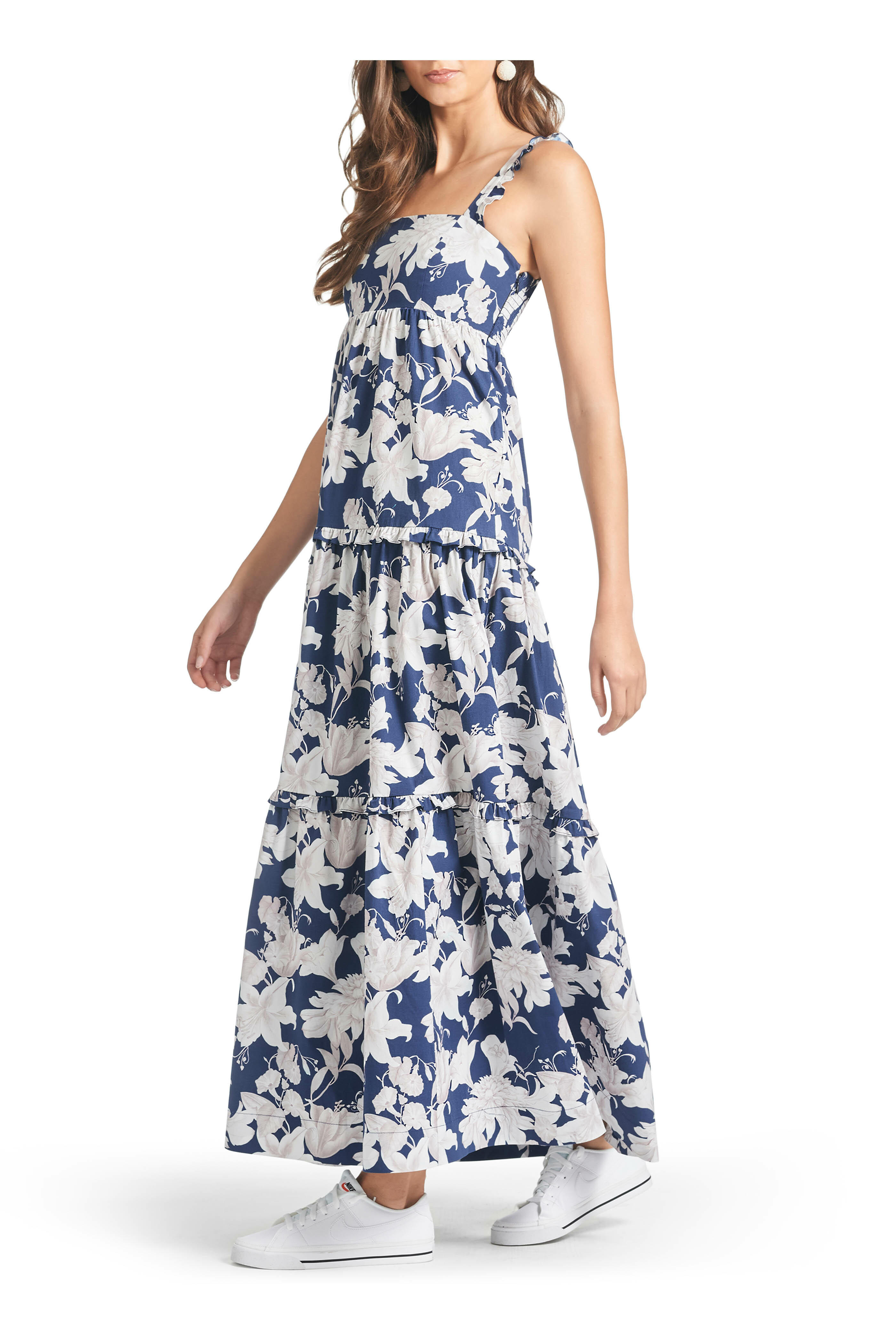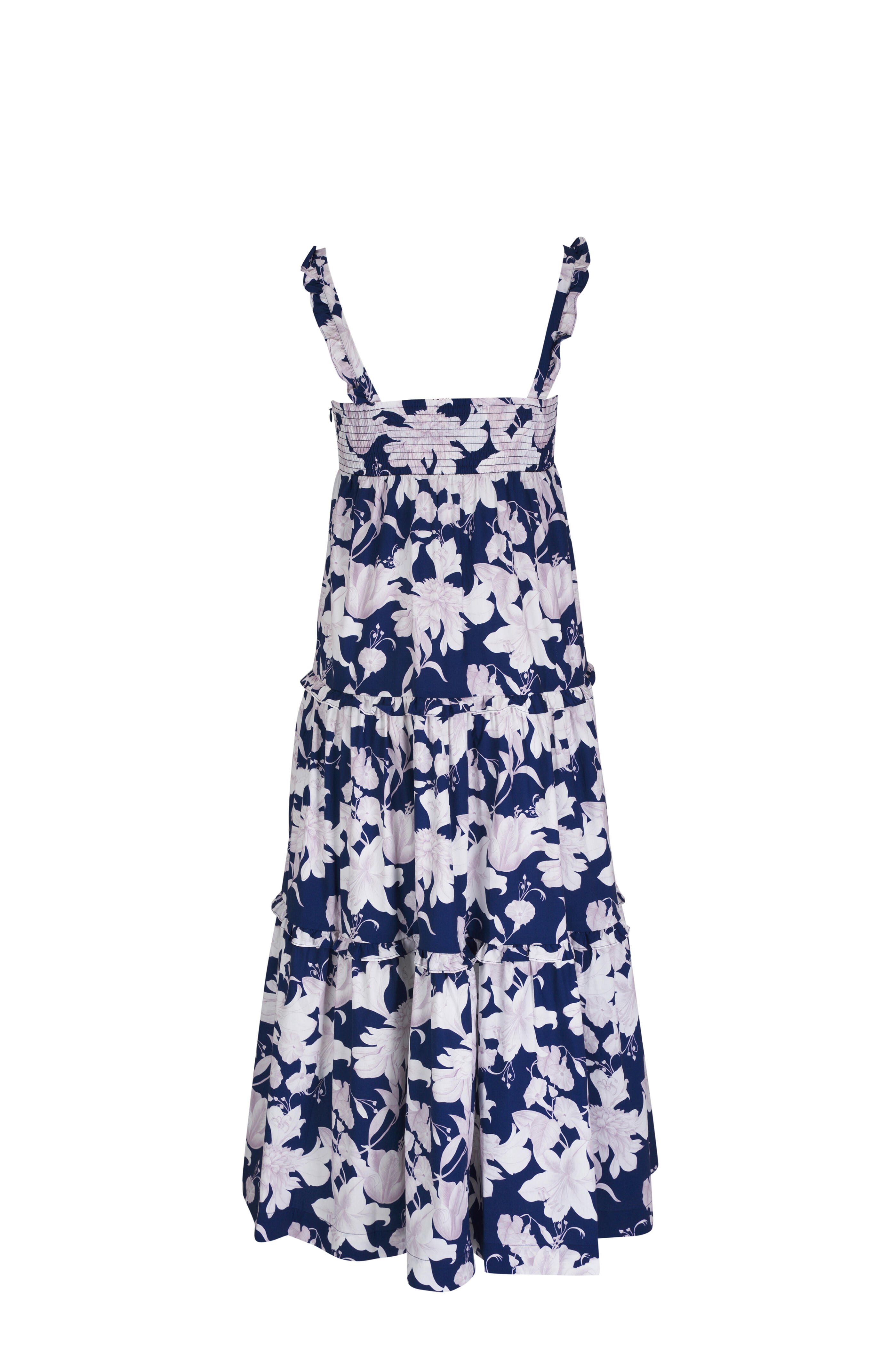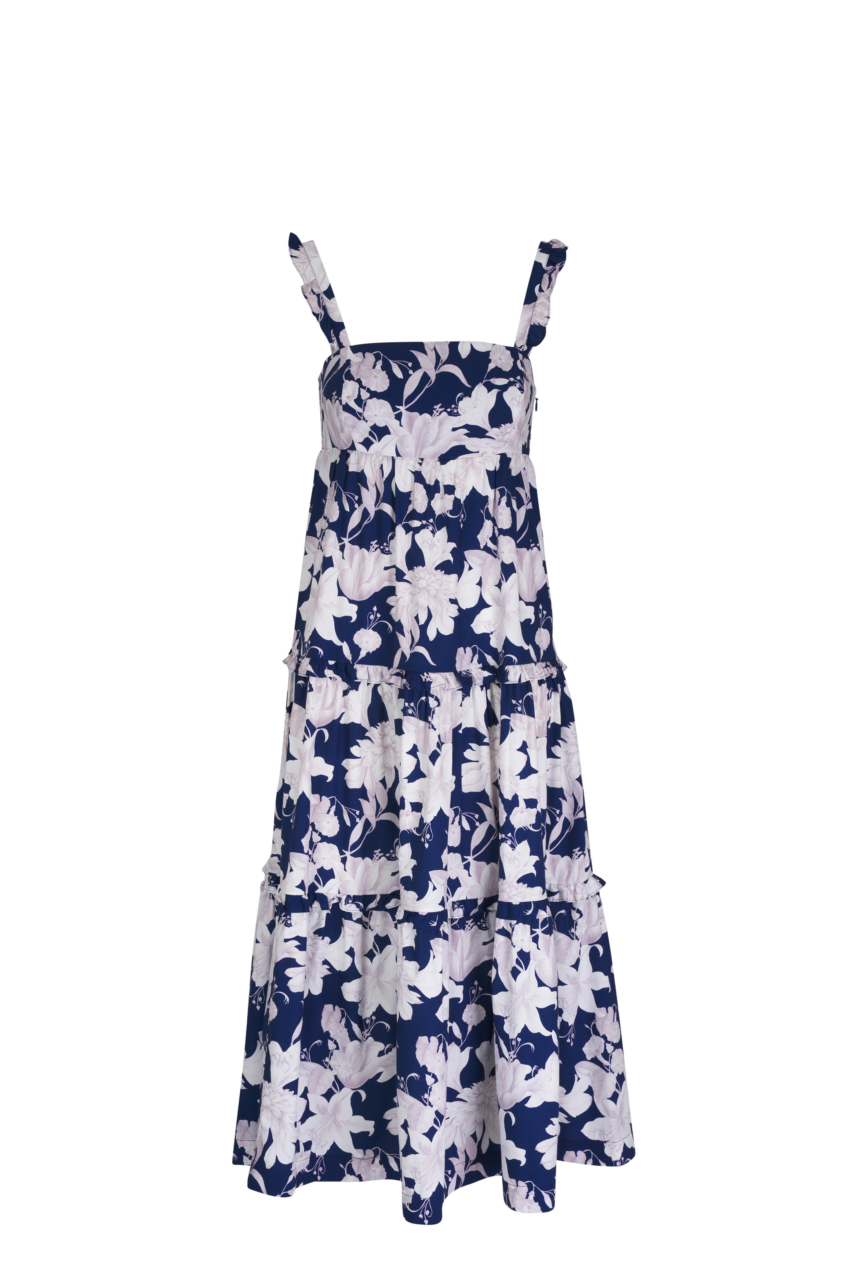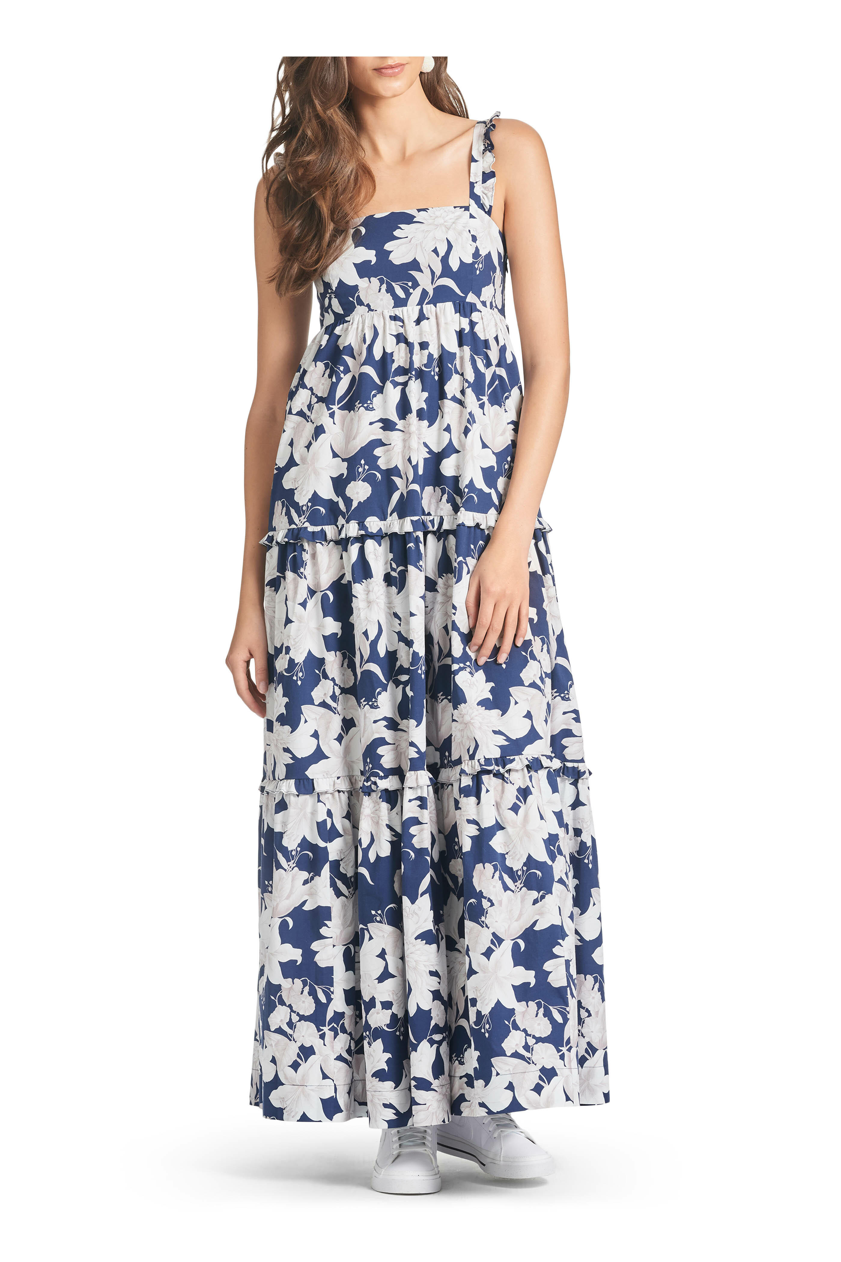 Square neckline. Side zip closure. Subtle ruffle detail at shoulder straps. Teired skirt. Imported. 54" length. 98% cotton, 2% spandex. Dry clean.