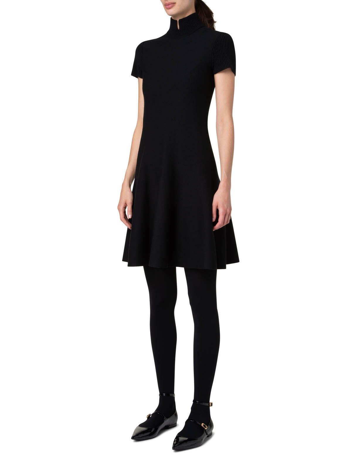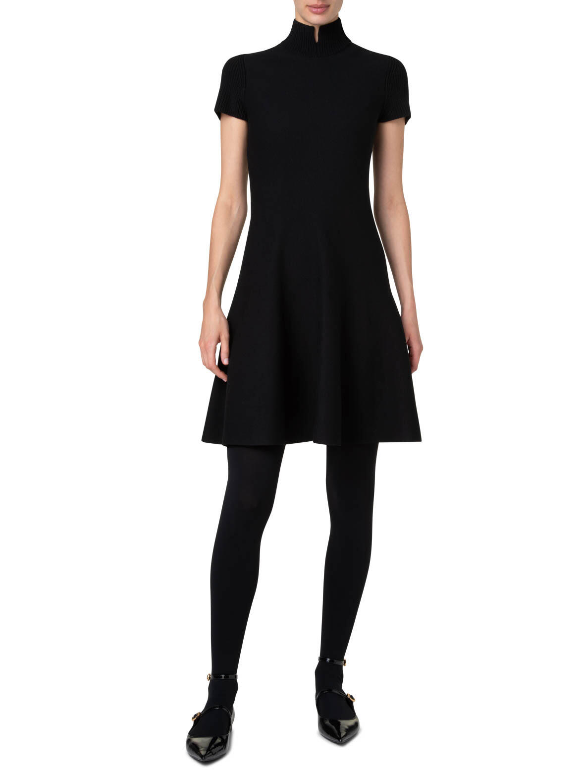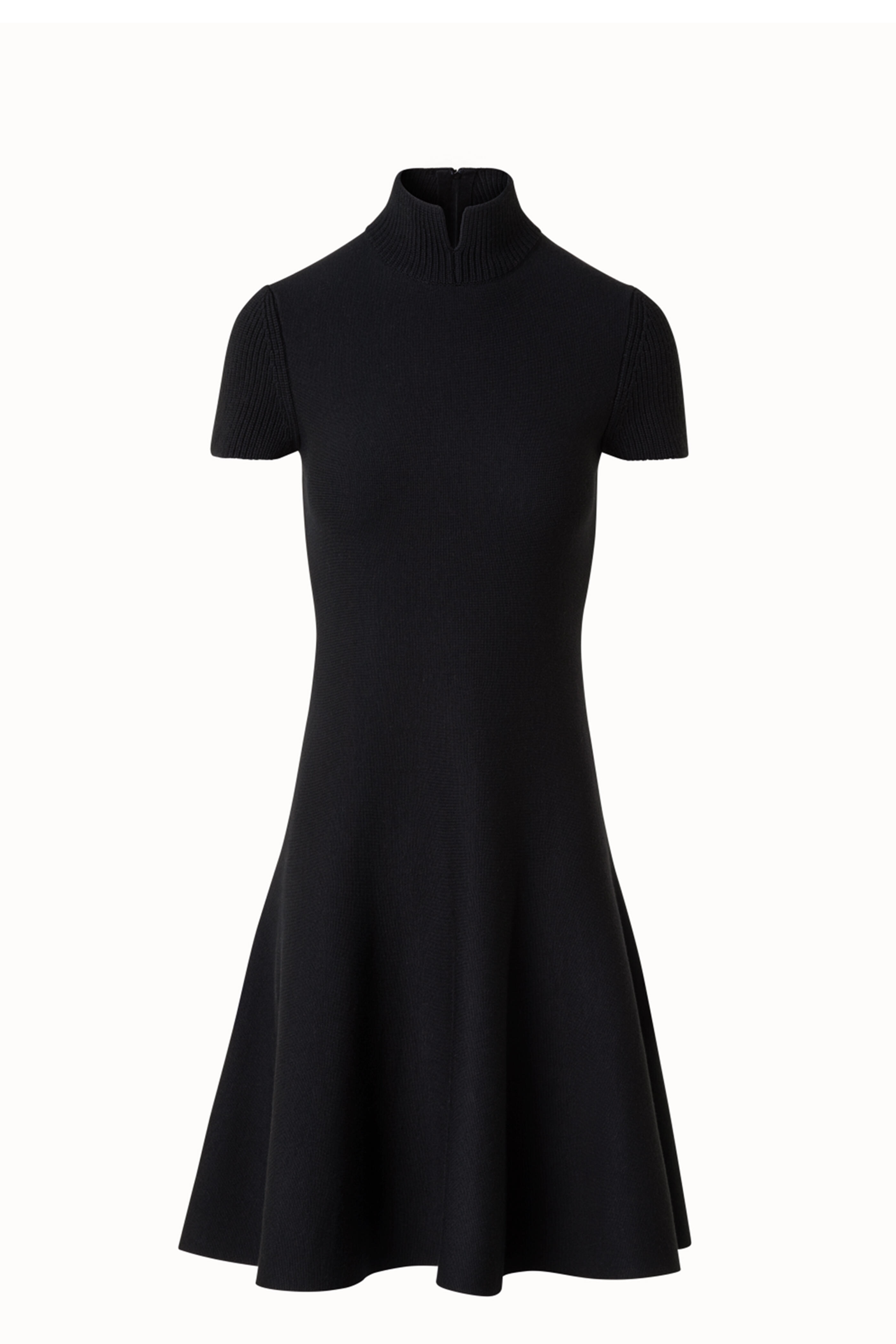 Mock neckline; slit. Concealed back zip. Flared hem. Imported. Knee length. 95% virgin wool, 5% elastance. Dry clean.