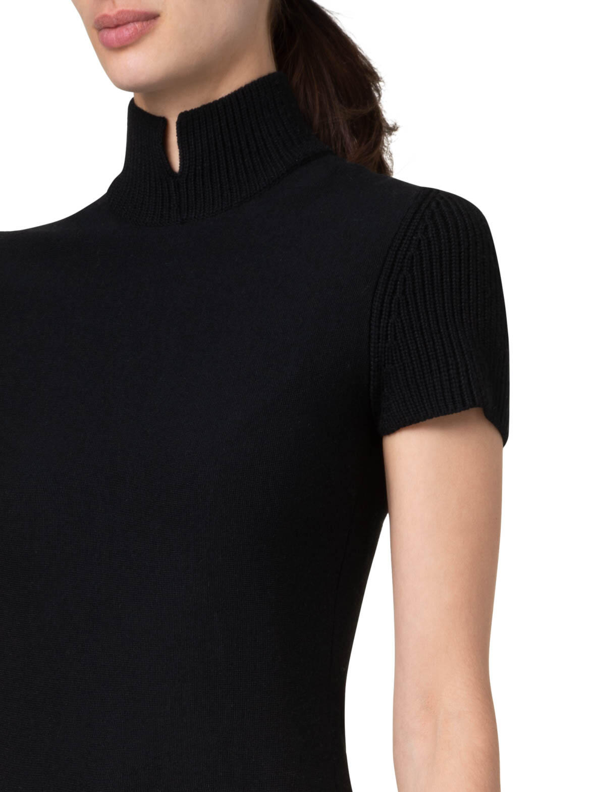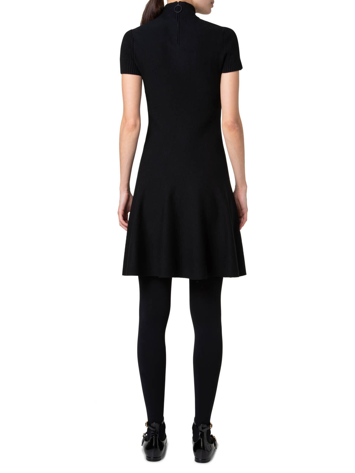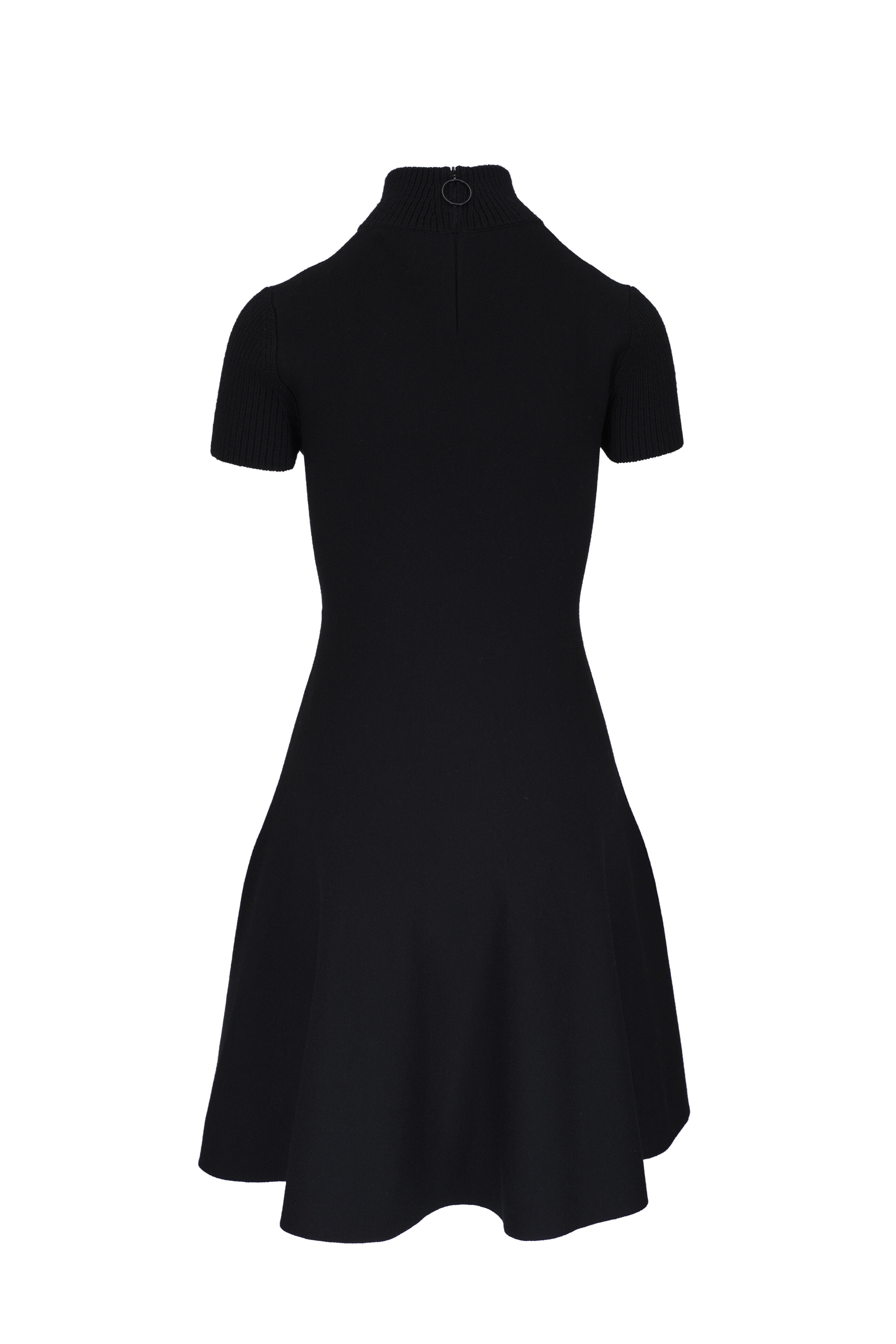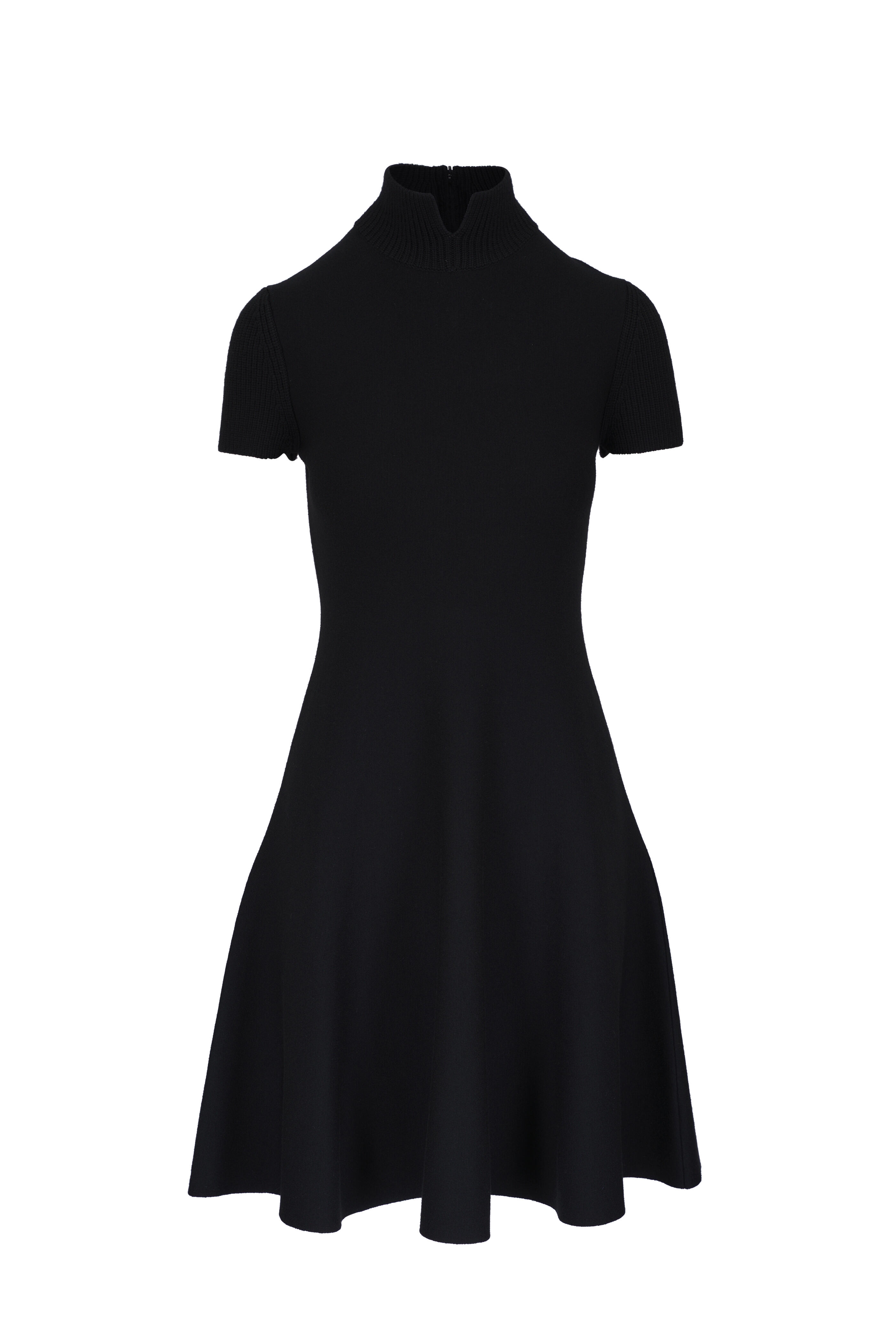 Mock neckline; slit. Concealed back zip. Flared hem. Imported. Knee length. 95% virgin wool, 5% elastance. Dry clean.