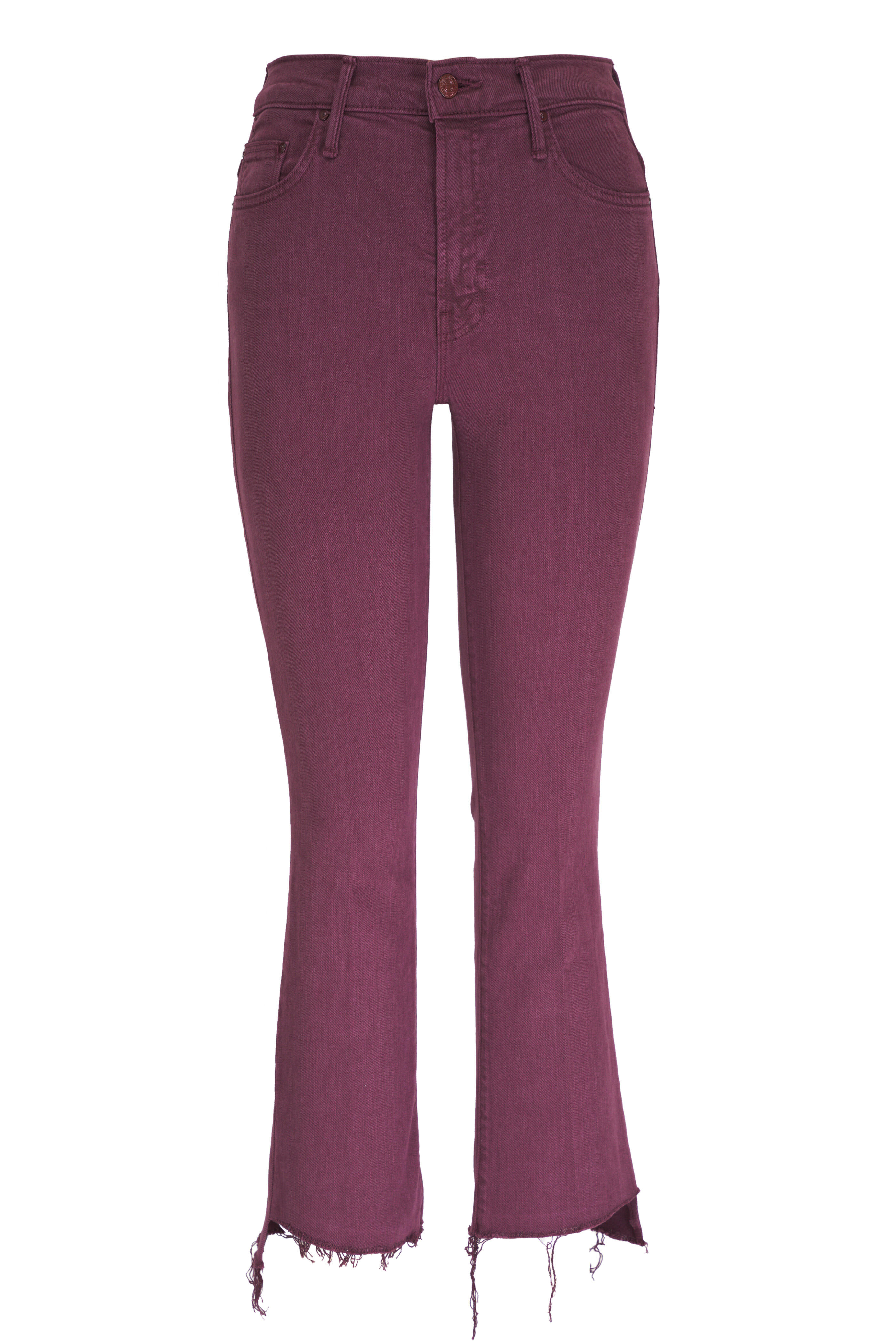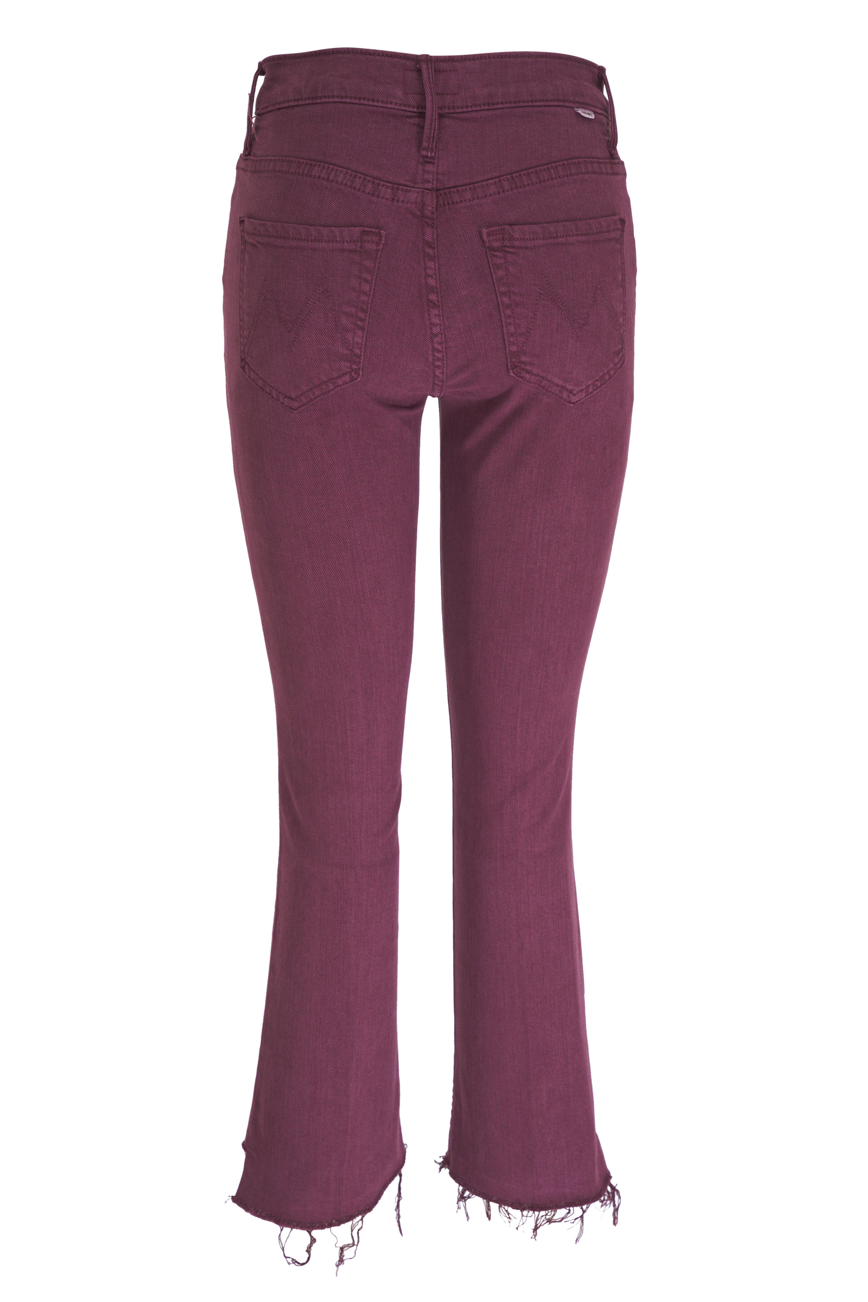 Zip fly with button closure. Five pocket styling. High-low raw edge hem. Made in the USA. Color: Mauve Wine. Inseam 27" (measurement size 25). 10" Rise. 15 1/4" Leg Opening. 60% cotton, 37% lyocell, 3% elastane. Machine wash.