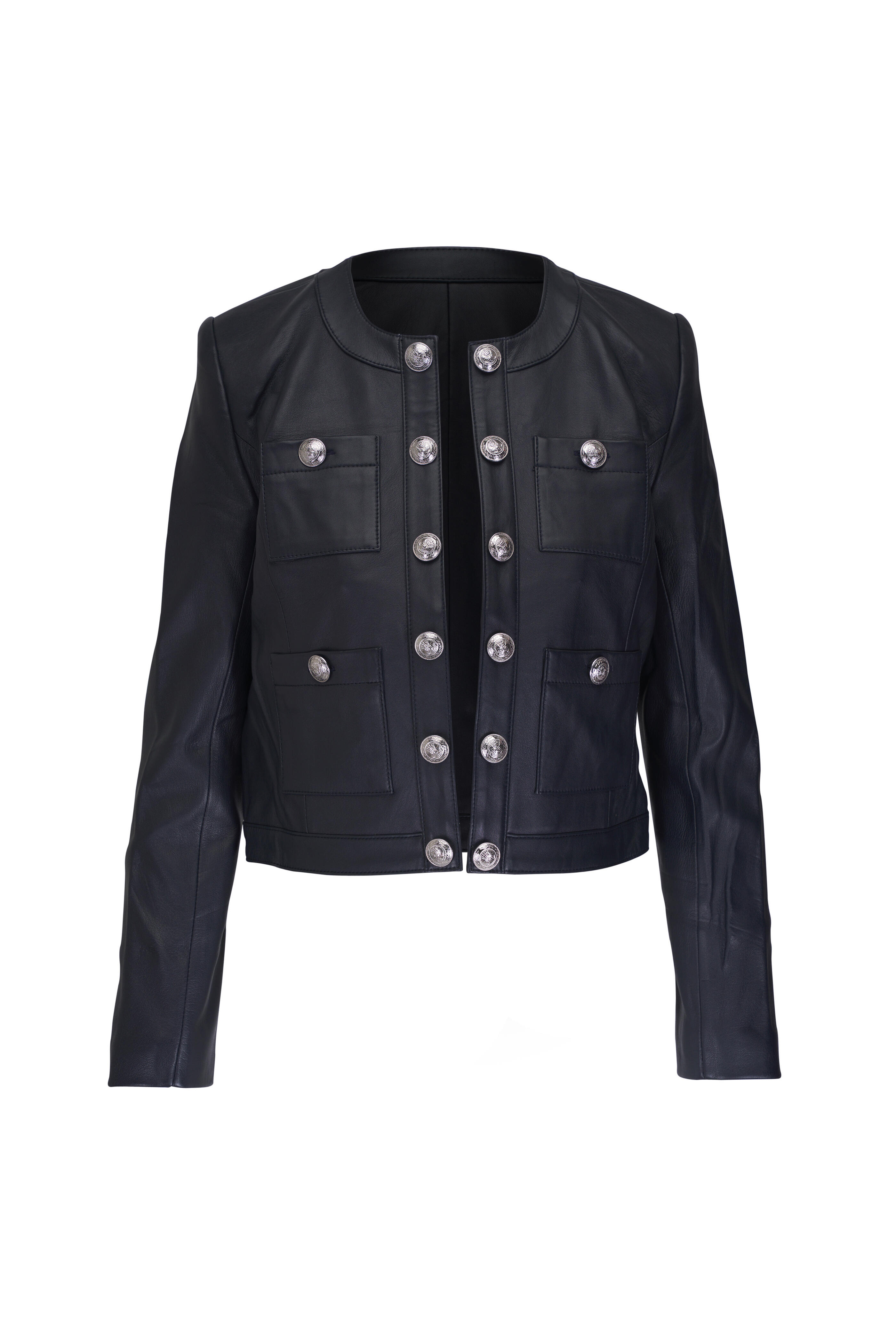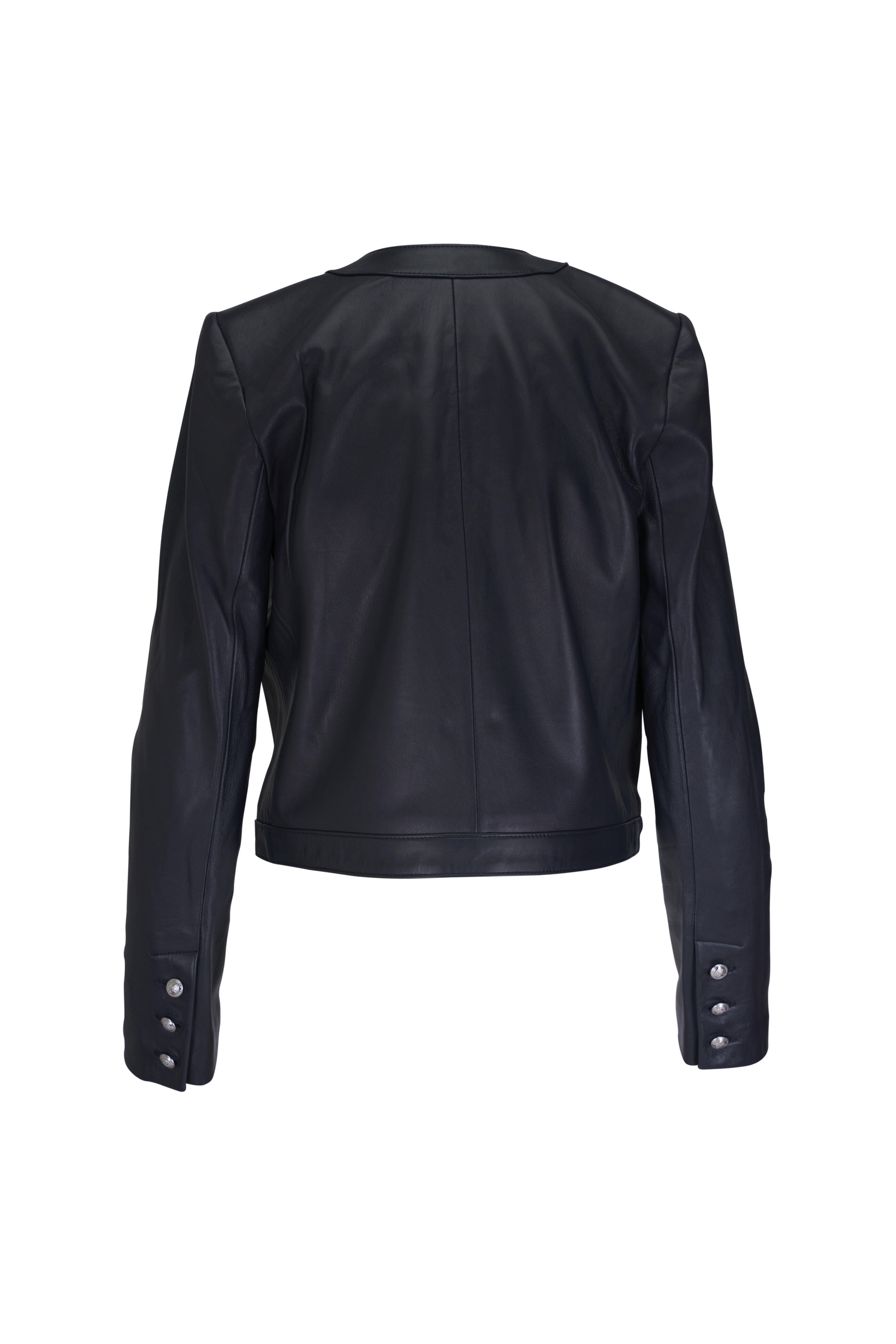 Leather. Specilaist clean. Fully lined. Collarless. Open front. Strong shoulders. Four front patch pockets. Imported. About 20.25" From Shoulder to Hem. Sleeve Length: 24.5".