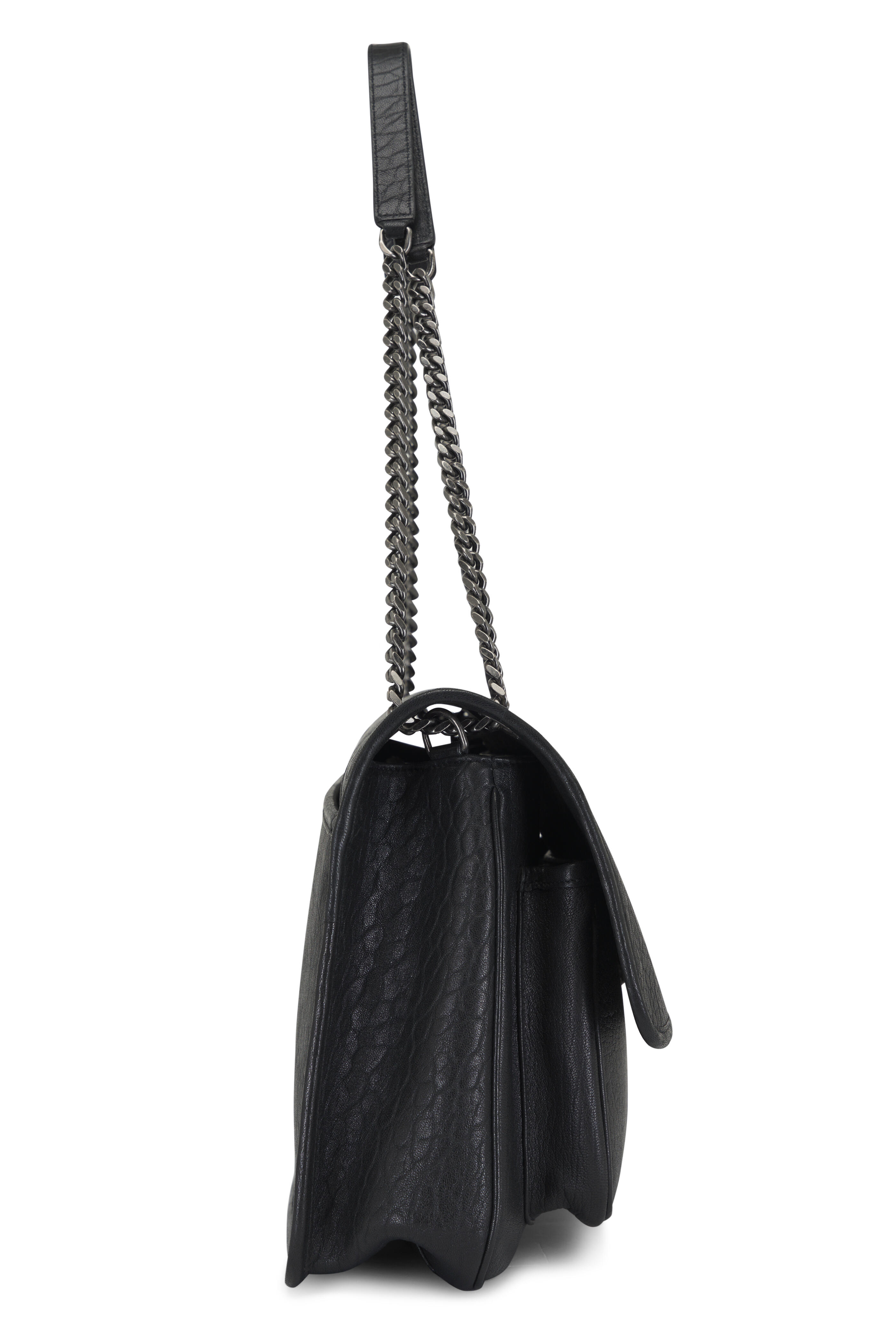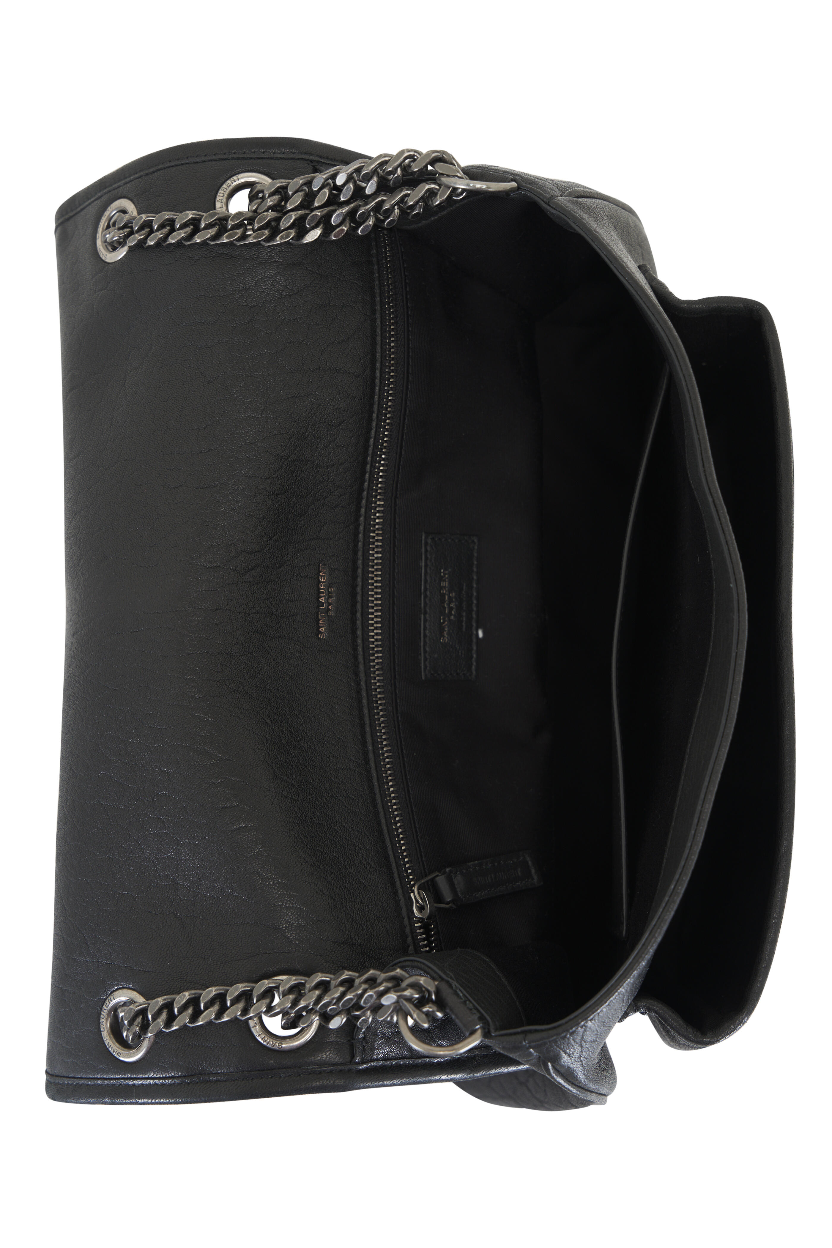 Lambskin leather. Sliding chain and leather strap. Magnetic snap closure. Exterior back open pocket; zip pocket and under flap pocket. Grosgrain lining. Silver toned hardware. Made in Italy. DIMENSIONS: 32 X 23 X 9 CM / 12.6" x 9.1" x 3.5". STRAP DROP: 28–51 CM / 11–20.1".
