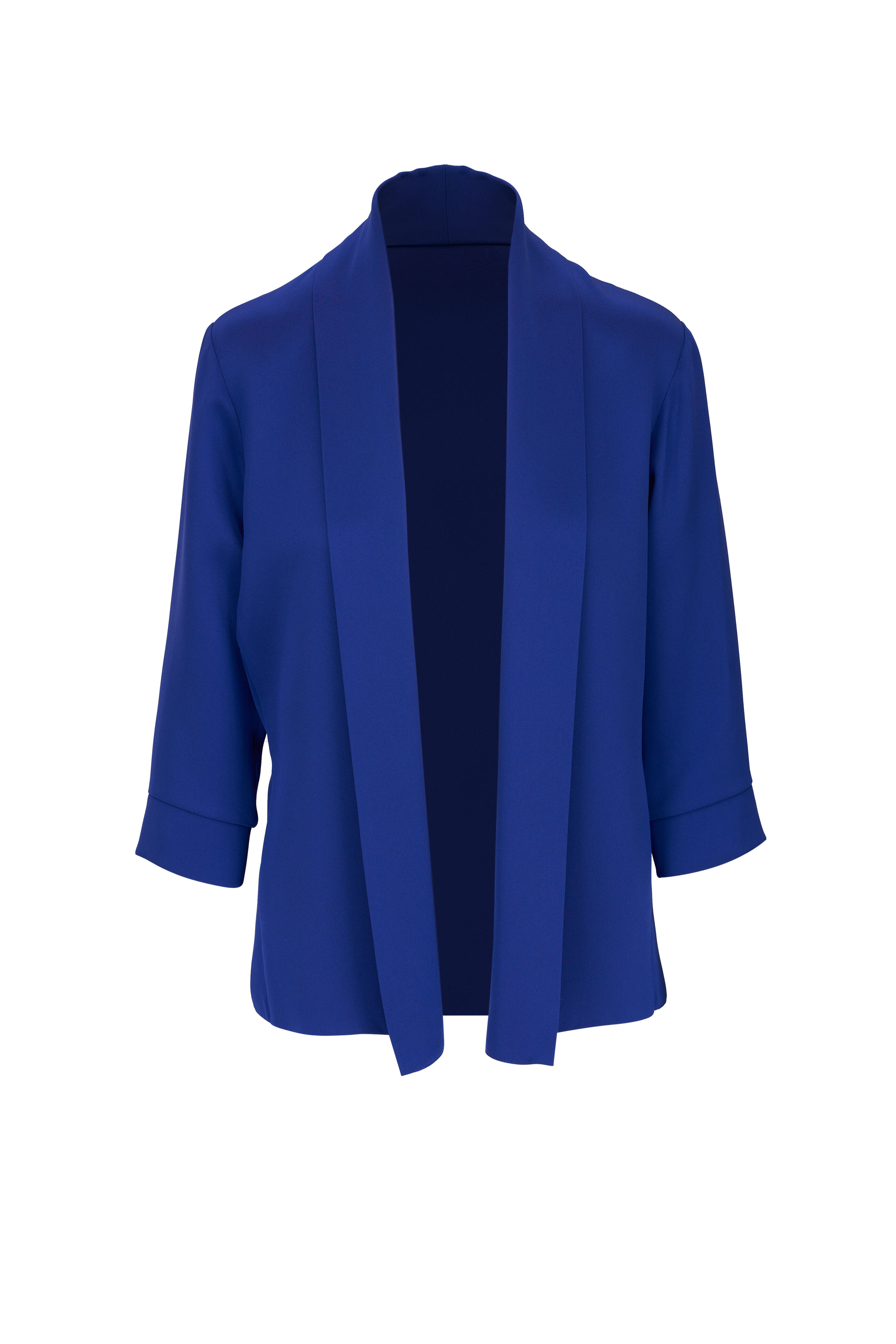 Open front. Shawl collar. Three-quarter length sleeves. Banded, split cuffs. On-seam pockets. Made in the USA. Expected delivery date by end of July. Please call Norma at 844-855-4847 for specific delivery date.. 100% silk. Dry clean.