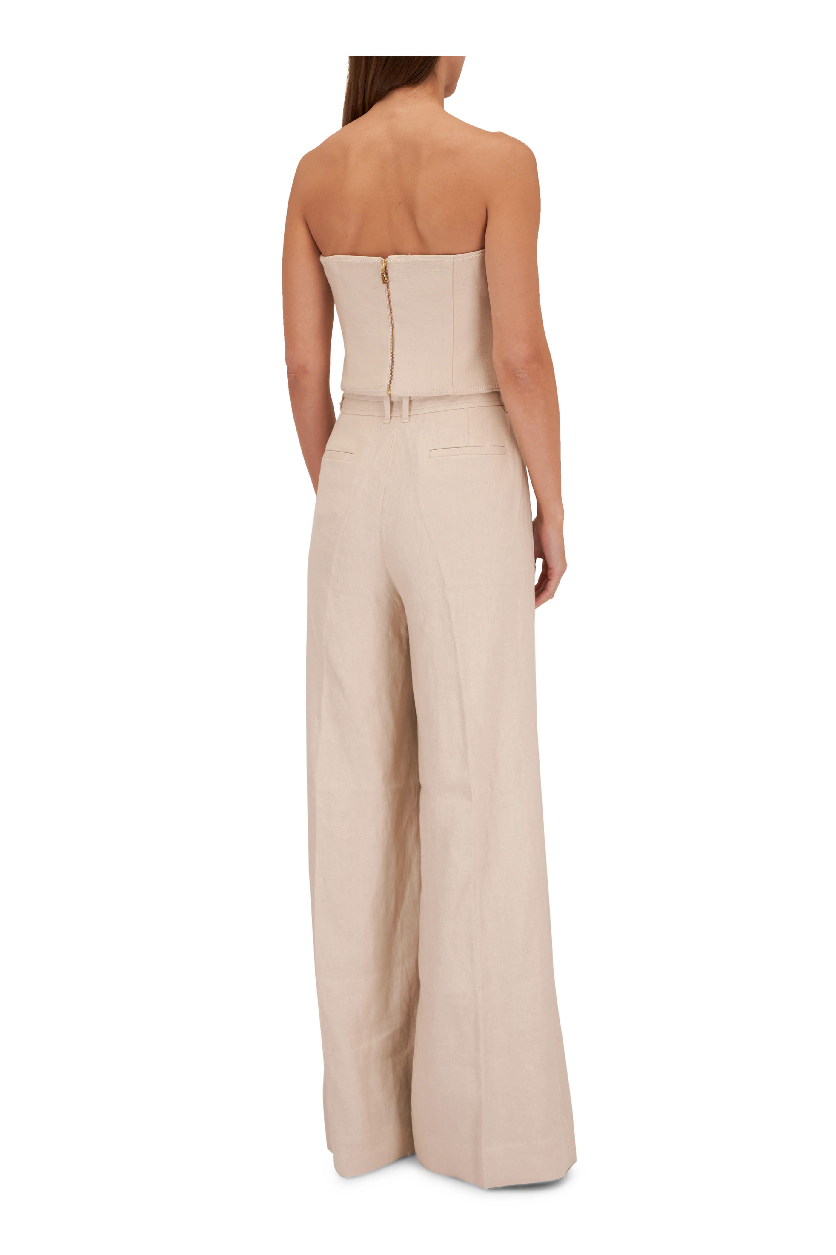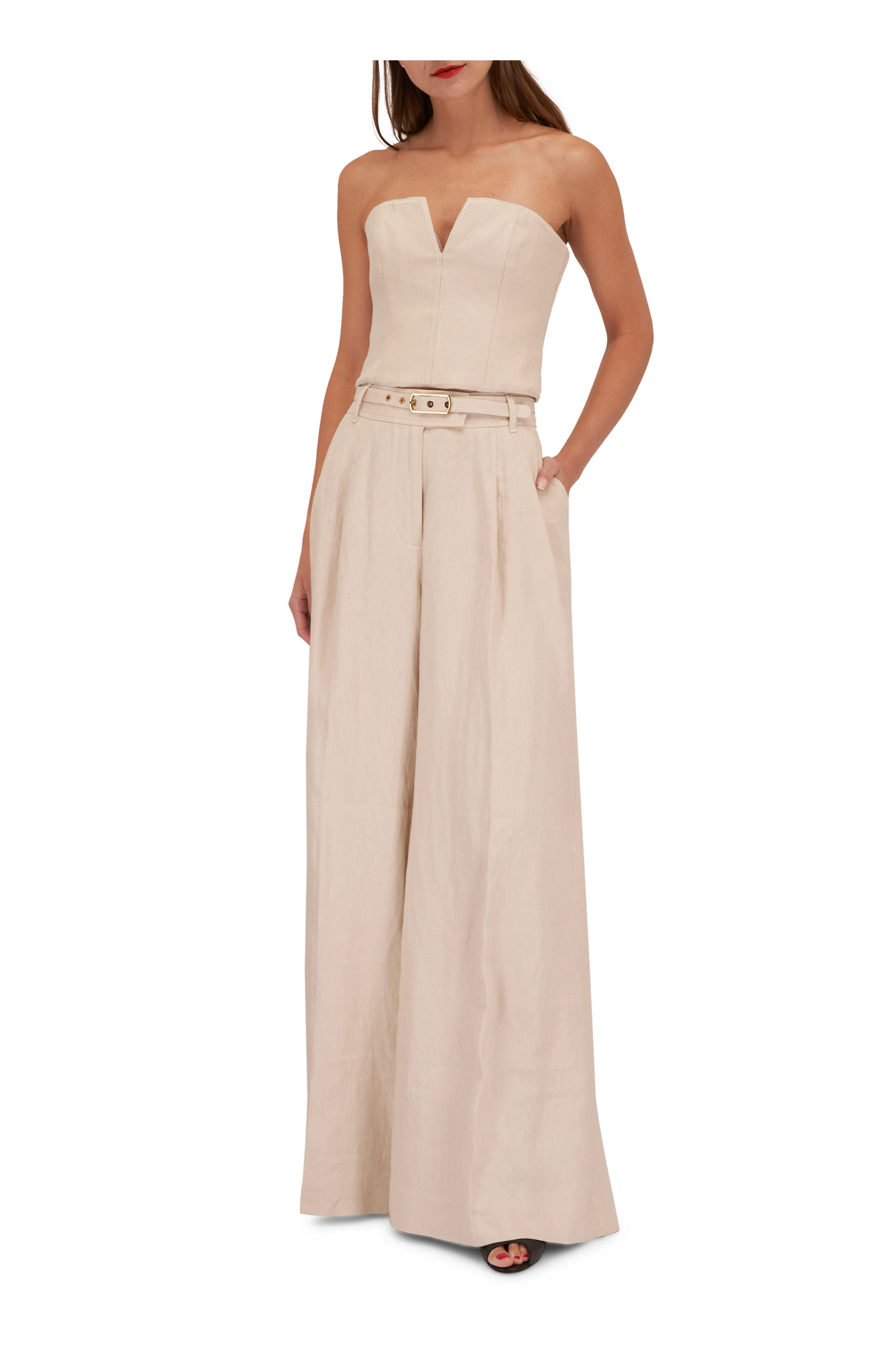 Zip fly with hook-and-eye closure. Self-covered belt with gold-toned hardware. Side seam pockets; back welt pockets. Front pleat detail. Imported. 100% linen. Dry clean.