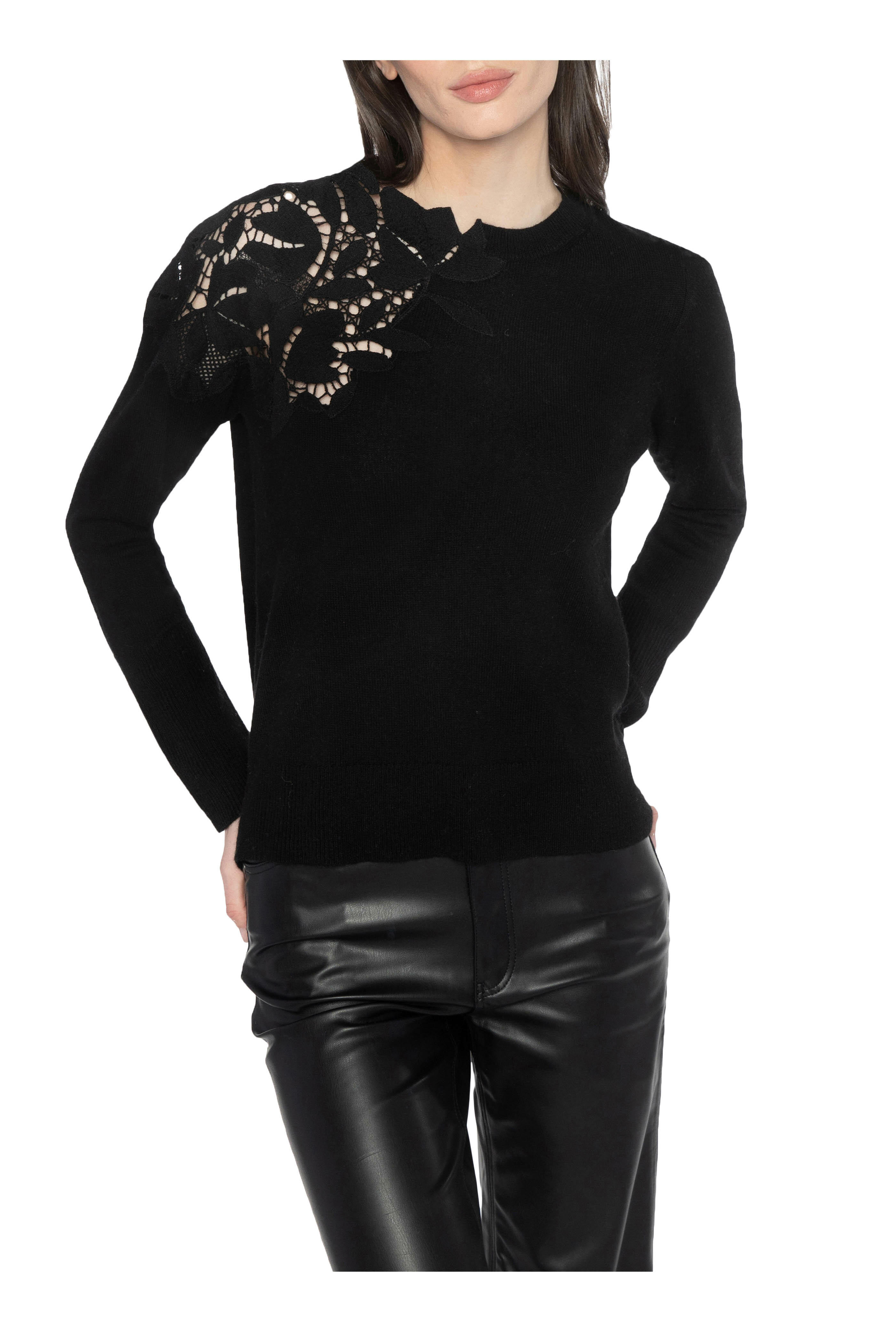 Crew neckline. Lace applique detail at shoulder. Imported. 100% cashmere. Dry clean.