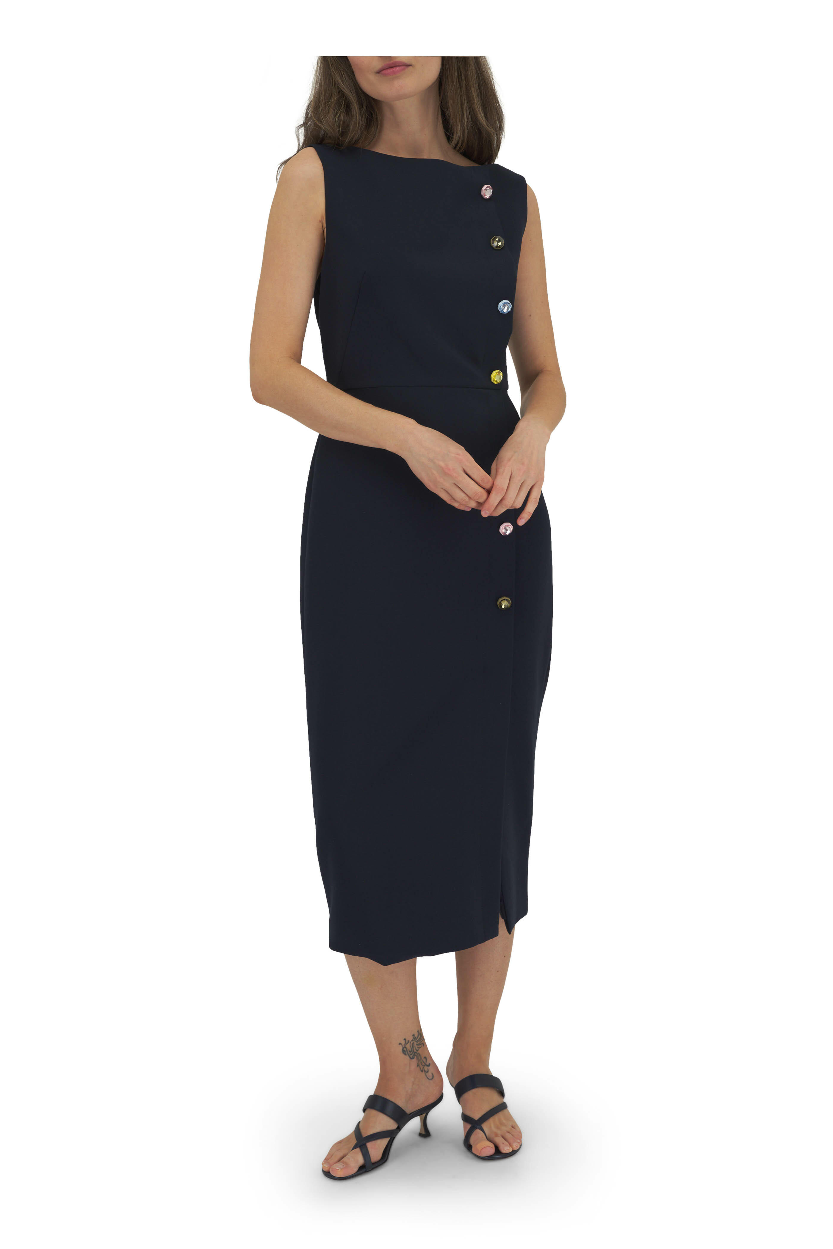 Fully lined. Round neckline. Concealed back zip. Front gemstone button placket. Front side slit. Made in the USA. 73% polyester, 20% viscose, 7% elastane. Dry clean.