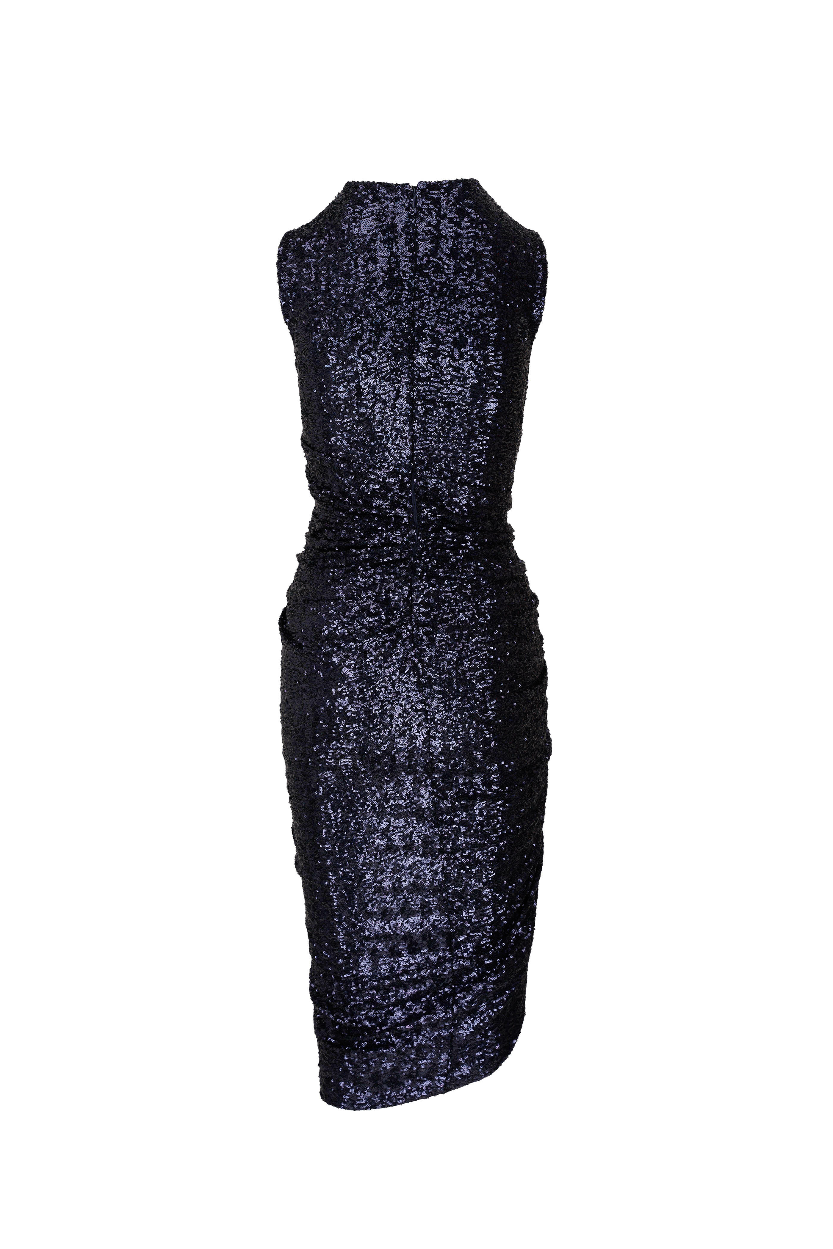 Round neckline. Concealed back zip. Ruched wrap-effect waist. Asymmetric hem. Made in Italy. 51" shoulder to hem. 91% nylon, 9% elastane. Dry clean.
