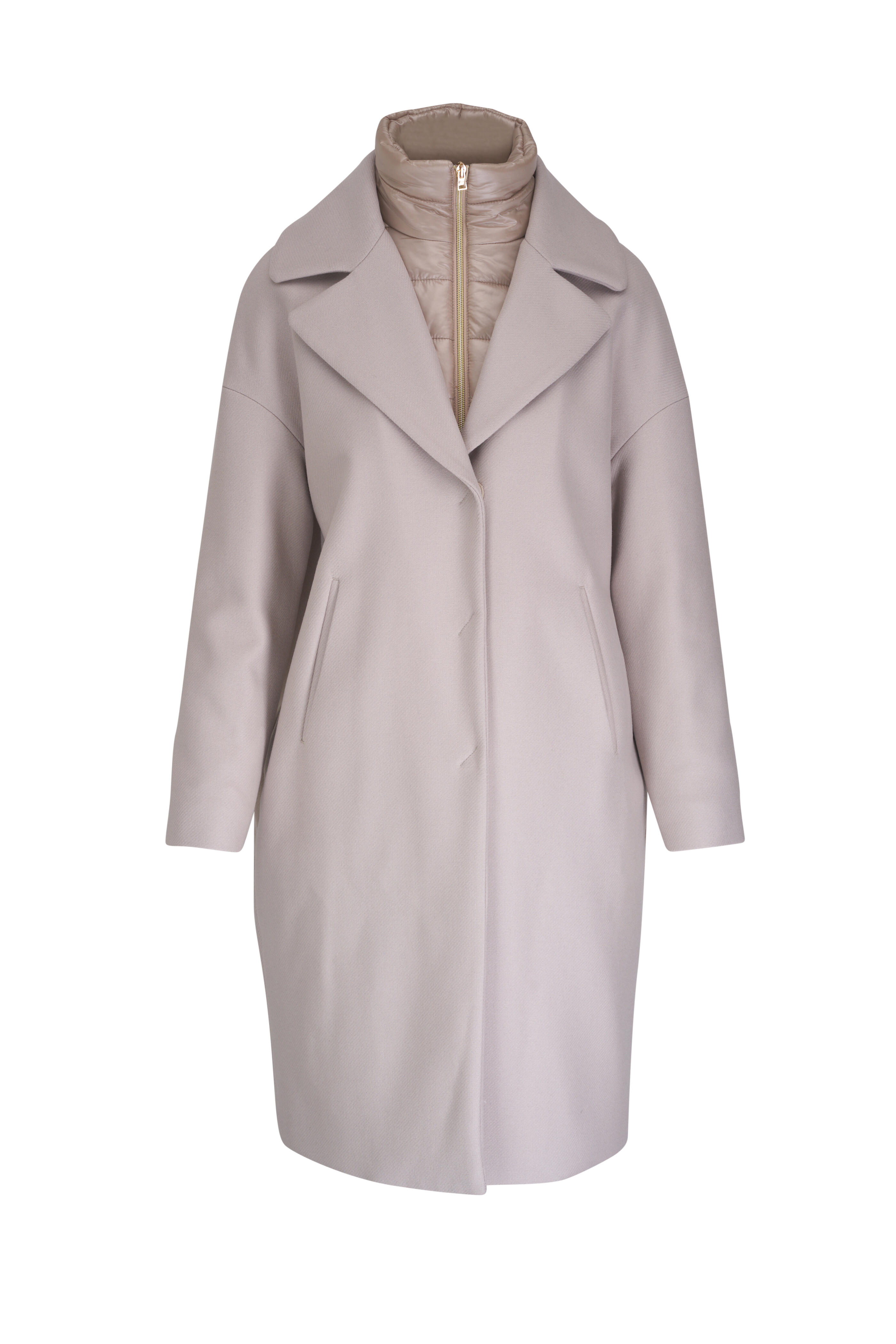 Made in Italy. Jacket: Notched lapels. Three button placket. Lower slip pockets. Removable dickey insert: Stand collar. Two-way front zip closure. Shoulder to hem 41" (size 4). 75% virgin wool, 25% nylon; lining: 100% polyamide. Dry clean.