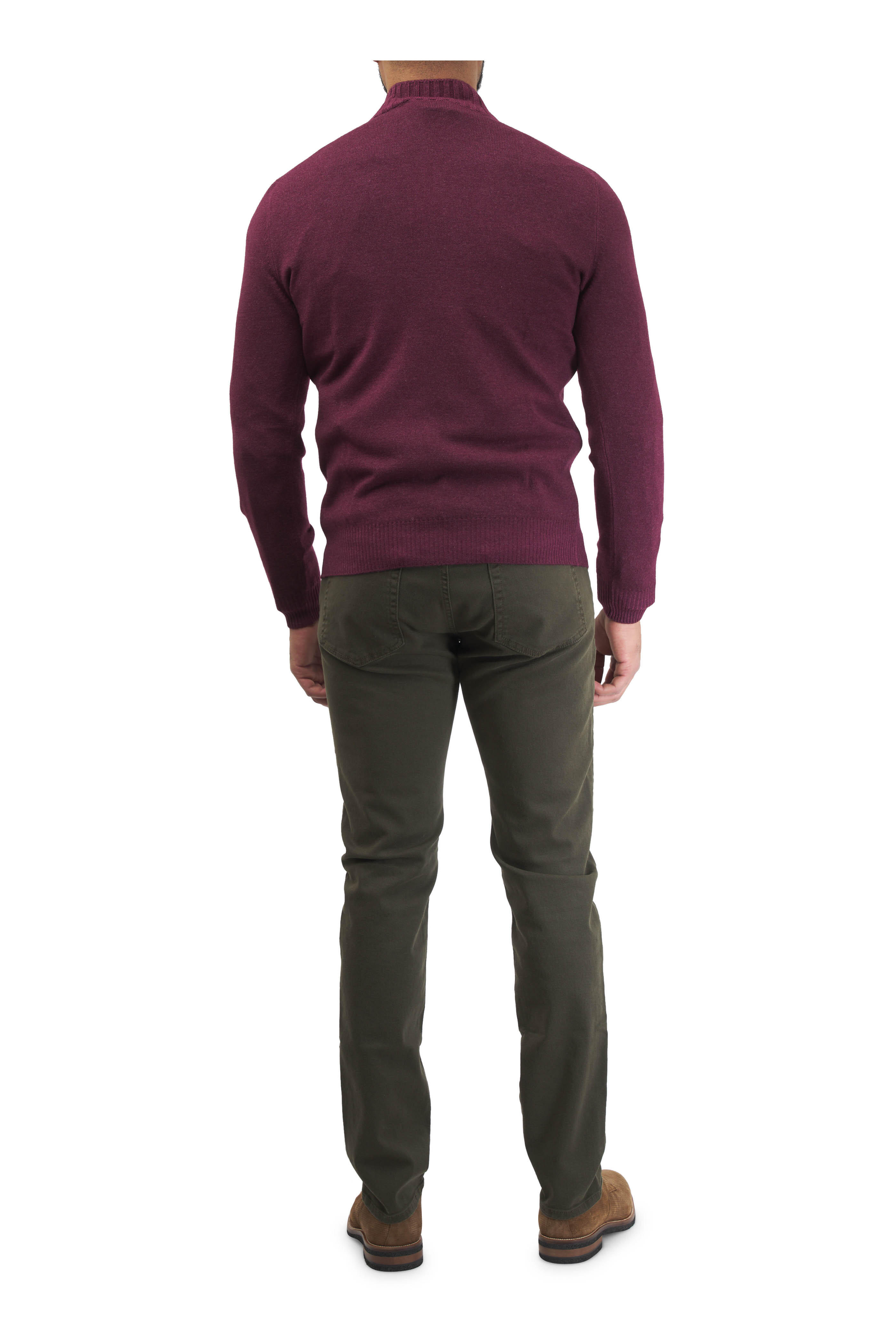 Stand collar. Quarter-zip placket. Ribbed knit trims. Made in Italy. 80% wool, 10% viscose, 10% cashmere. Hand wash.