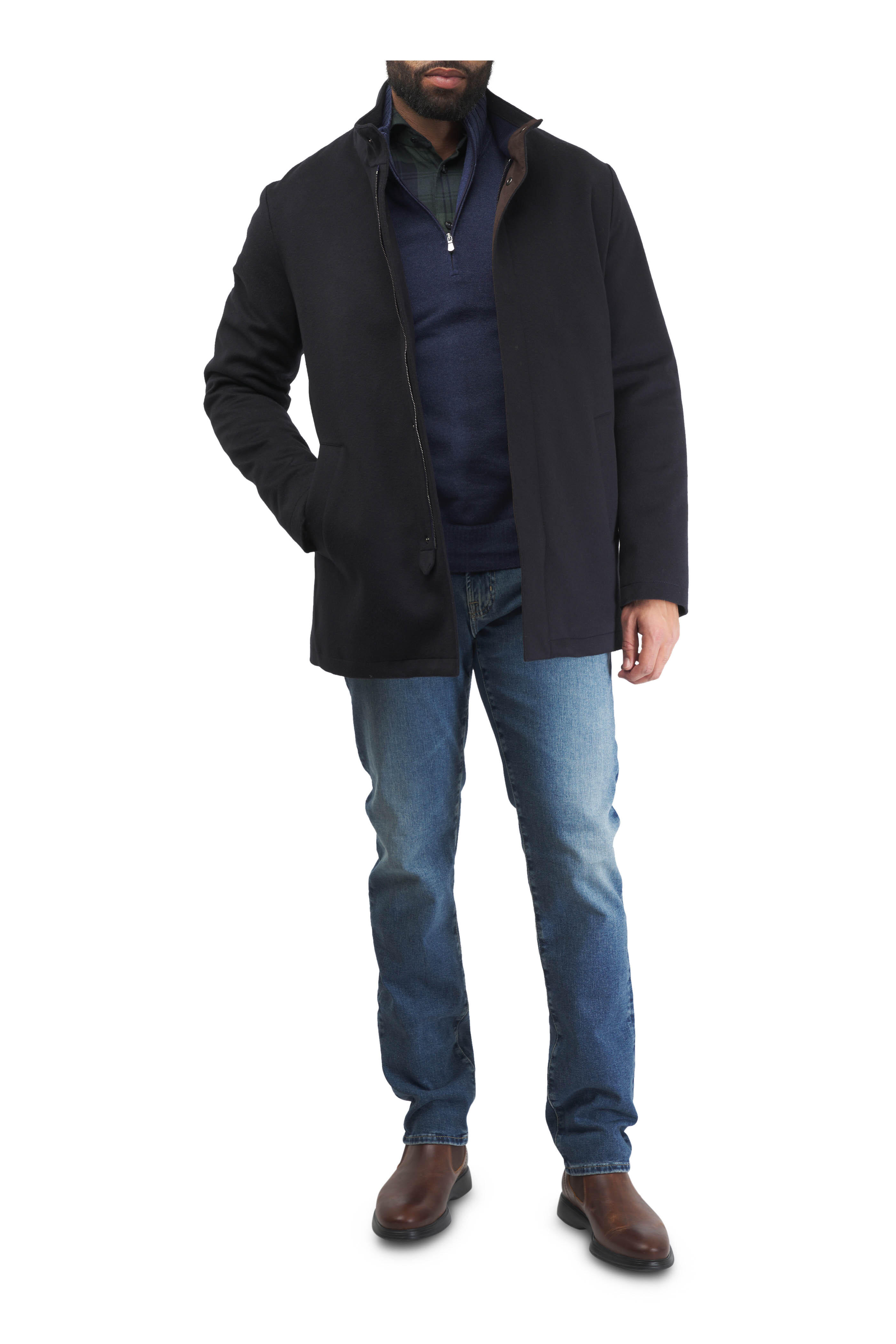 Stand collar. Quarter-zip placket. Ribbed knit trims. Made in Italy. 80% wool, 10% viscose, 10% cashmere. Hand wash.
