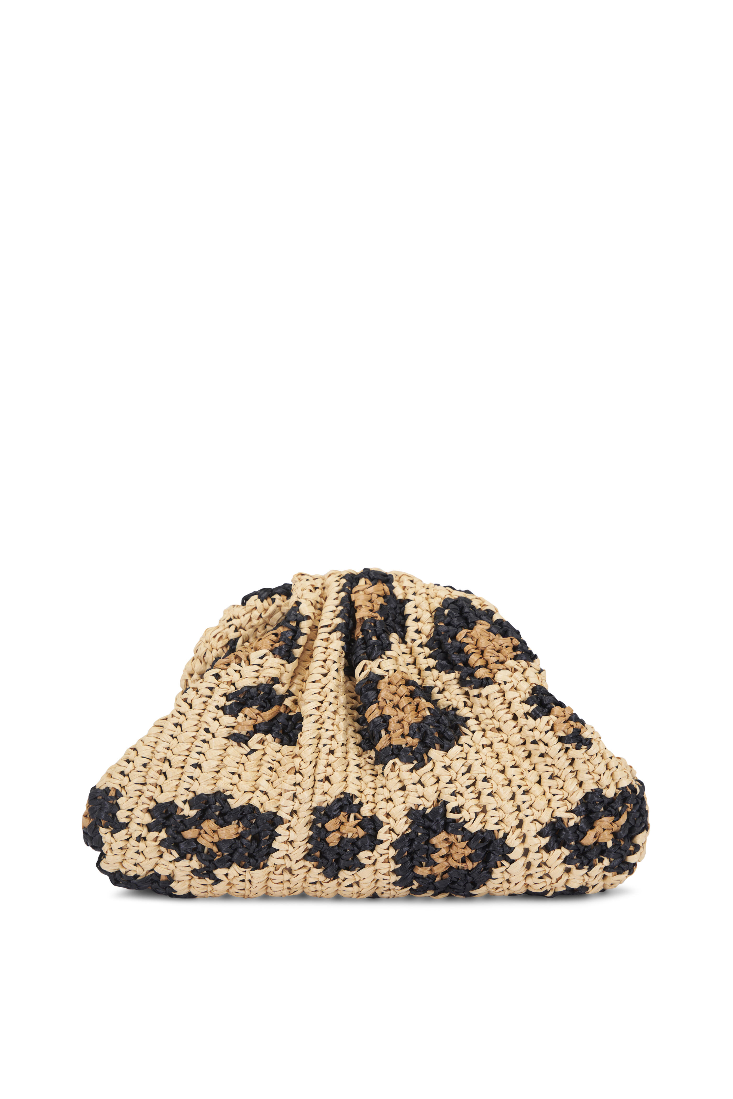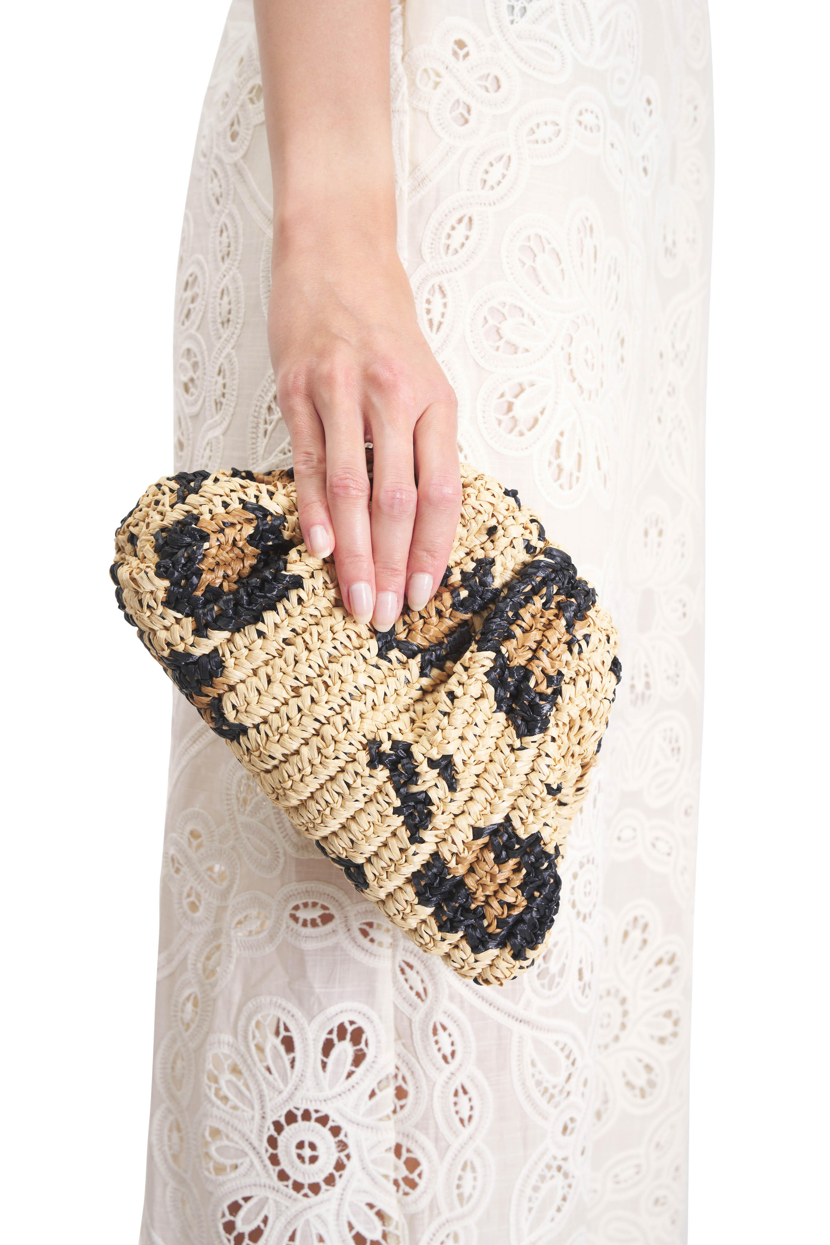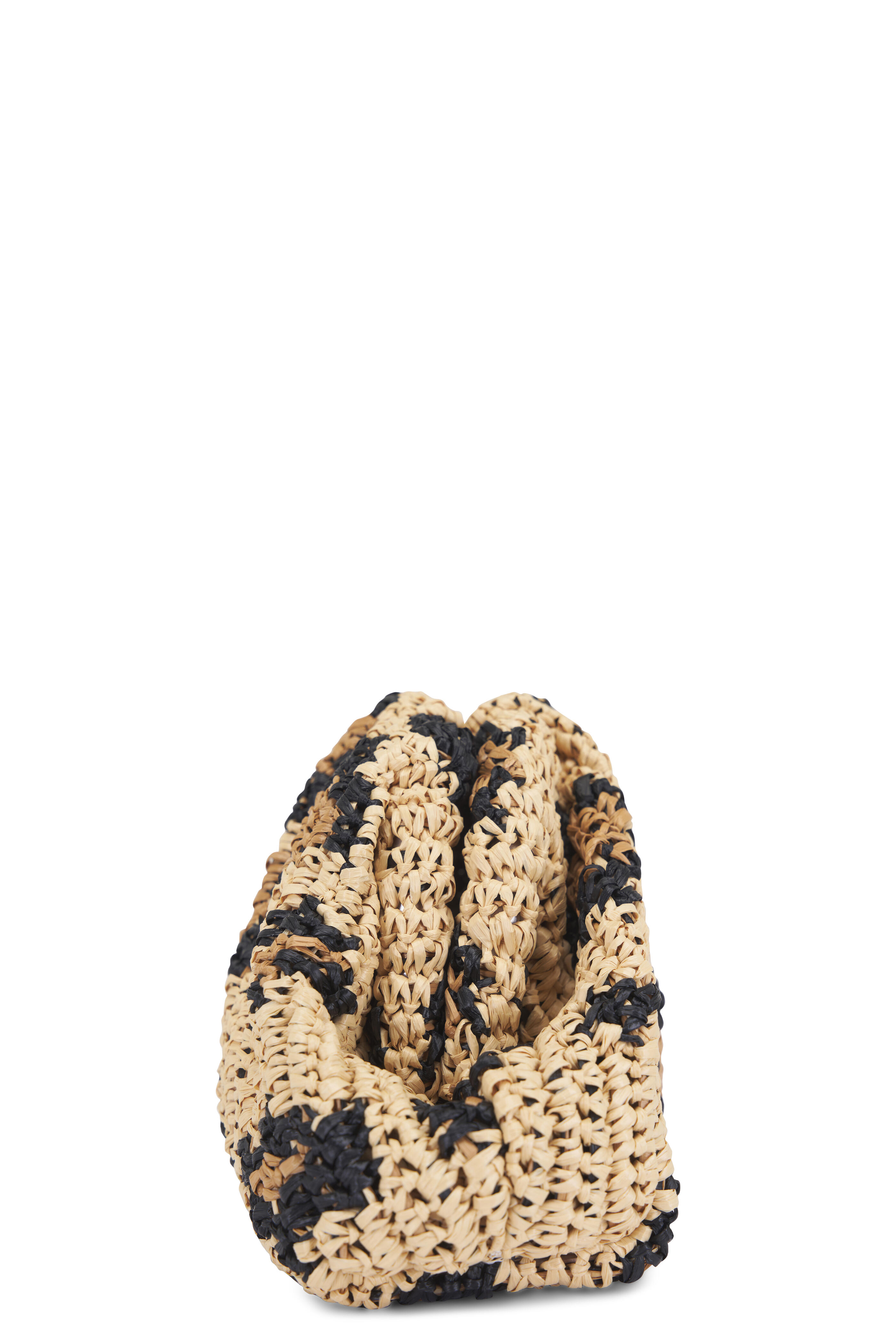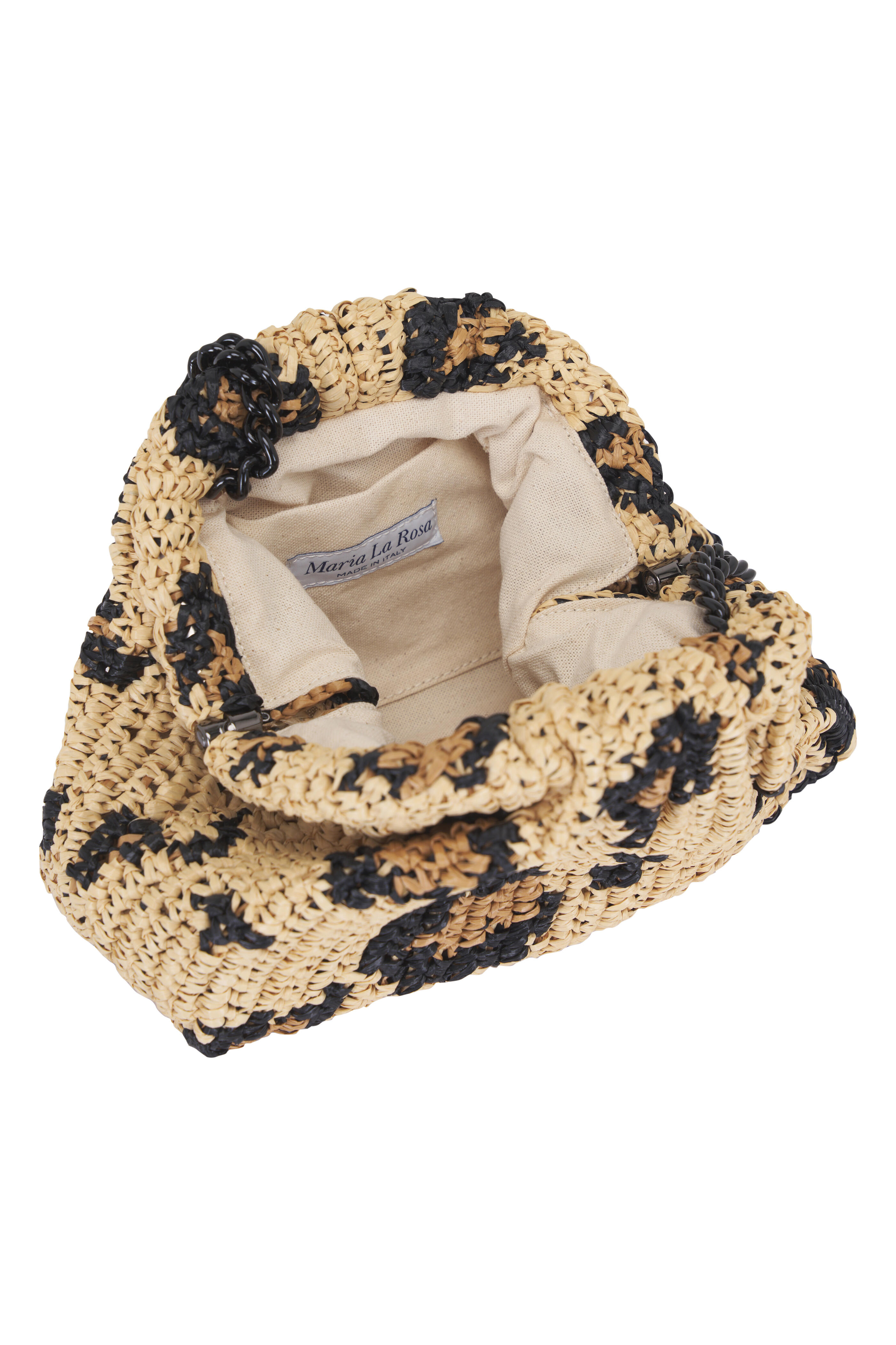 Handwoven raffia. Black metal shoulder chain. Hinge closure. Single compartment; interior wall pocket. Textile lining. Made in Italy. Width: 22 cm. Height: 16 cm. Depth: 8 cm.