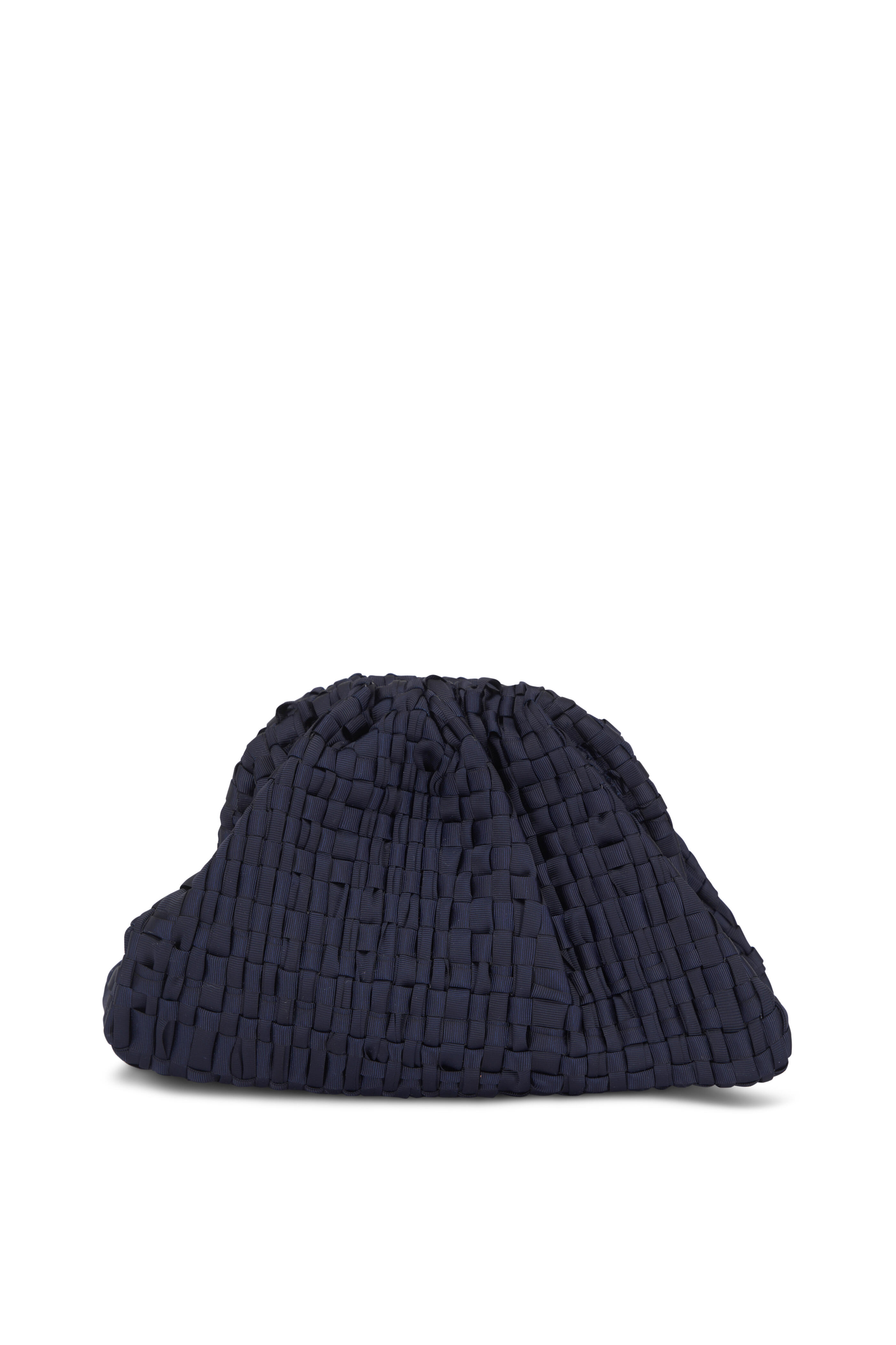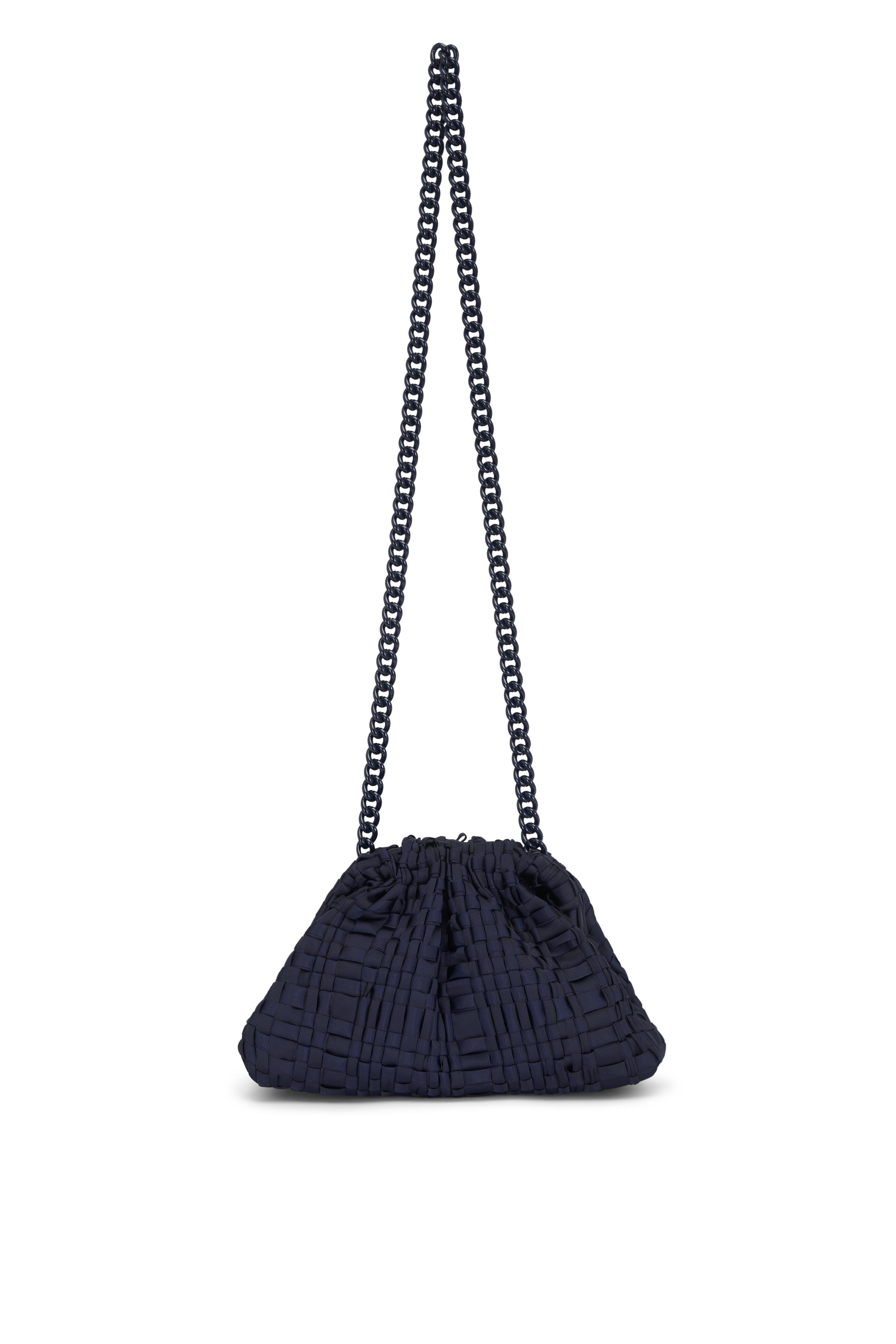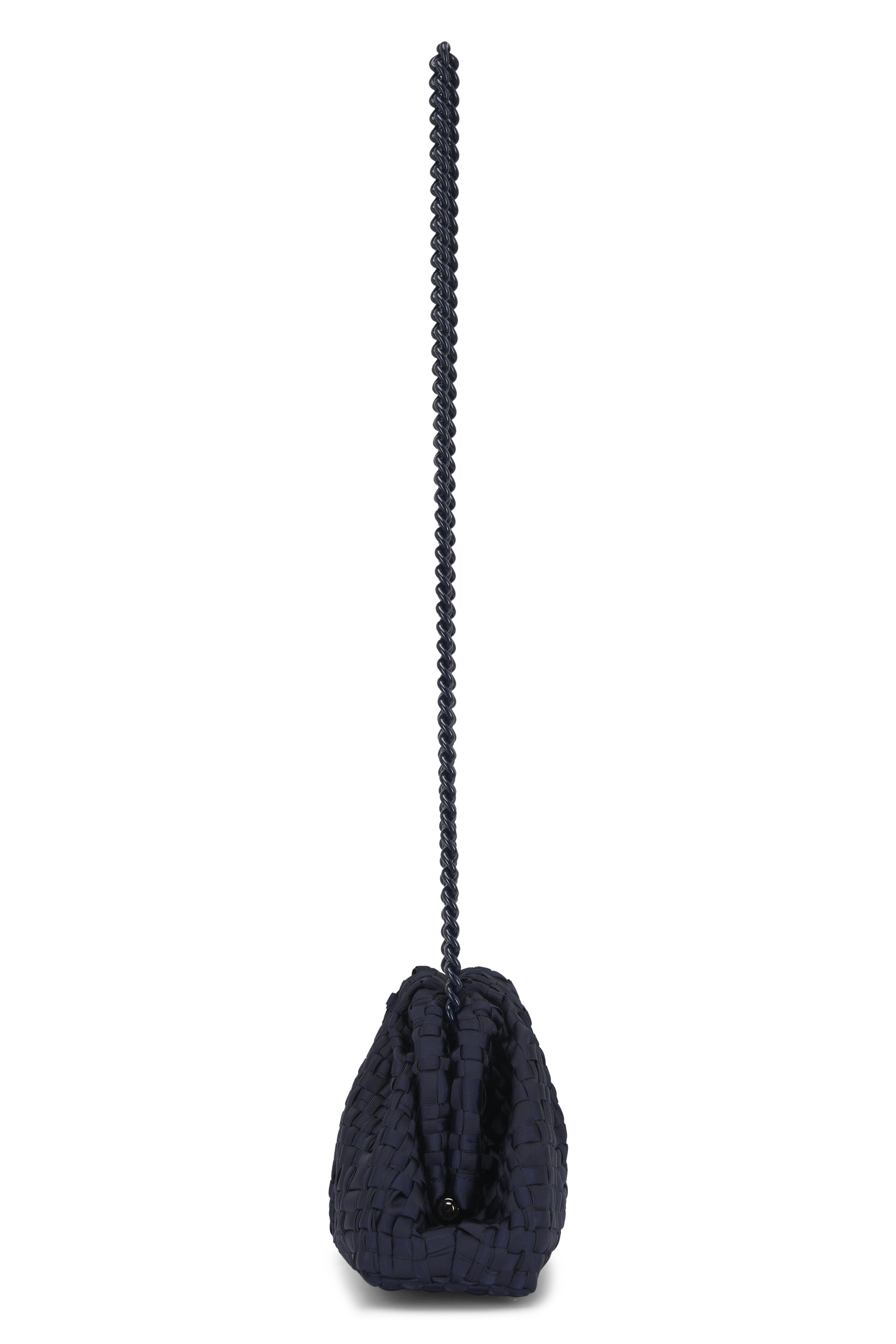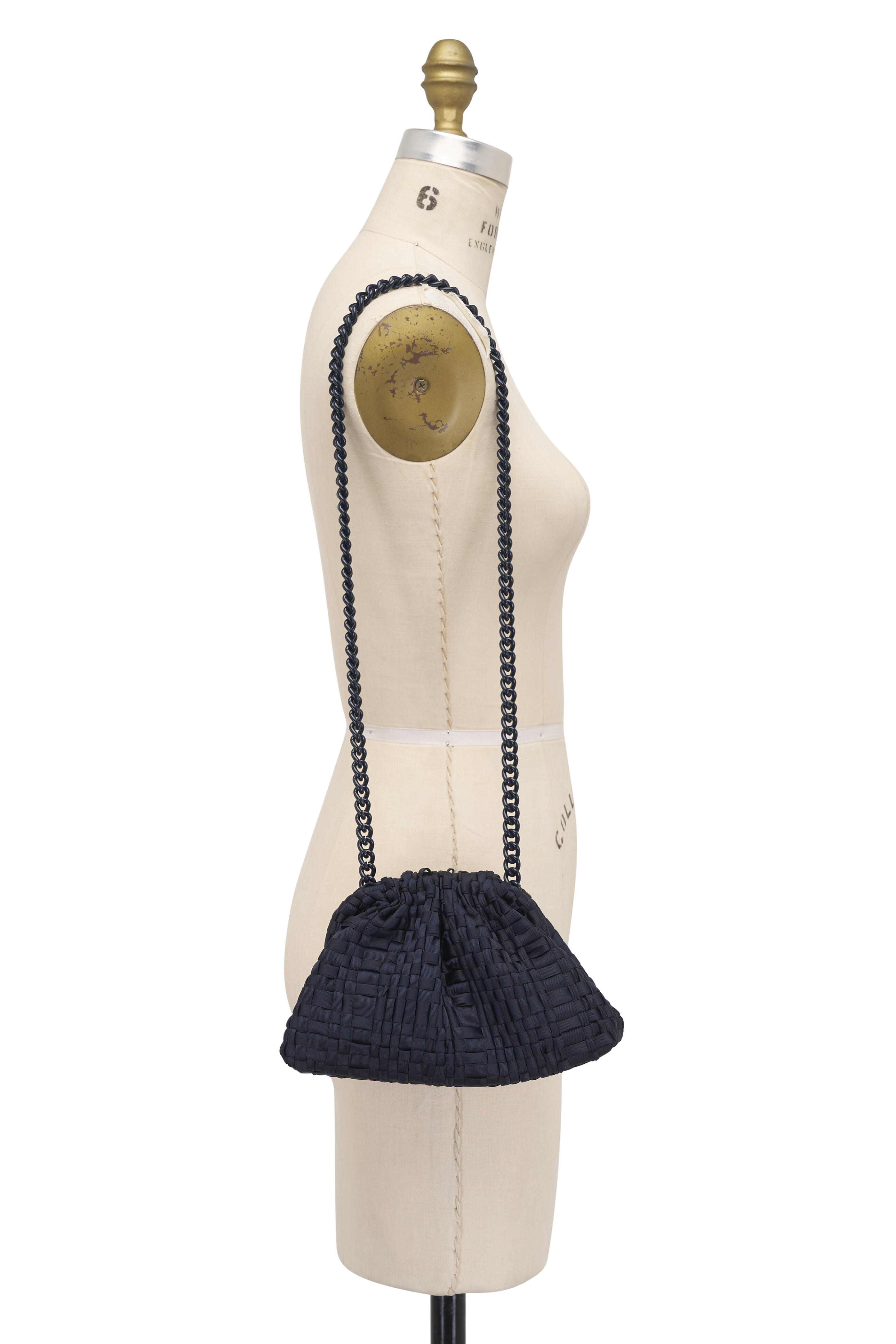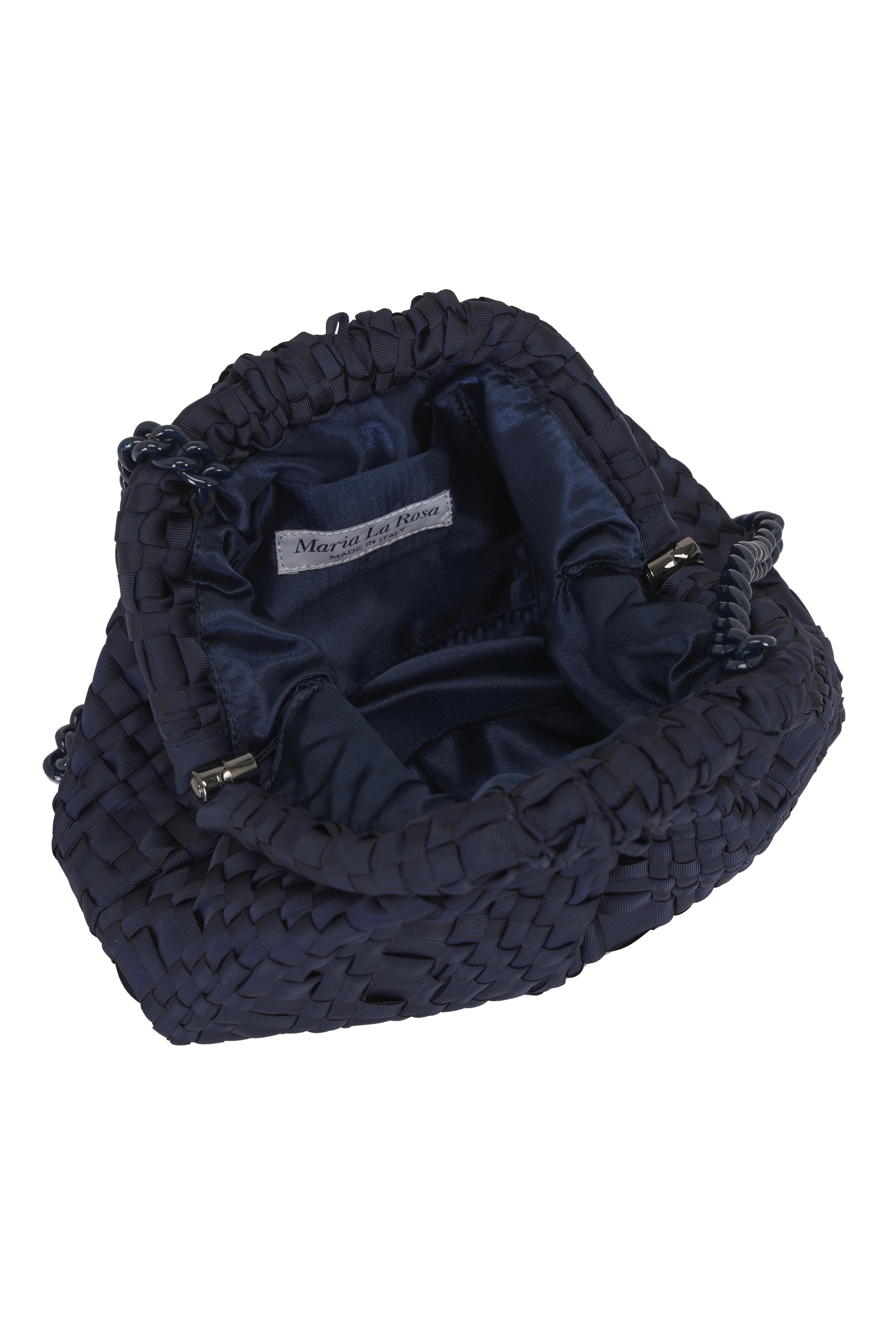 Hand woven grosgrain ribbon. Navy metal shoulder chain. Hinge closure. Single compartment; interior wall pocket. Satin lining. Made in Italy. Width; 9 ½". Height: 6 ½". Depth: 3". Chain drop: 17".