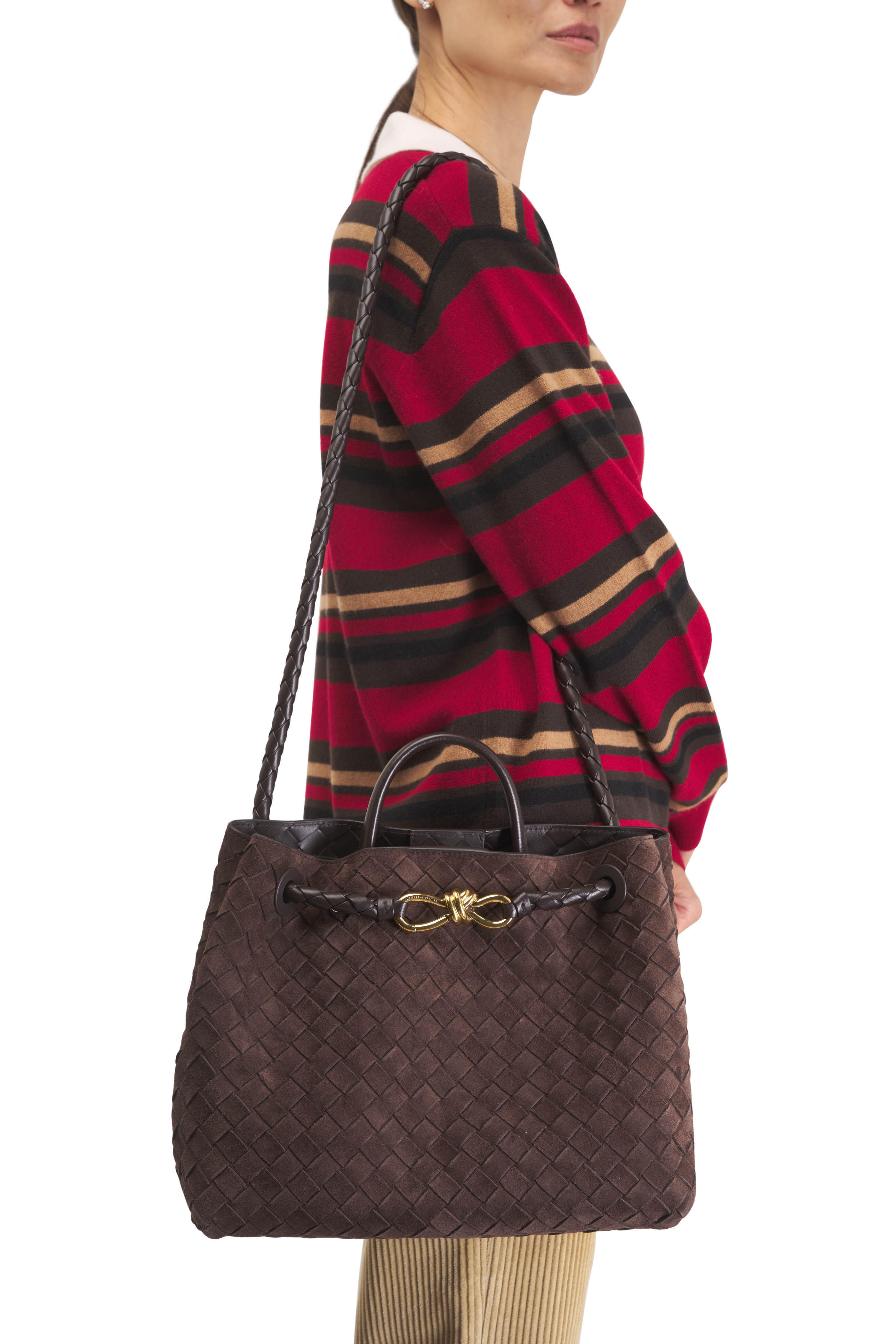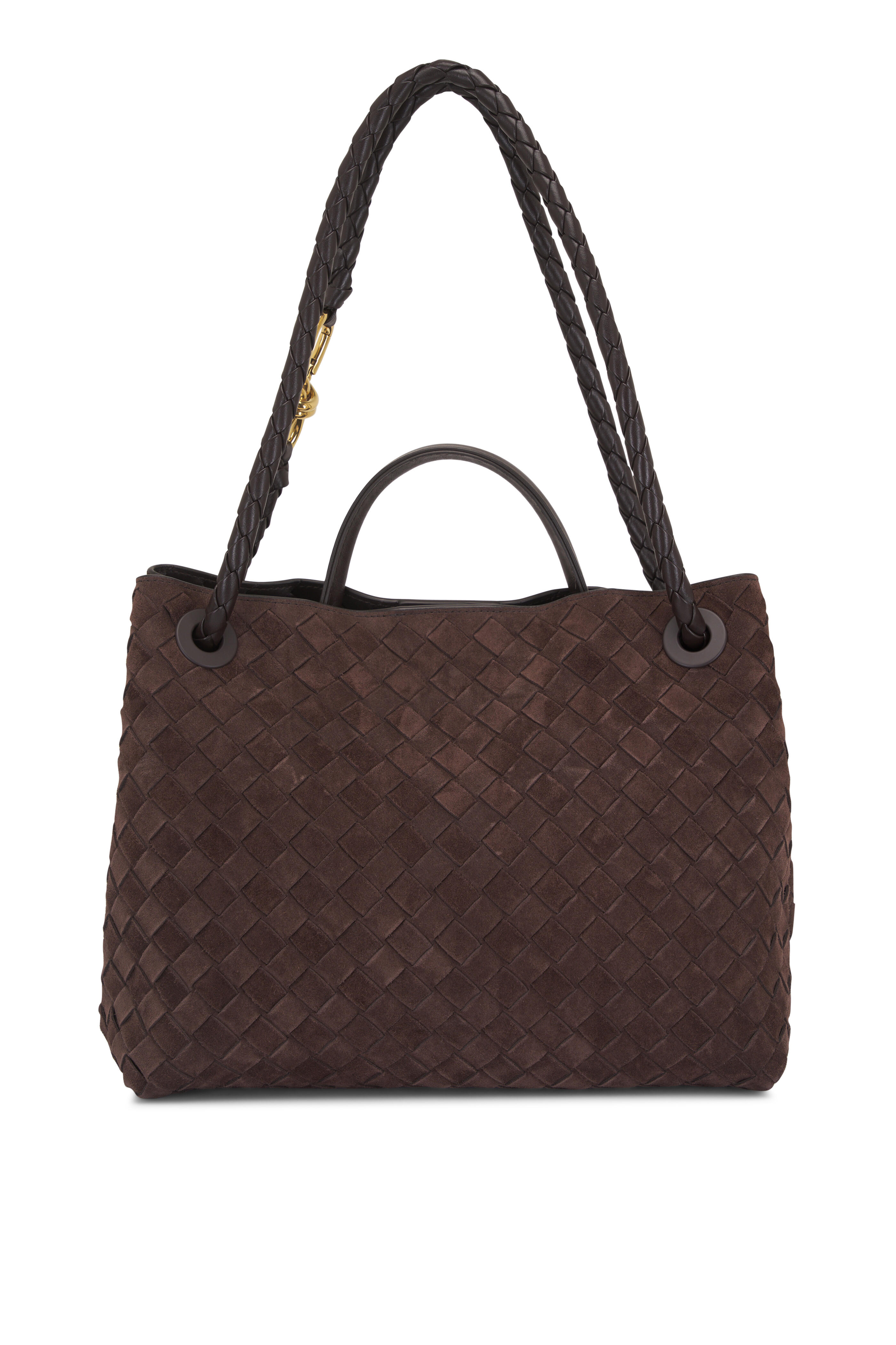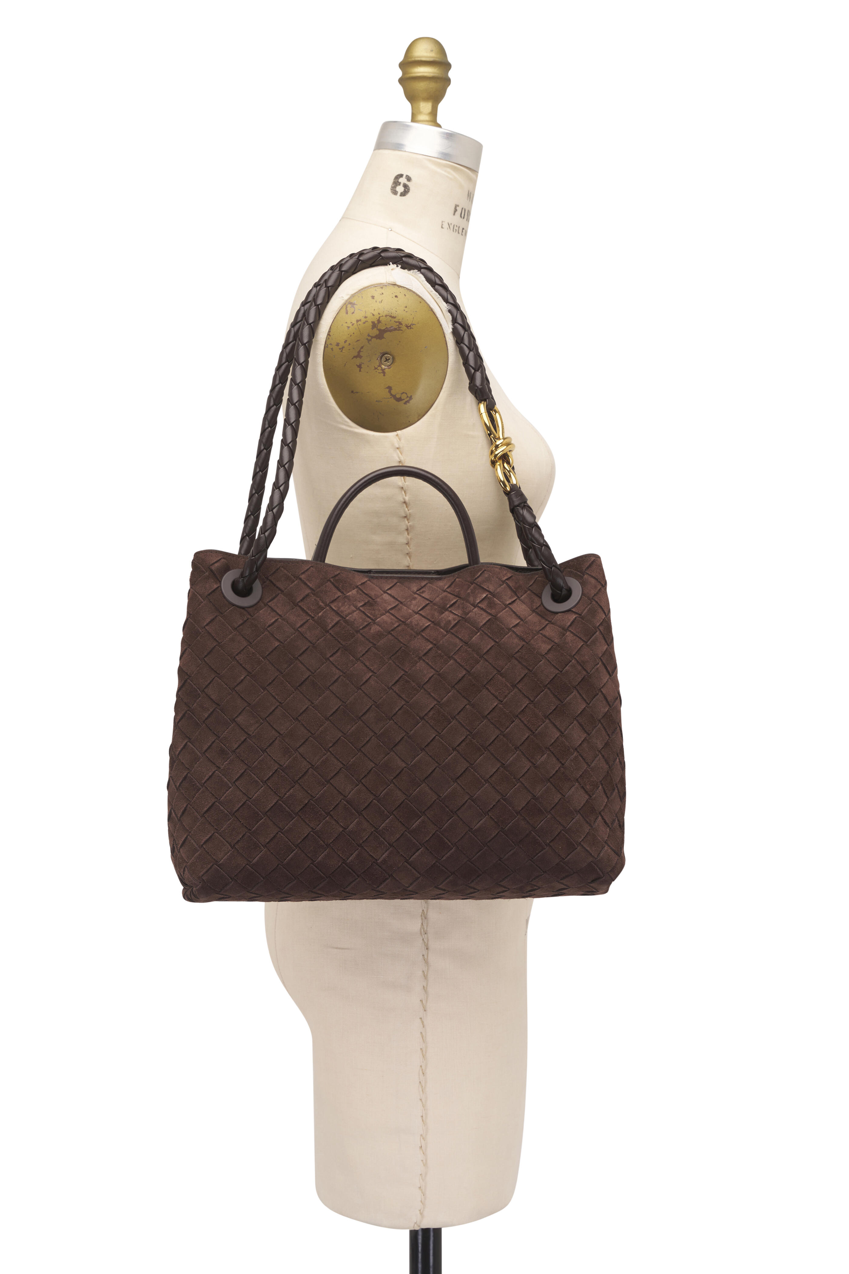Intrecciato suede. Single top handle. Sliding leather crossbody strap. Top magnetic closure. Interior zip pocket; two open pockets. Suede bonded Intrecciato lining. Brass finish hardware. Made in Italy. Height: 25 cm | 9.8". Width: 32 cm | 12.6". Depth: 11 cm | 4.3". Handle drop: 9 cm | 3.5". Strap drop: 45 cm | 17.7".