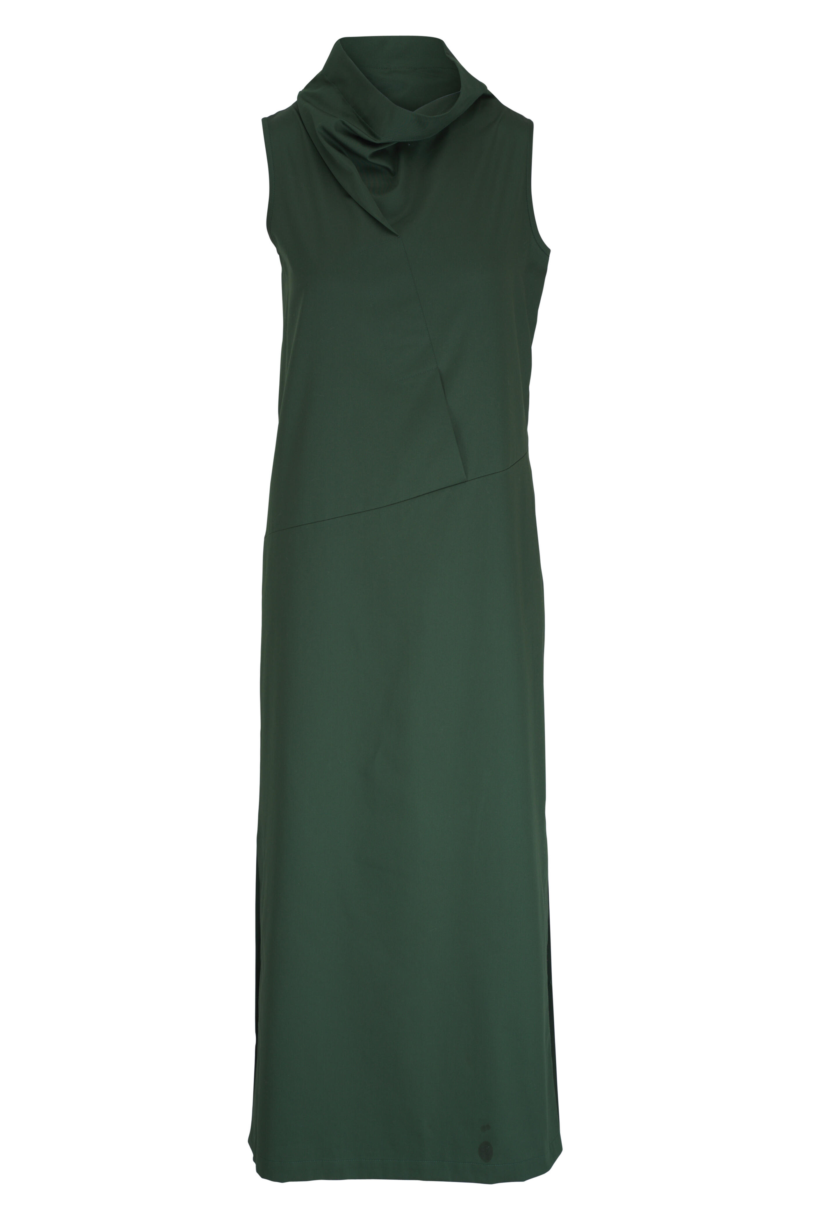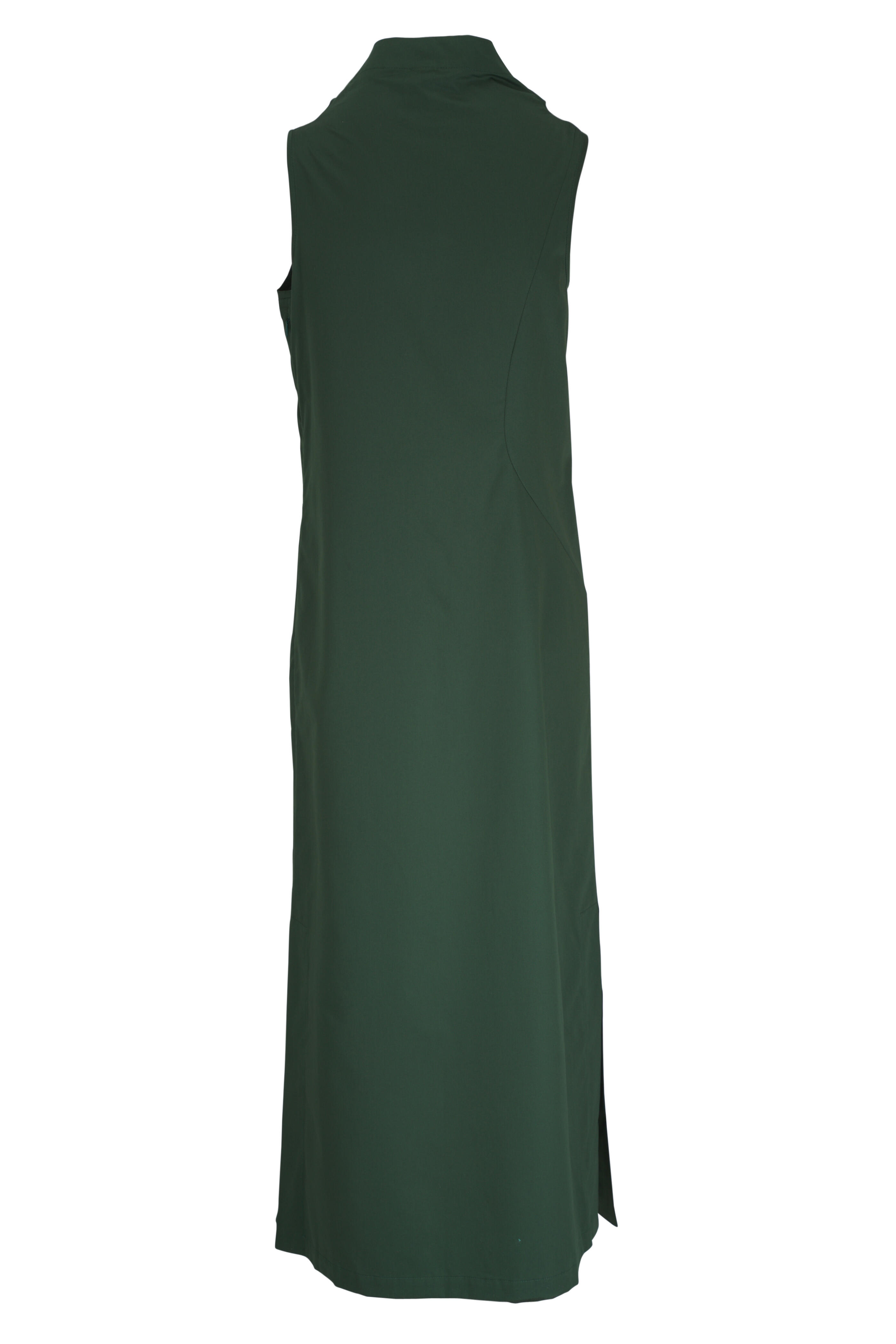 Draped high neckline. Side zip, hook closure. Side slits. Asymmetrical folded front detail. Made in the USA. 100% cotton. Machine wash.