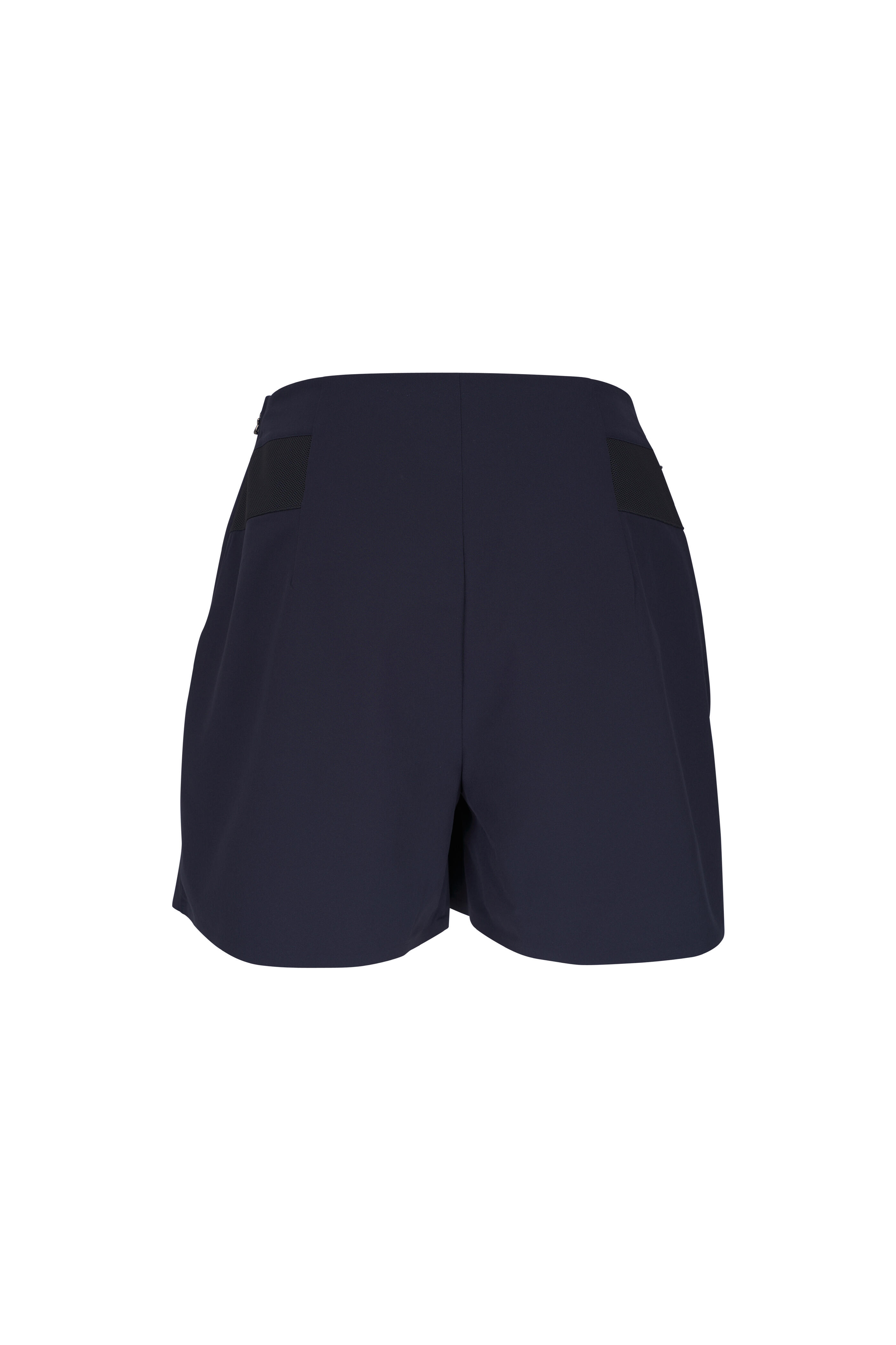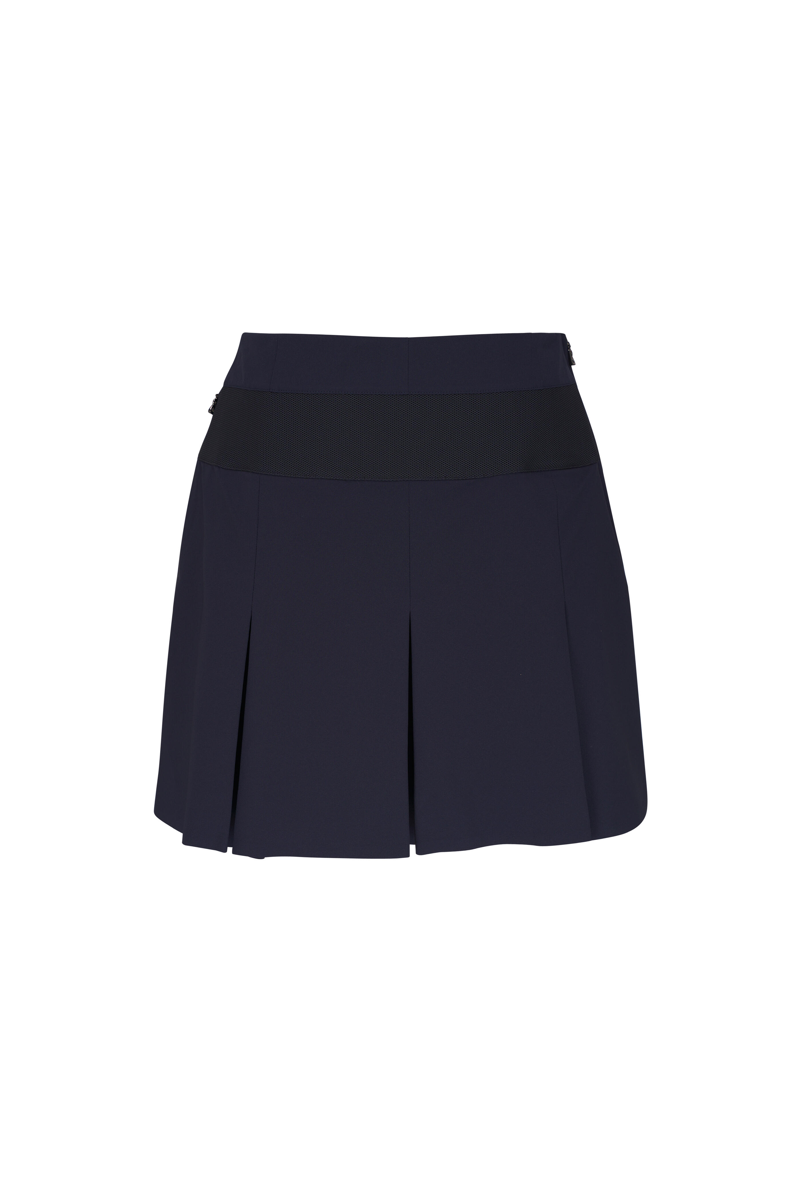 Concealed side zip; button closure. One concealed side zip pocket. Pleated front skirt detail. Imported. 16" length. 88% polyester, 12% elastane. Machine wash.