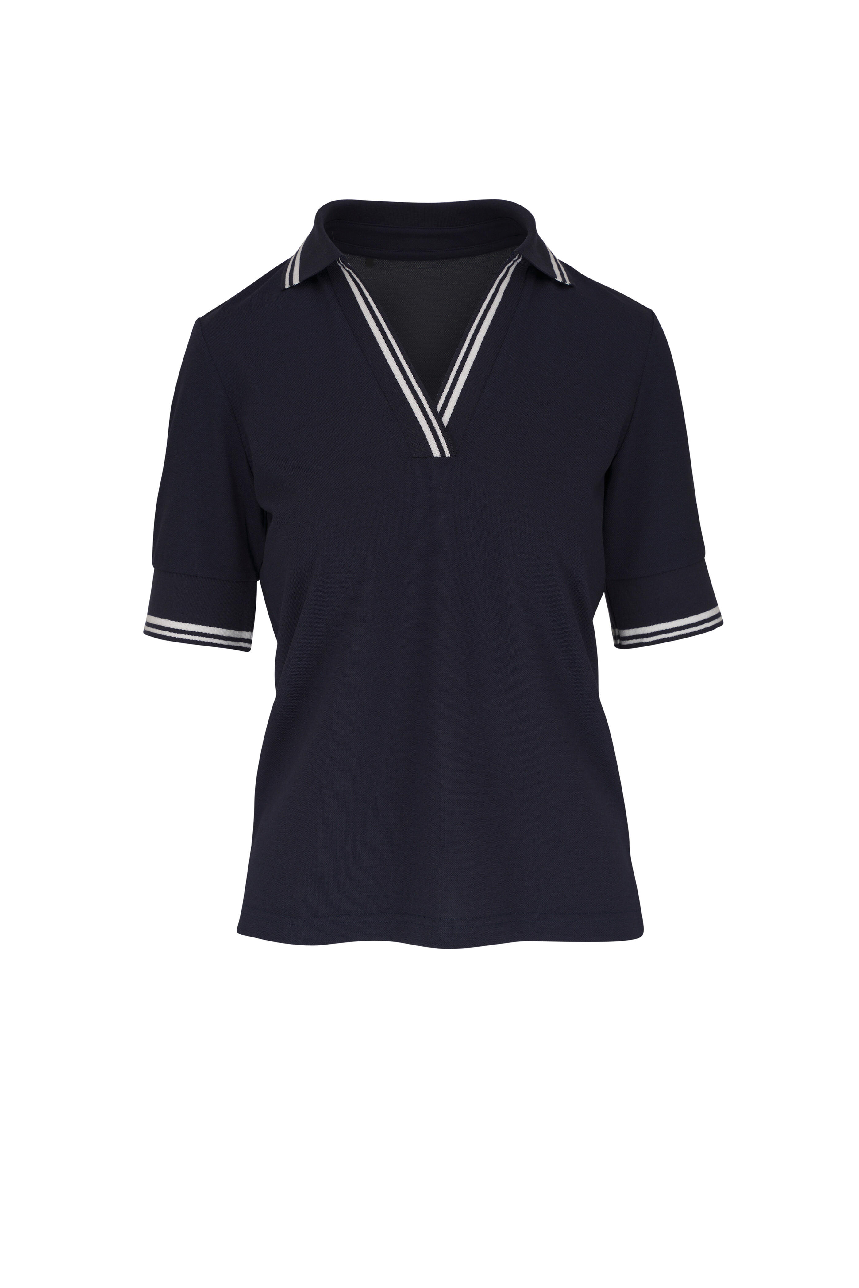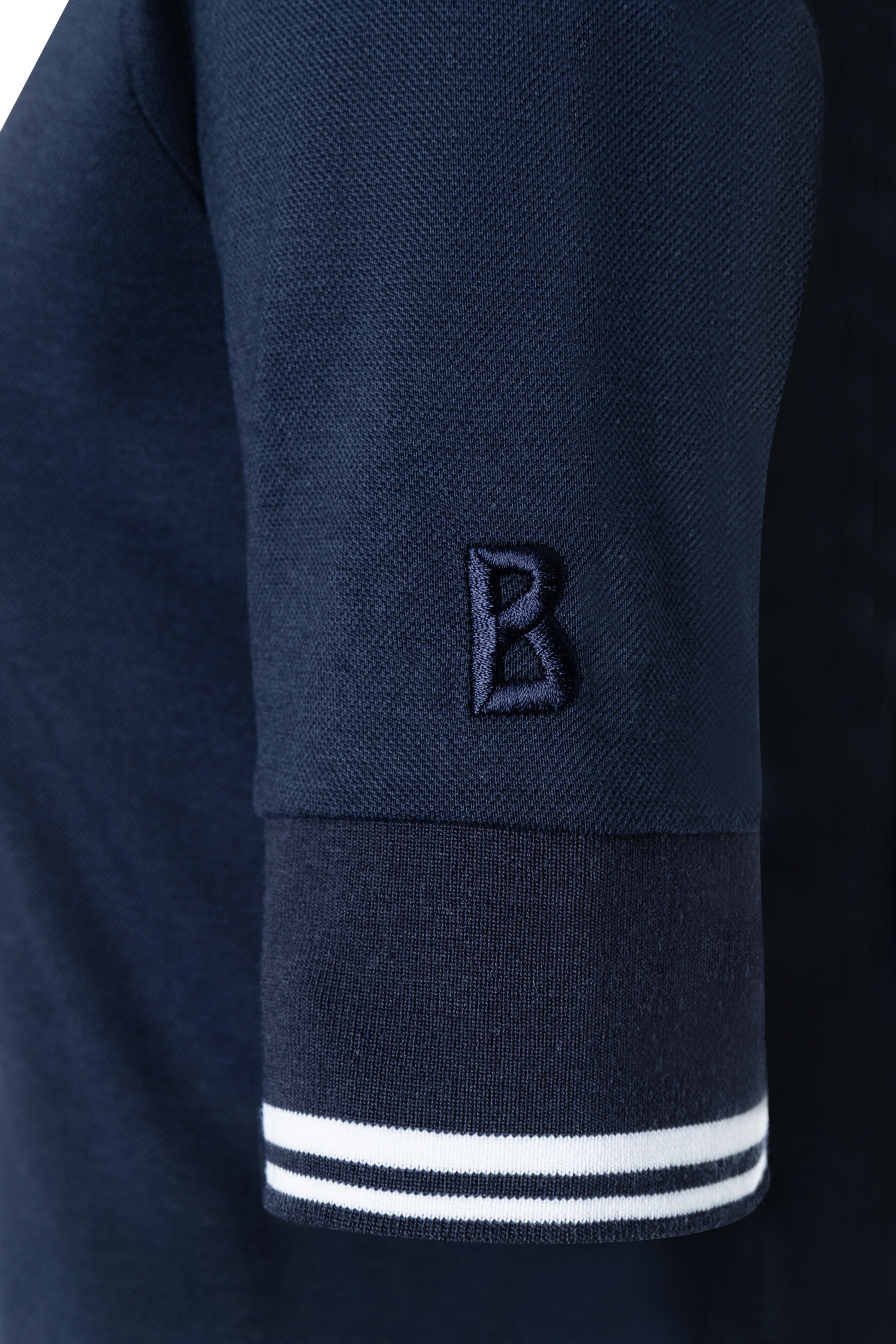 Spread collar; v-neckline. Side slits. Contrast tipping. "B" logo on left sleeve. Imported. Regular fit. 60% cotton, 40% lyocell. Machine wash.