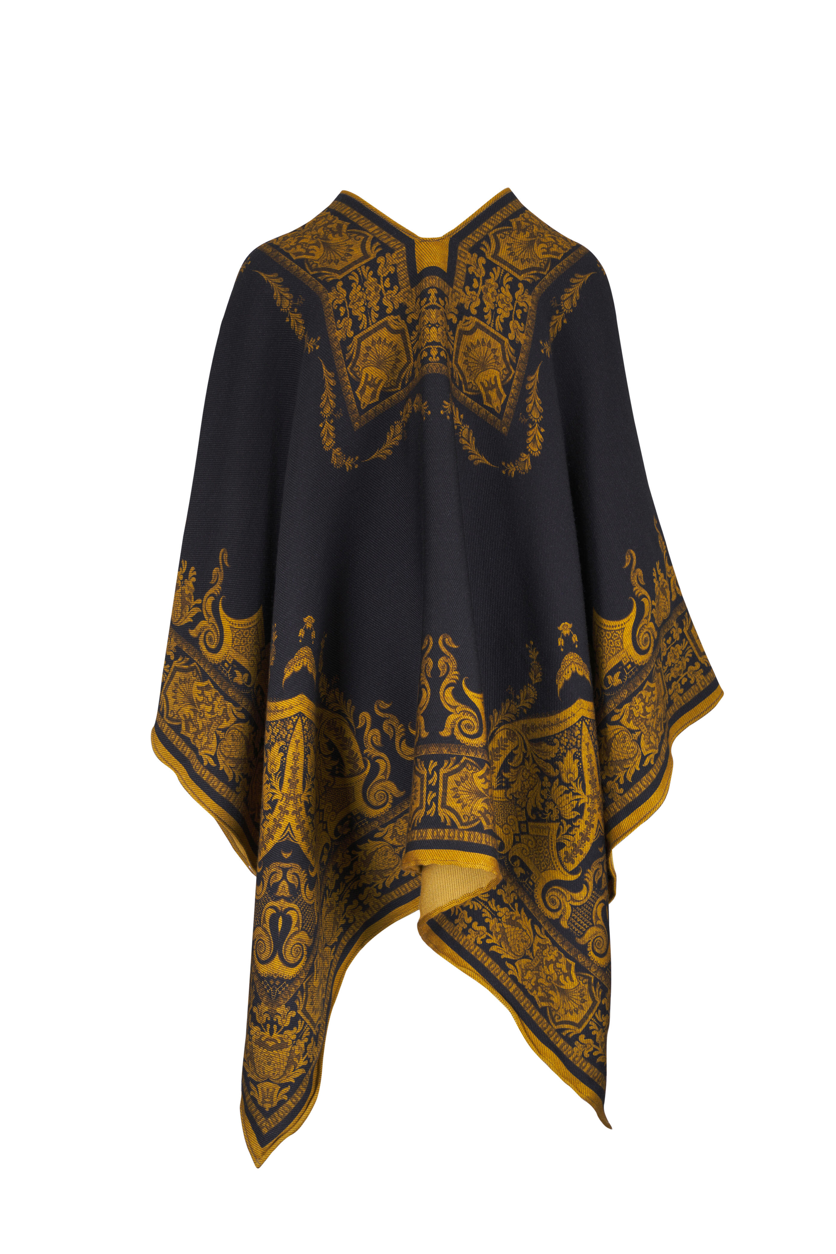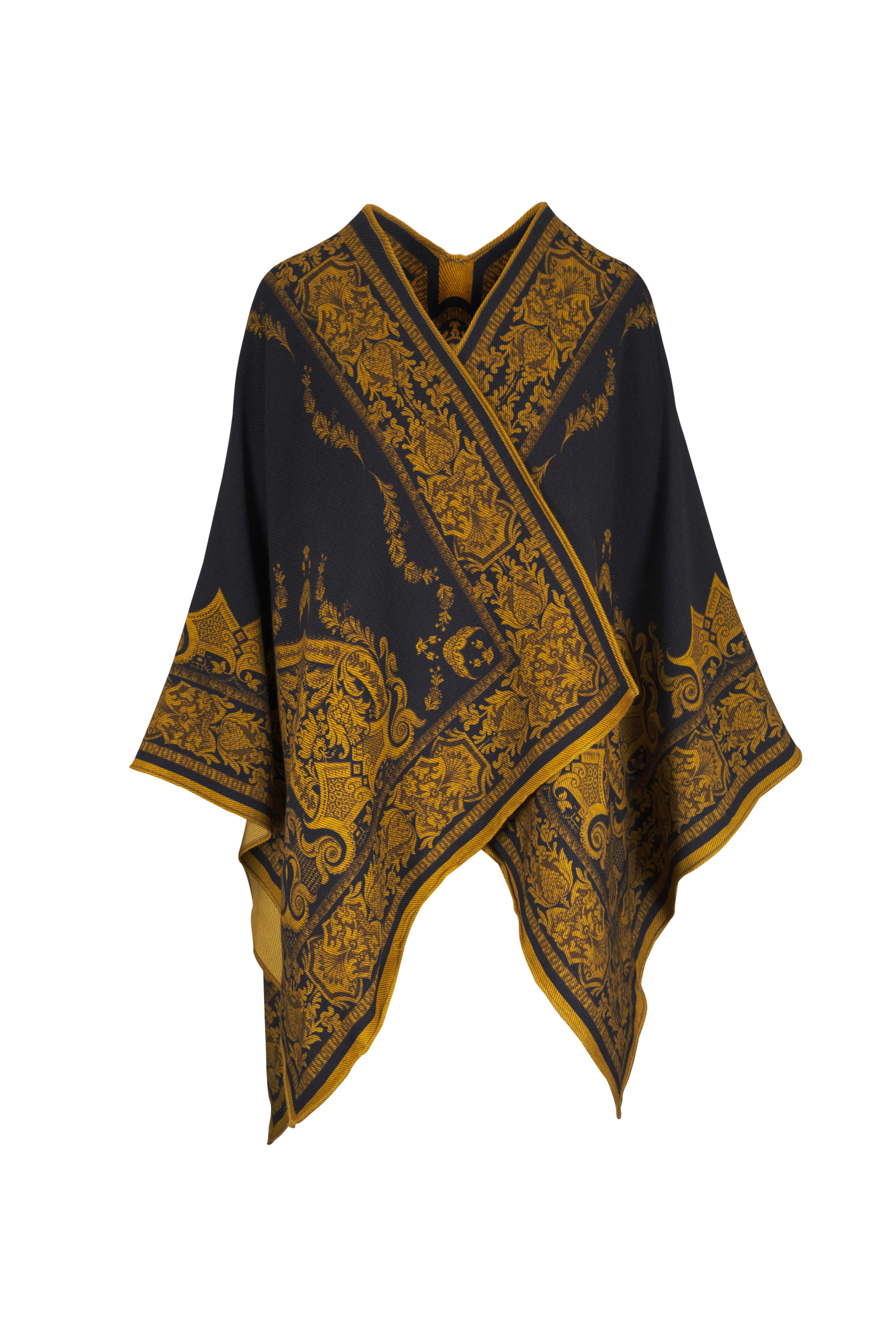 Collarless. Open front. Placed floral paisley print. Ornamental trim on the hem. Made in Italy. 85% wool, 15% modal. Dry clean.