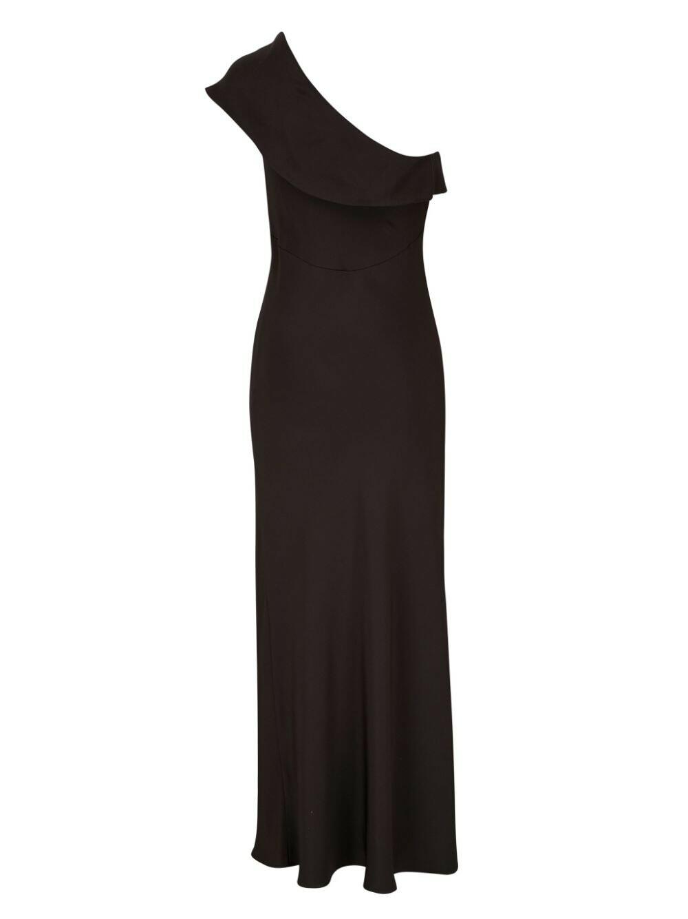 Peter Cohen Black Petal Dress. Single shoulder neckline. Sleeveless. Ruffle detail at bust and shoulder. Slim silhouette. Flare hem. Midi to maxi length. Made in USA. 100% silk.