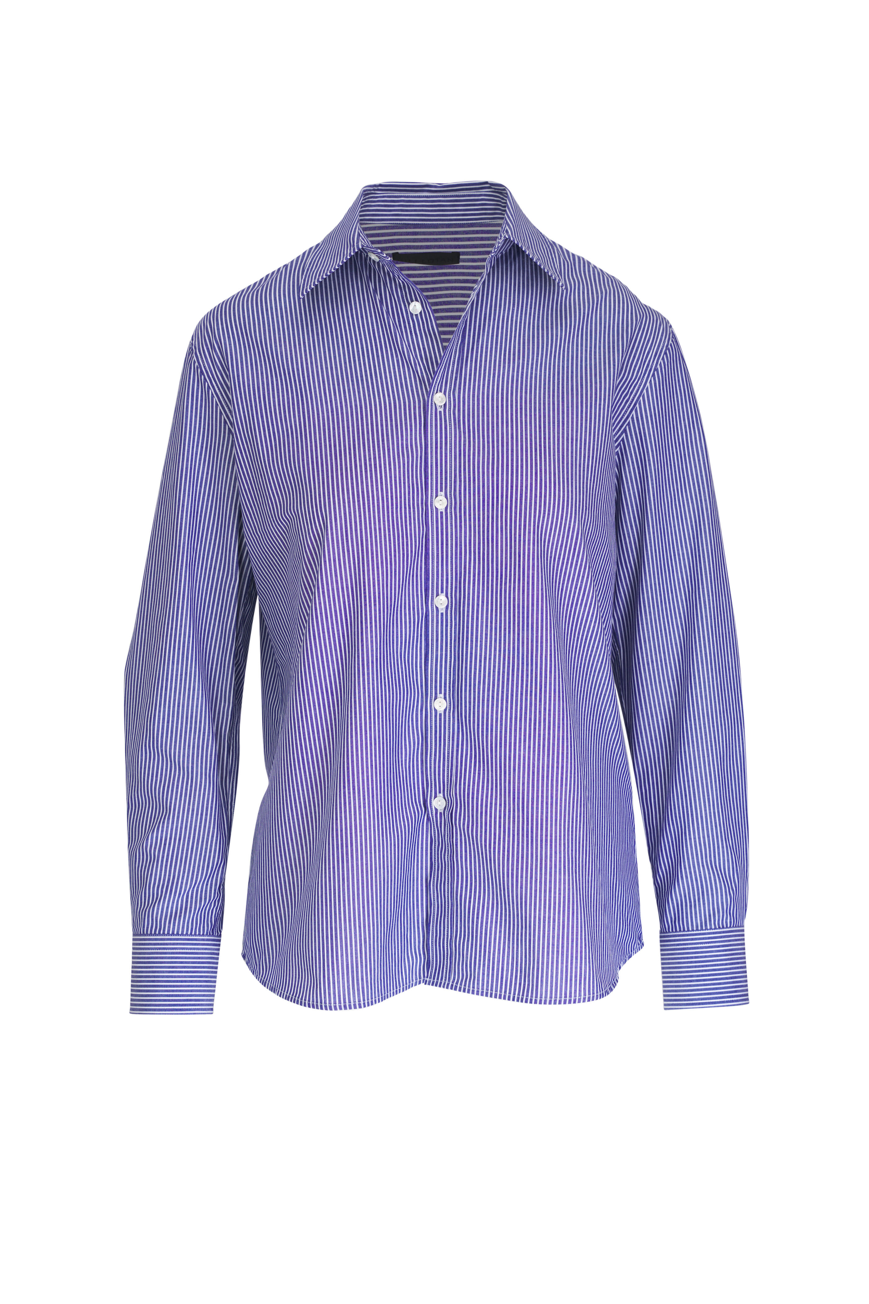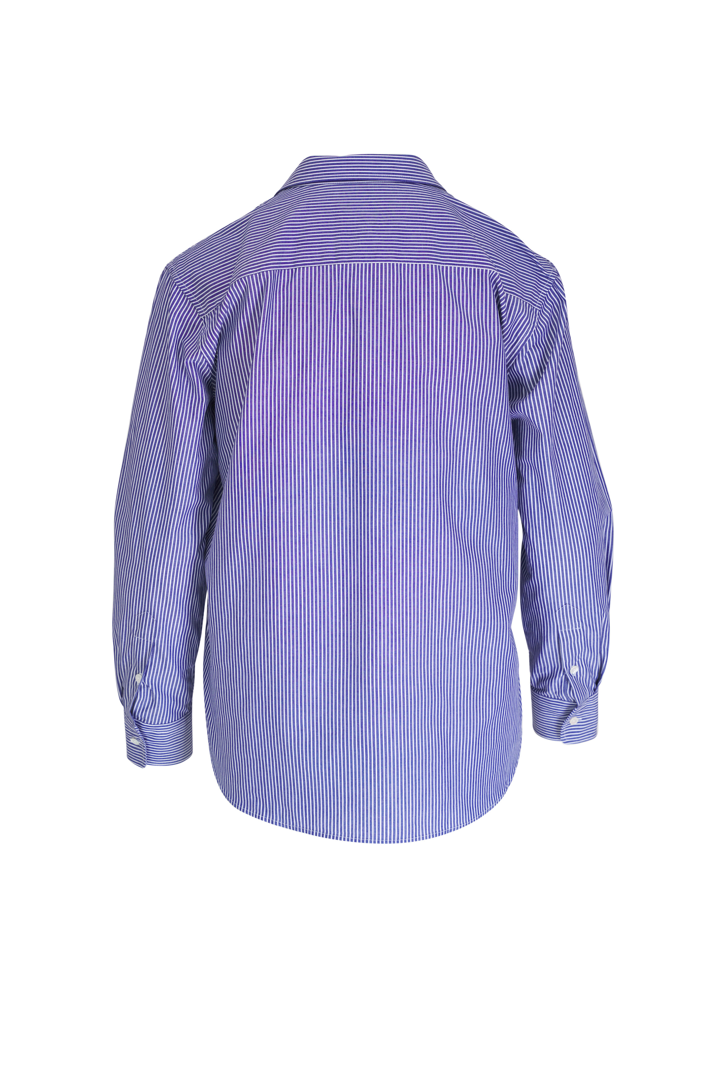 Spread collar. Front button placket. Single button cuffs. Made in the USA. Approximately 24" shoulder to hem (measurements taken from size S). 100% cotton. Machine wash.