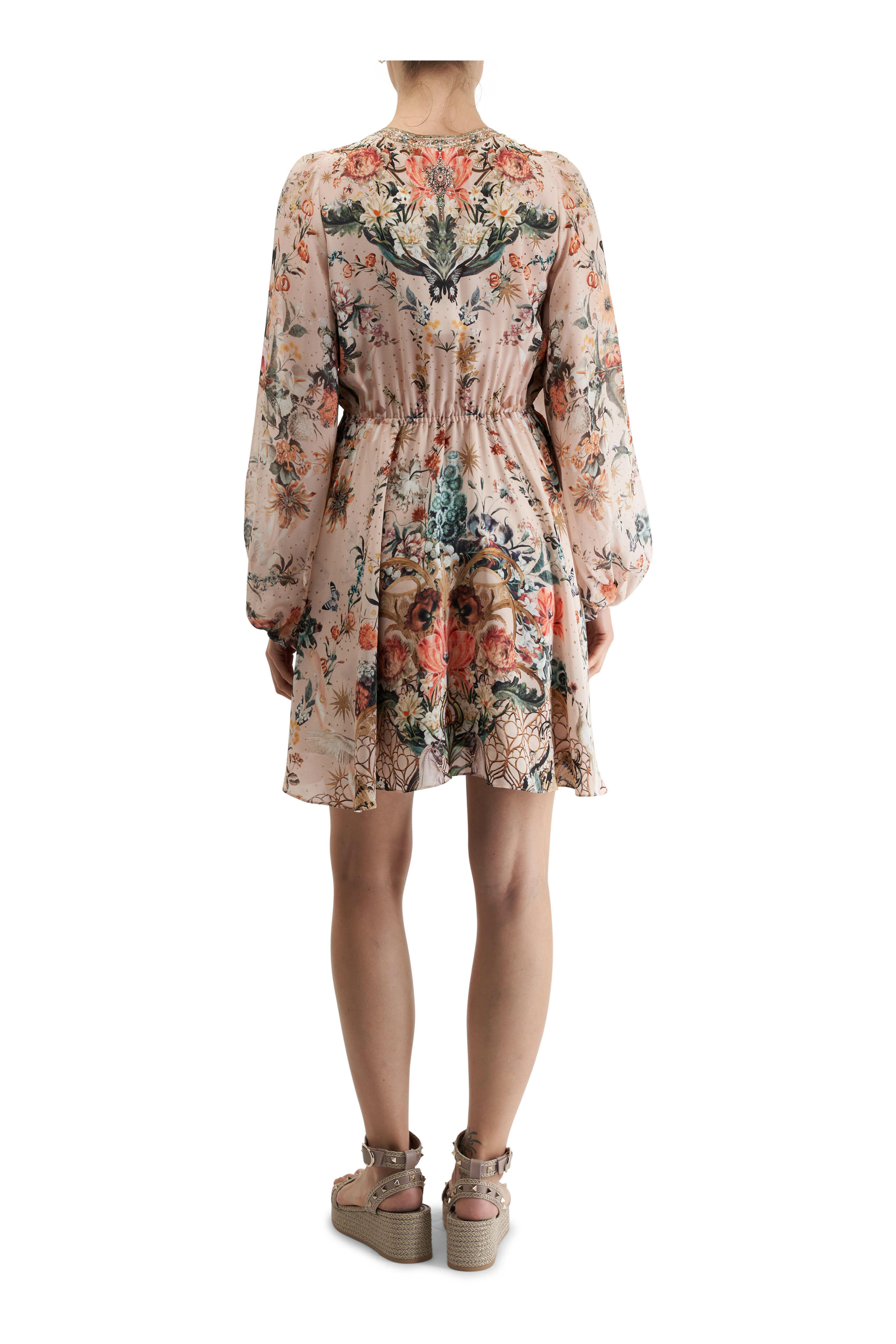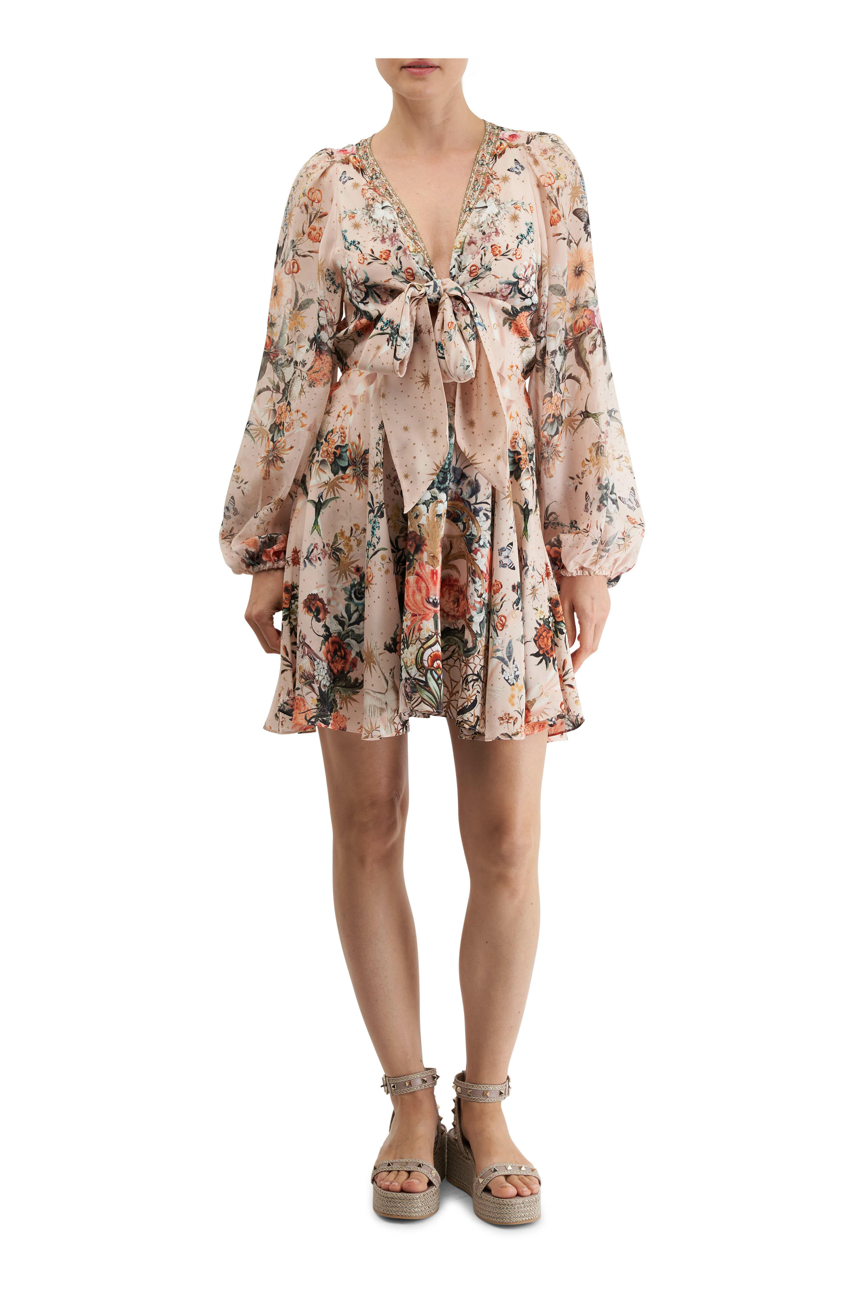 Draped v-neckline; tie front bust detail. Elastic encased back waist. Blouson sleeves; elasticized cuffs. Flared hem. Imported. Shoulder to hem 37". 100% silk; fully lined. Dry clean.