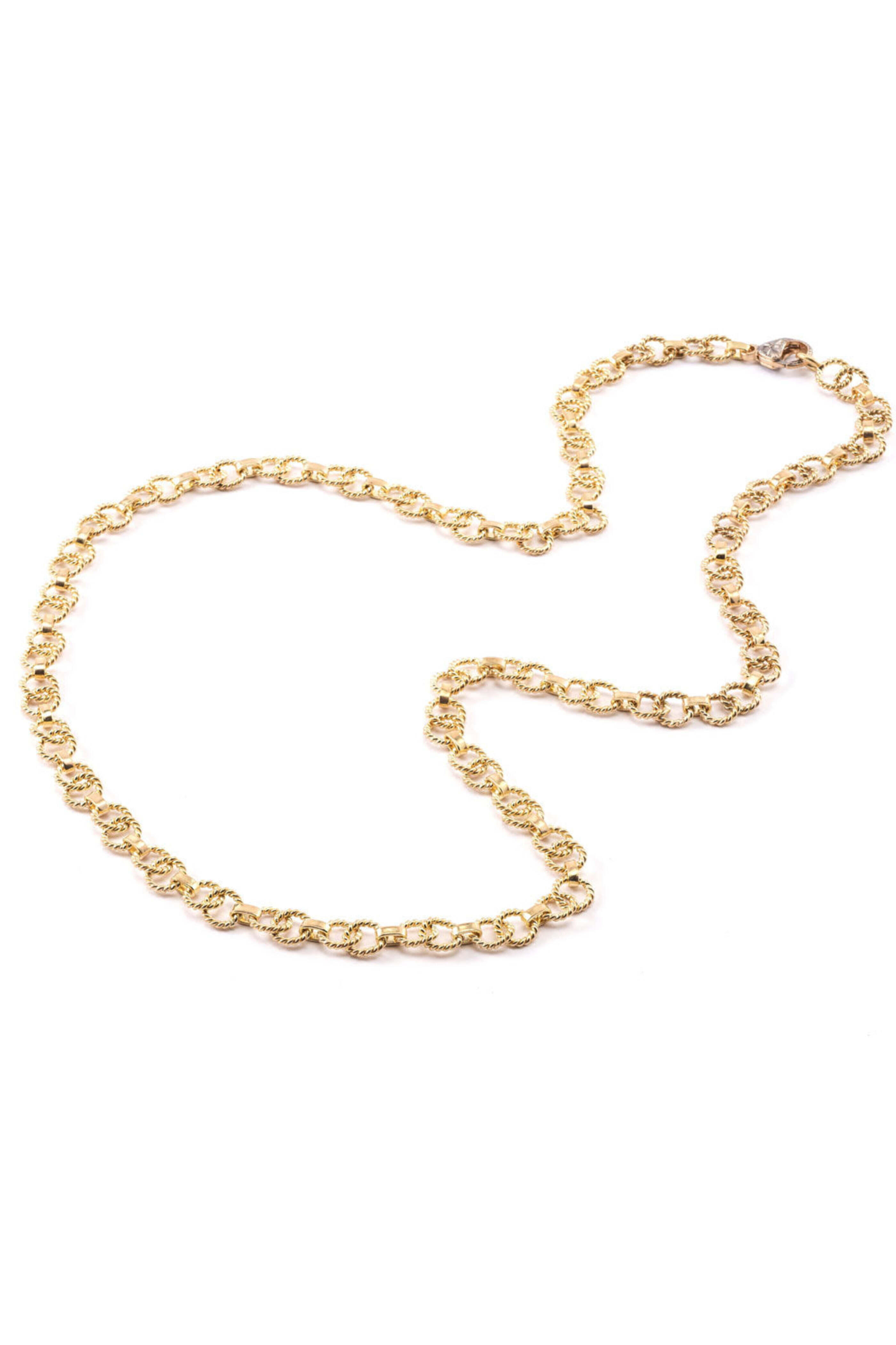 Sylva & Cie Textured Coco Chain Necklace. 18k yellow gold. Textured link chain. Round links. 22 L. Lobster claw clasp. Made in the USA.