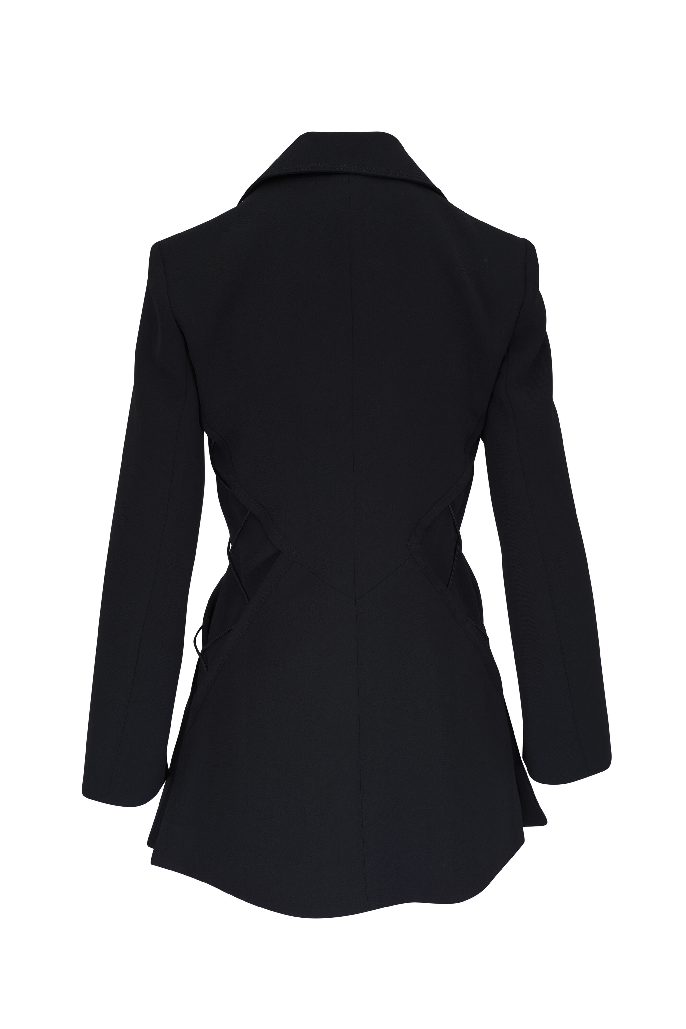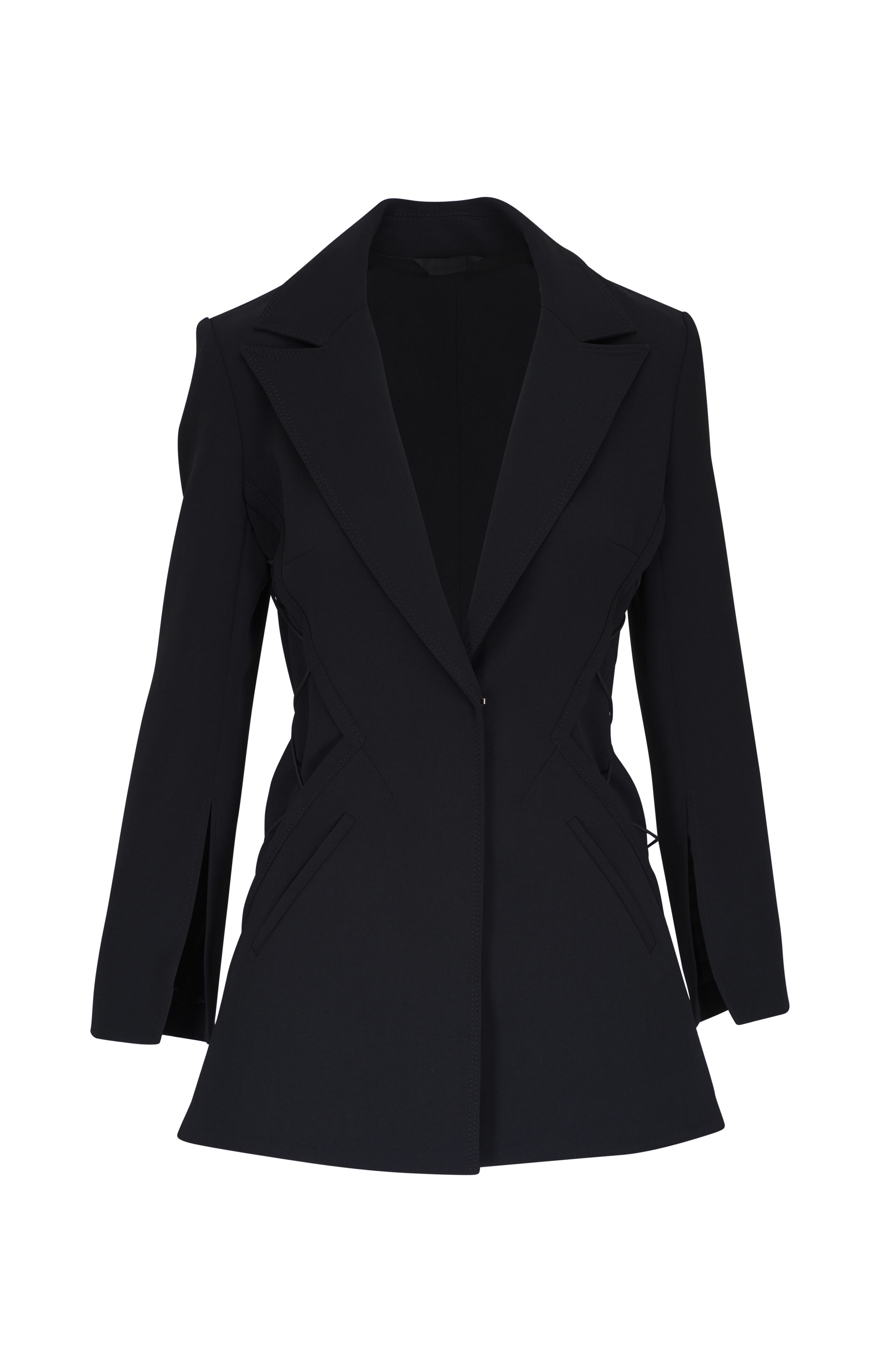 Fully lined. Peak lapels. Hook closure. Side criss-cross tie details. Side angle pockets. Split cuffs. Made in the USA. 100% recyled polyester. Dry clean.