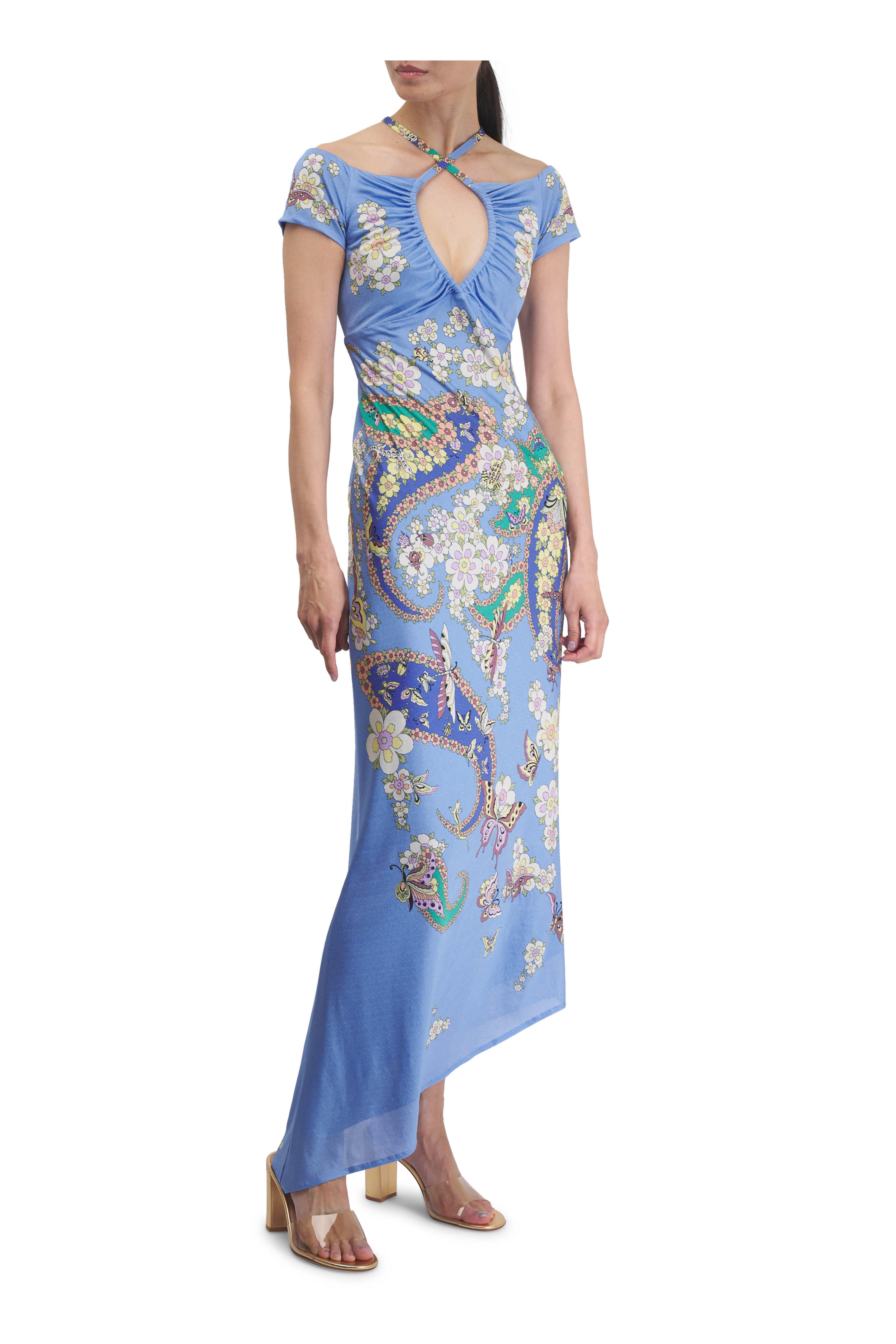 Halter with self-tie at neck; v-neckline. Concealed back zip. Off-the-shoulder cap sleeves. Asymmetrical hem. Made in Italy. Approximately 60" shoulder to hem (measurements taken from size 6). 100% viscose; lined. Dry clean.