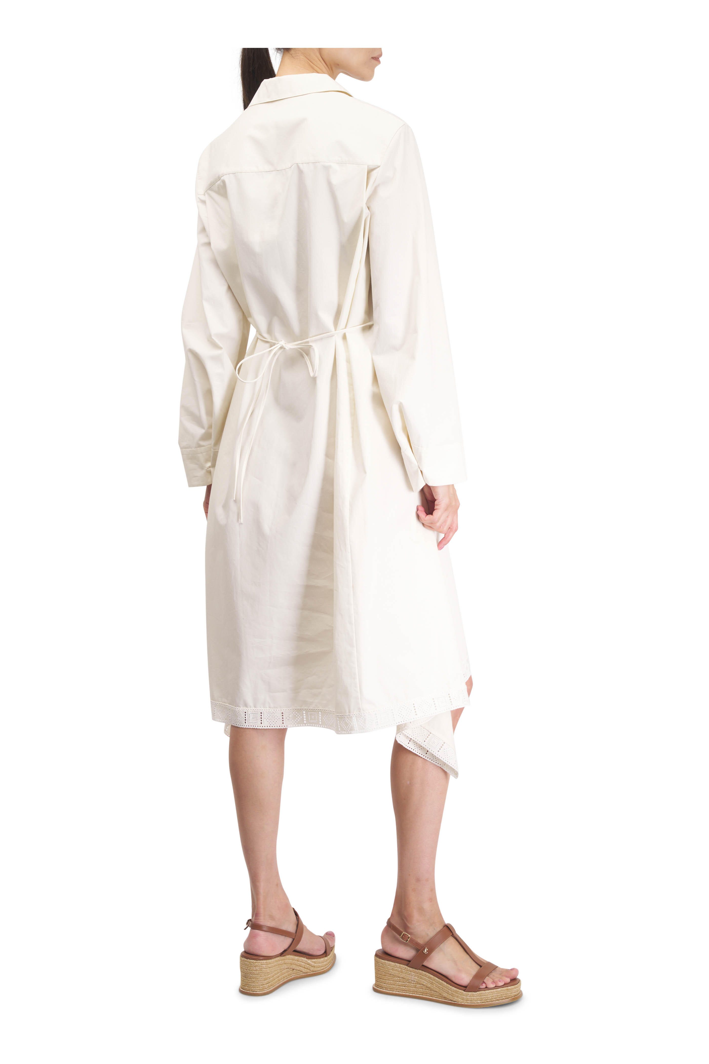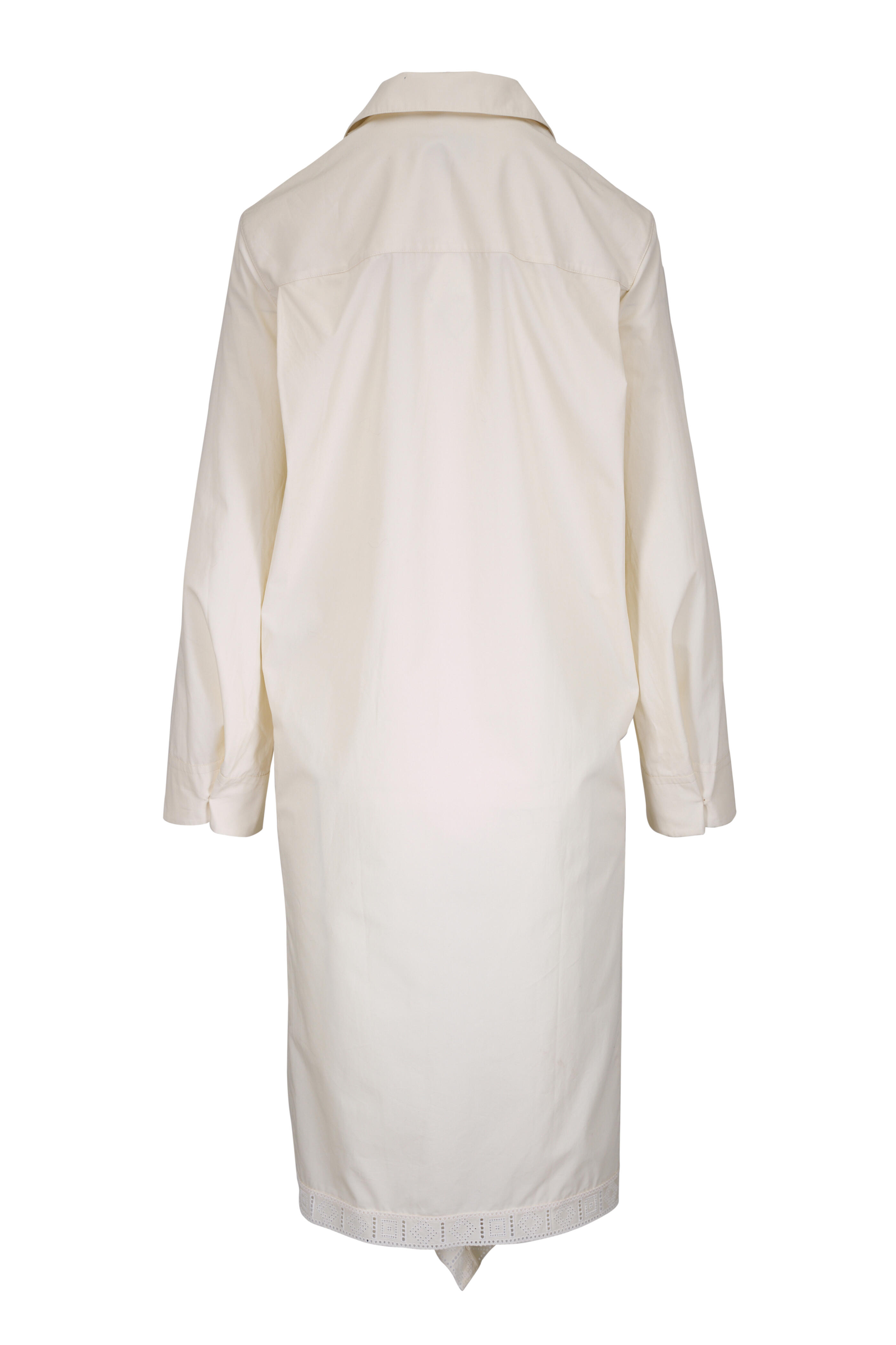Spread collar. V-neckline. Front button placket. Handkerchief skirt hem; embroidered trim. Square hidden cuffs. Internal waist tie. Made in Italy. 42" shoulder to hem. 100% cotton. Dry clean.