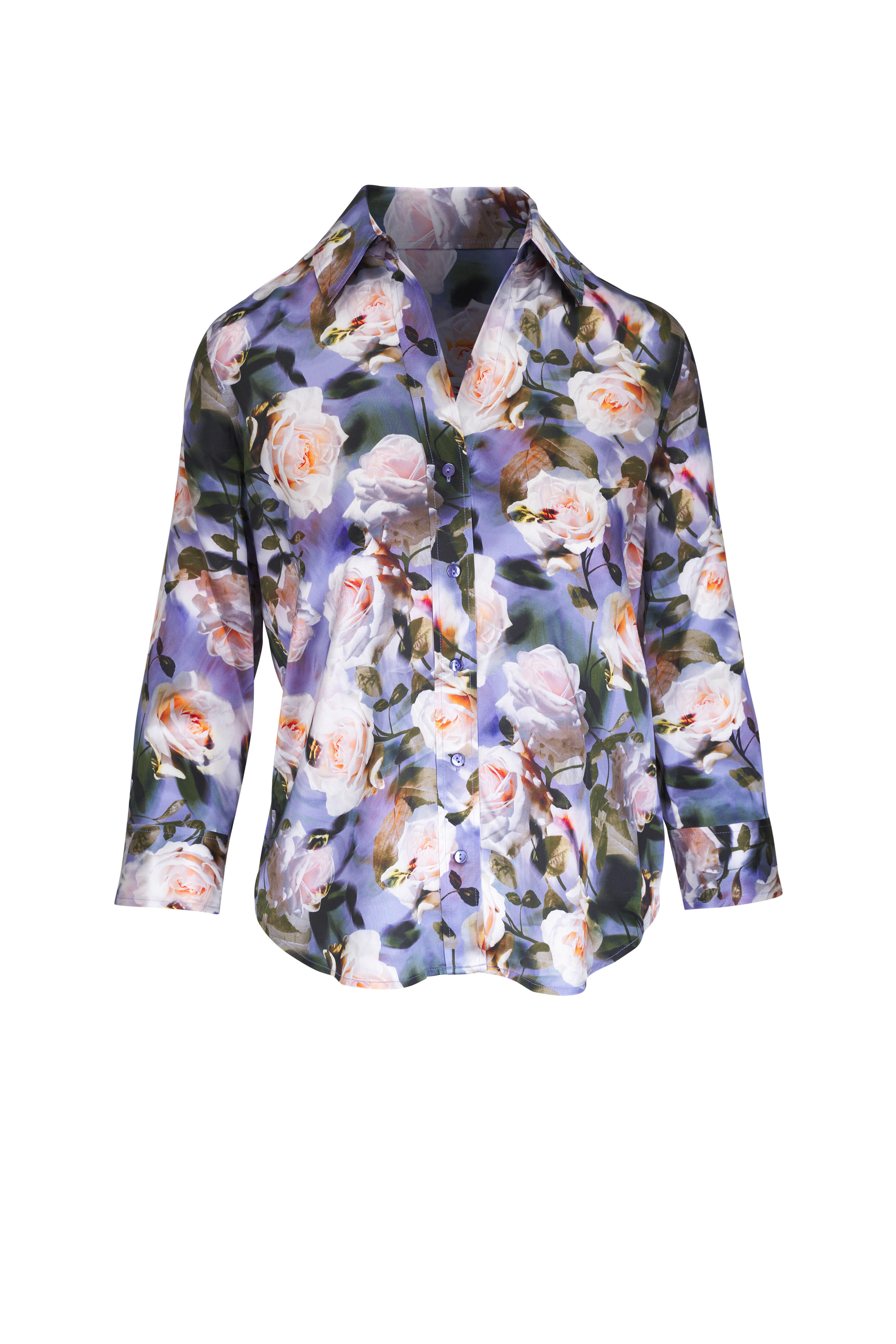 Point collar. Button front. Double button cuffs; three-quarter sleeves. Imported. 100% silk. Dry clean.
