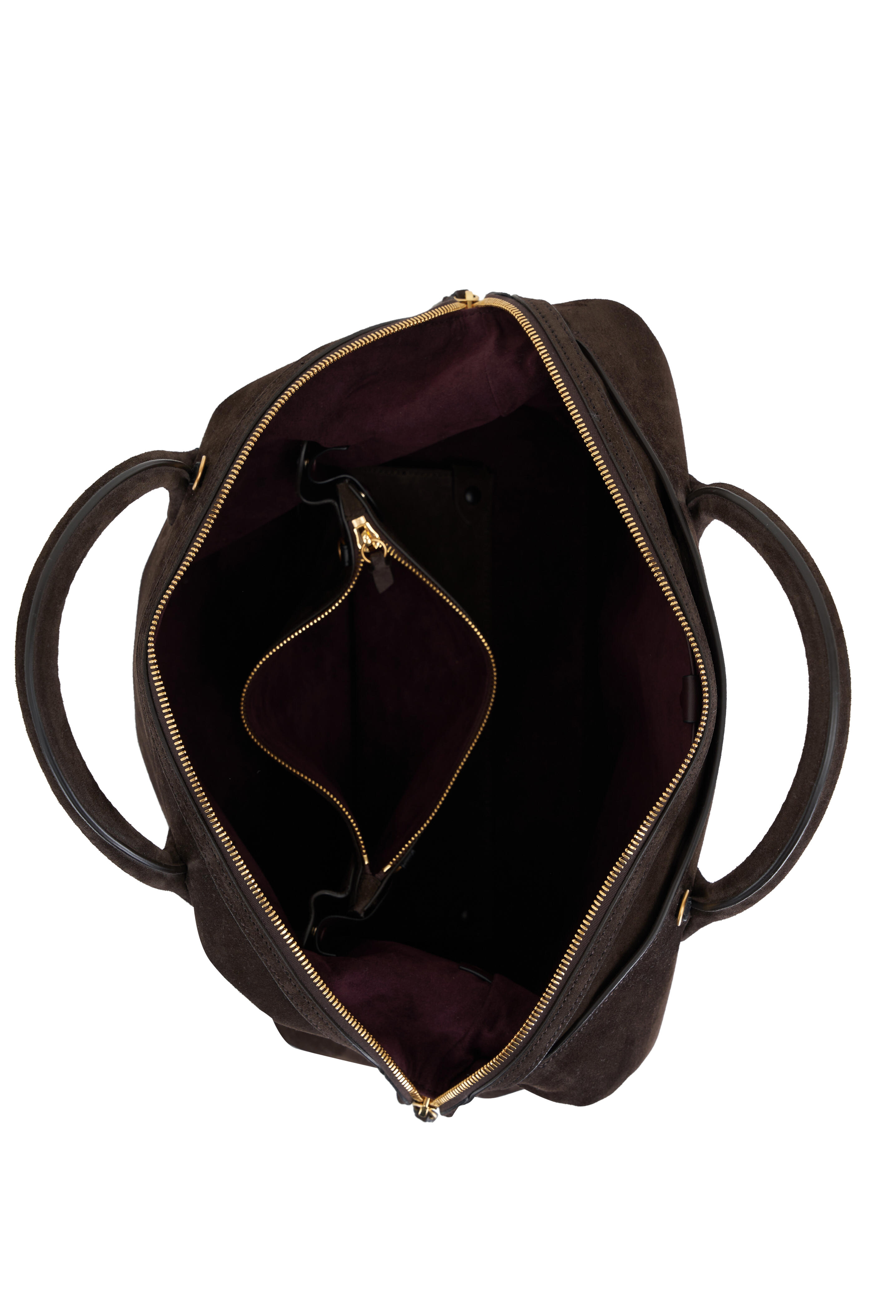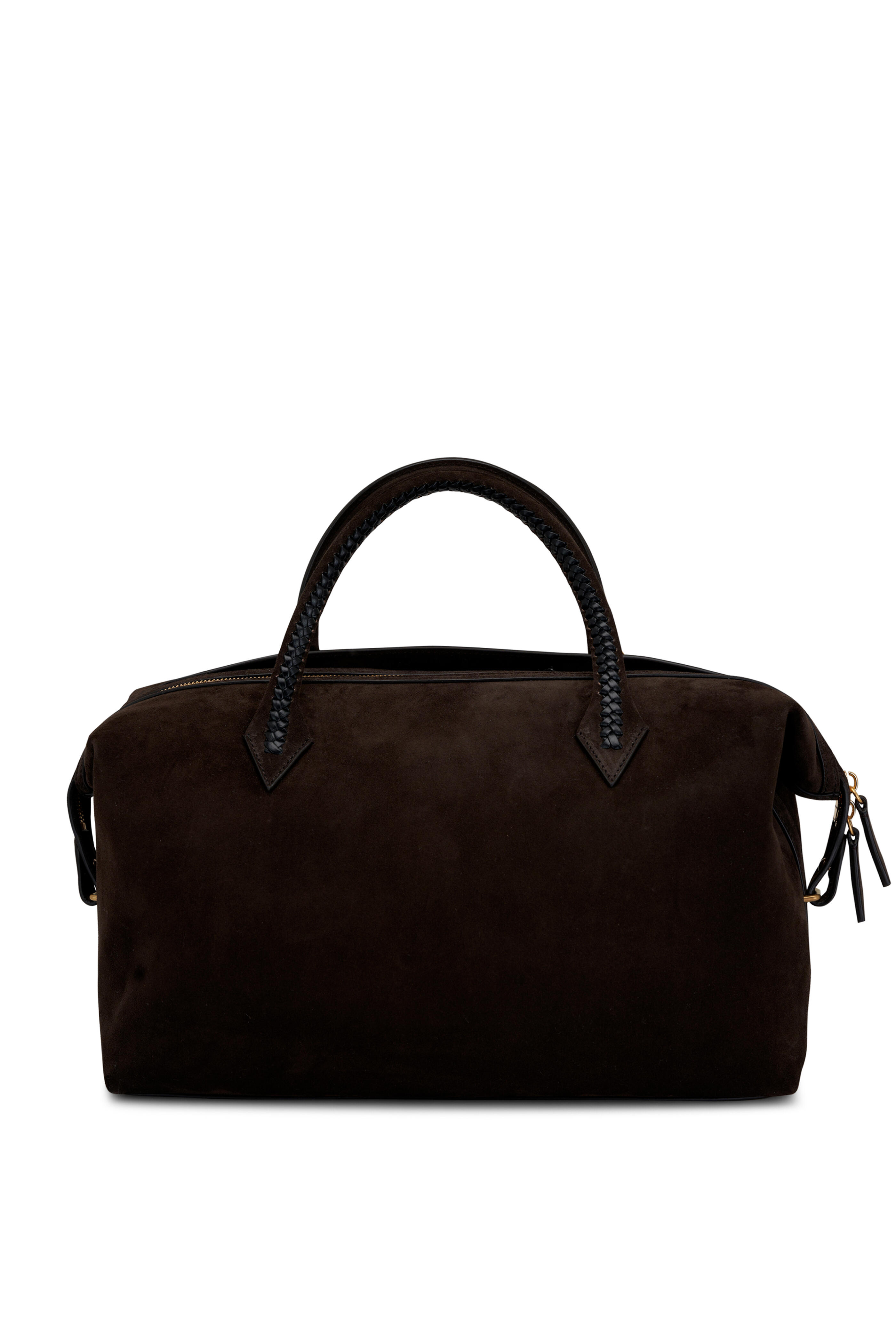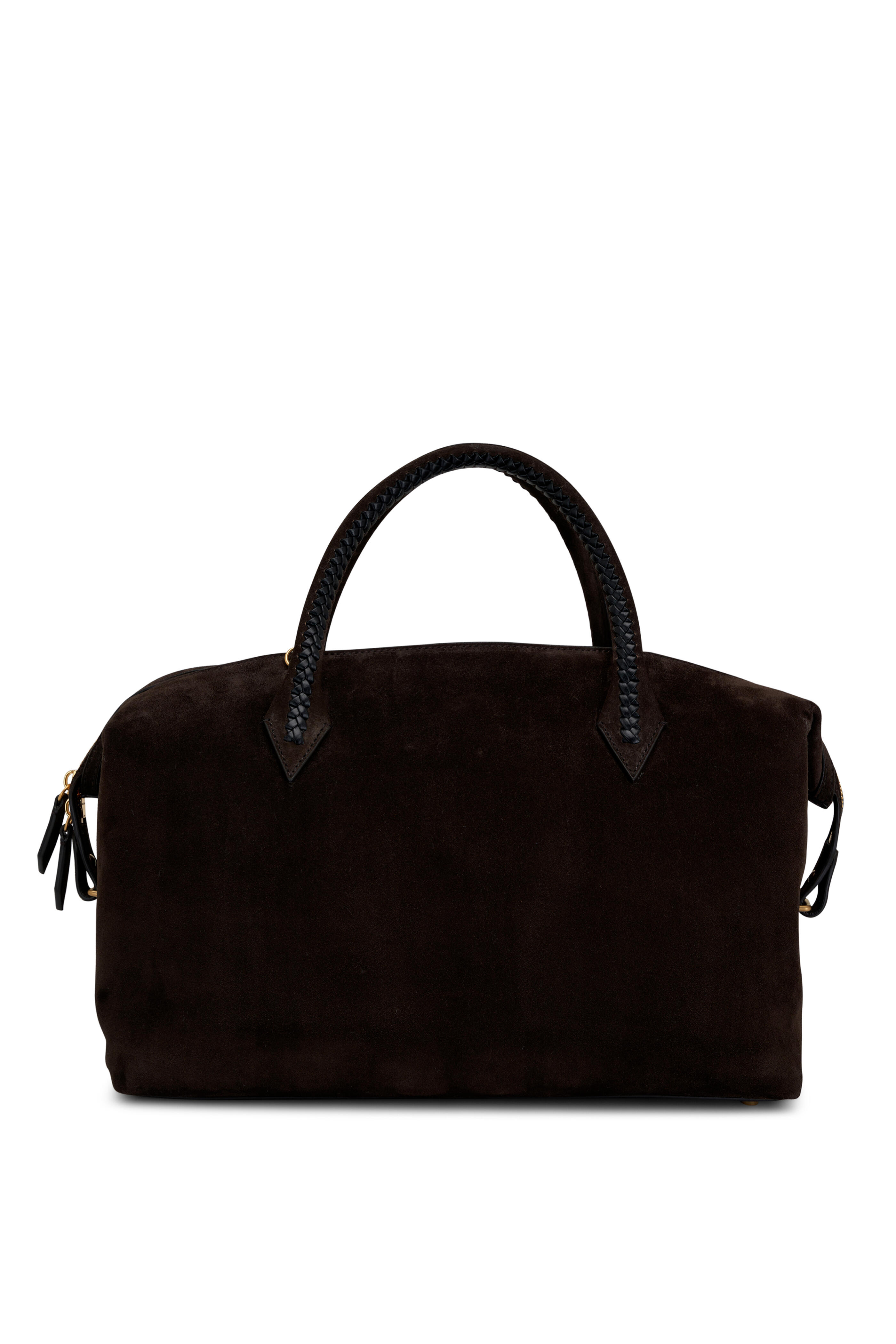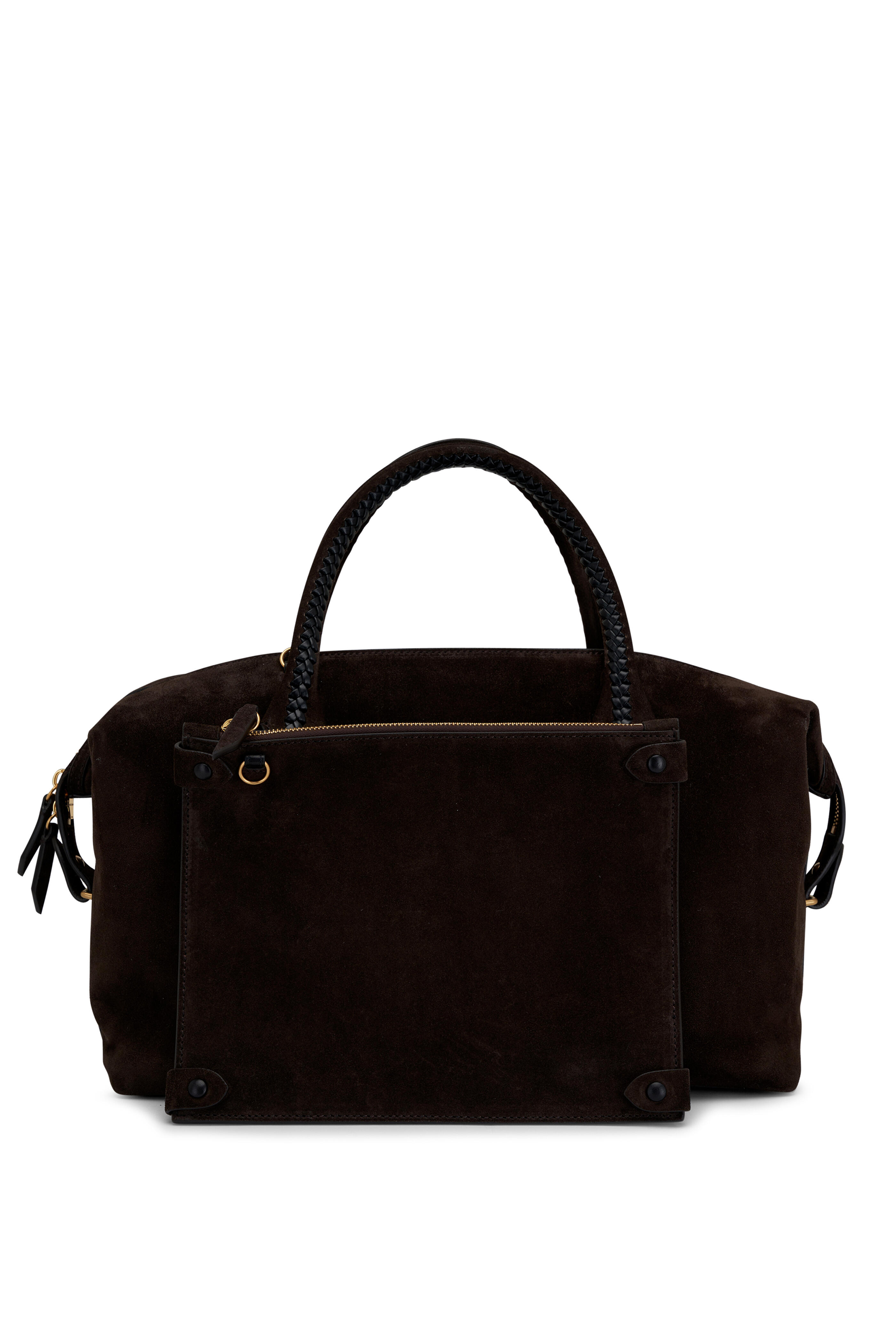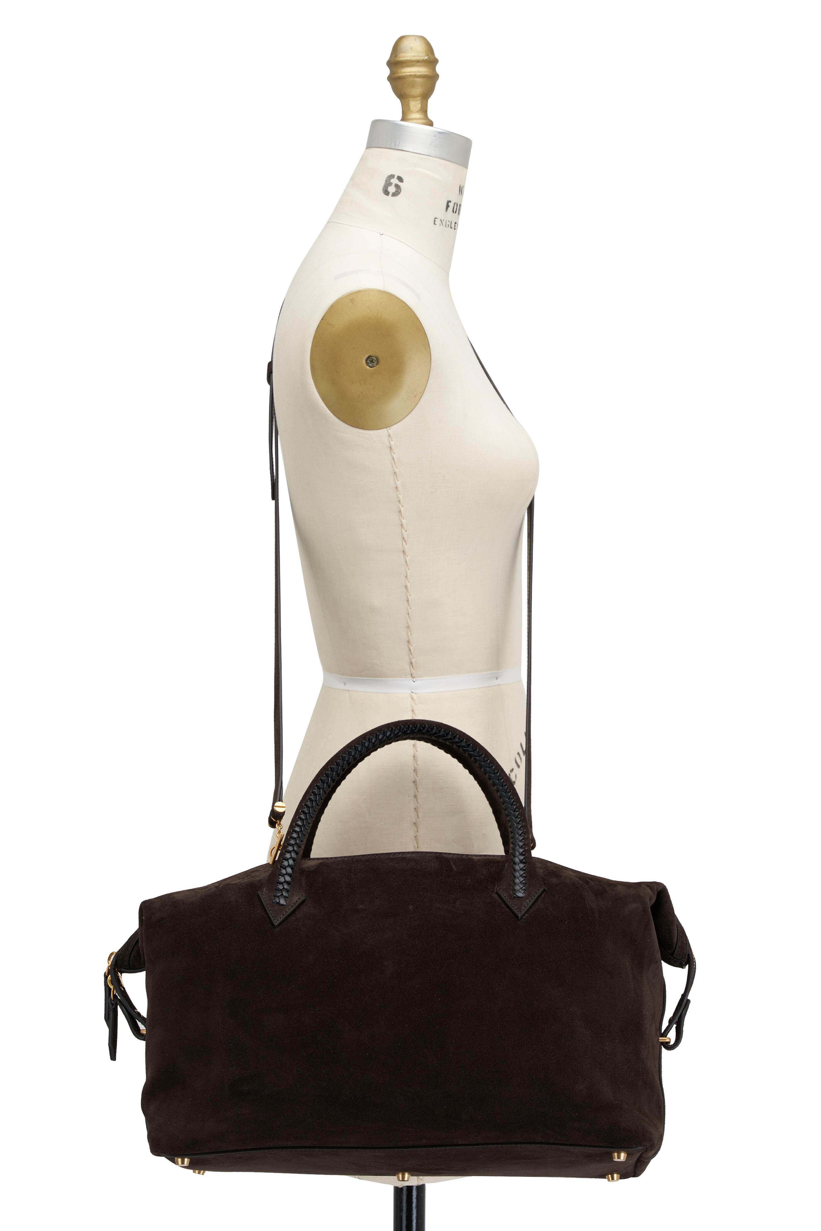 Italian suede. Hand braided leather handles; detachable and adjustable crossbody strap. Exterior hidden magnetic pocket. Interior zip pocket and snap pockets. Snap-out interior zippered pouch that converts to a crossbody bag. Fits up to a 13" laptop. Made in Italy. Width 14.6". Depth 6.5". Height 10.4" expanded / 8.2" collapsed. Handle Drop 5.5". Compatible with the Stowaway (sold separately).